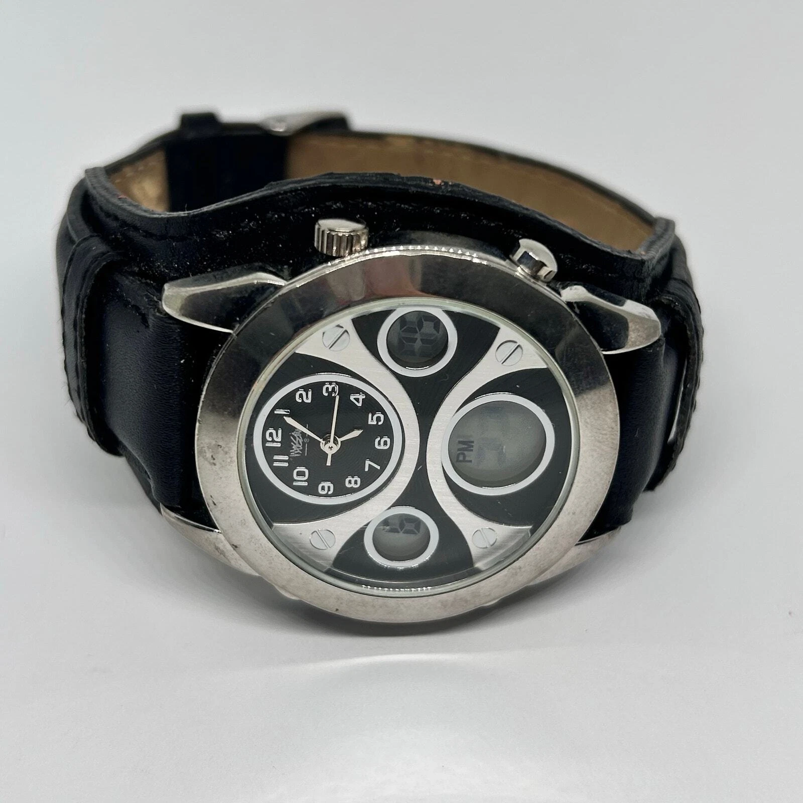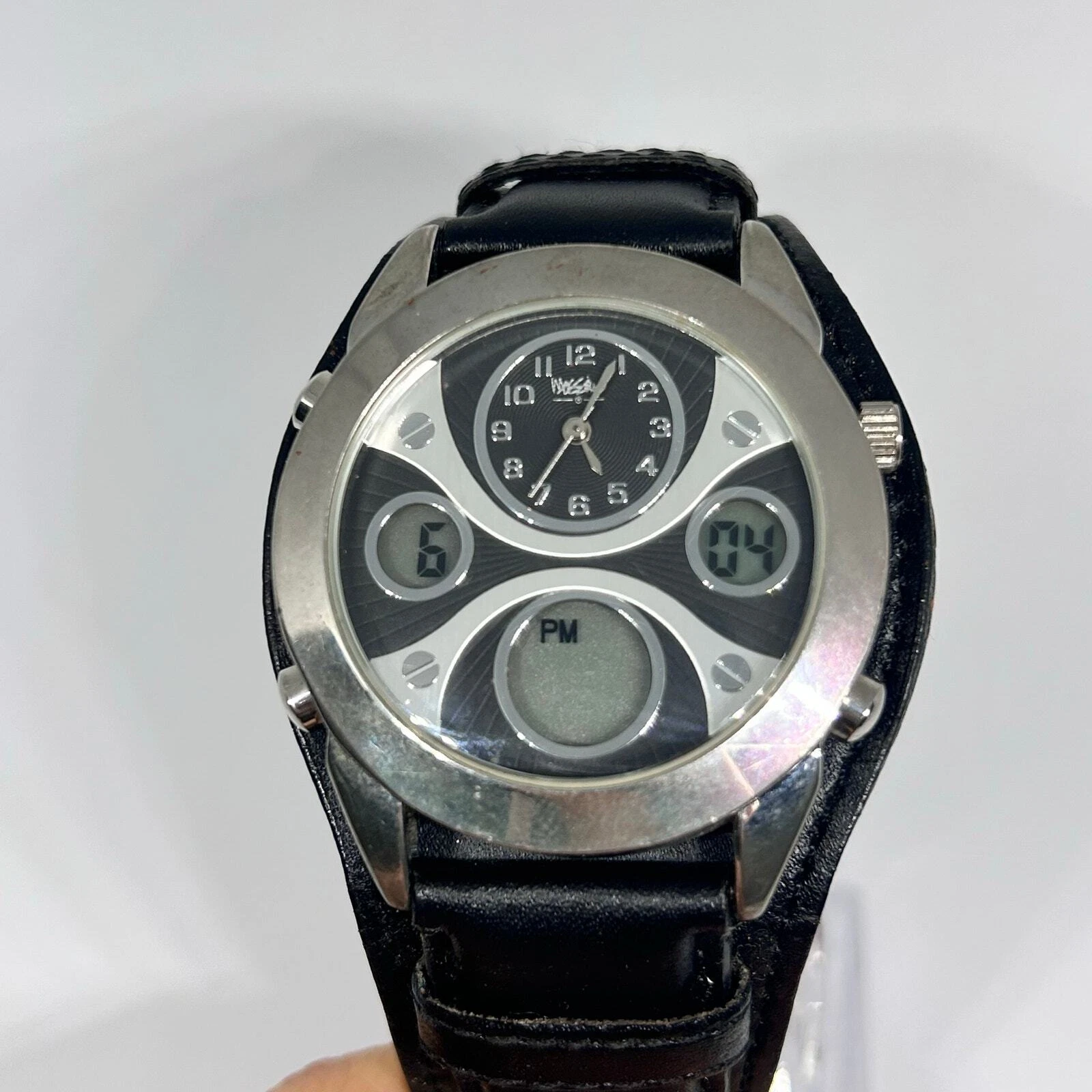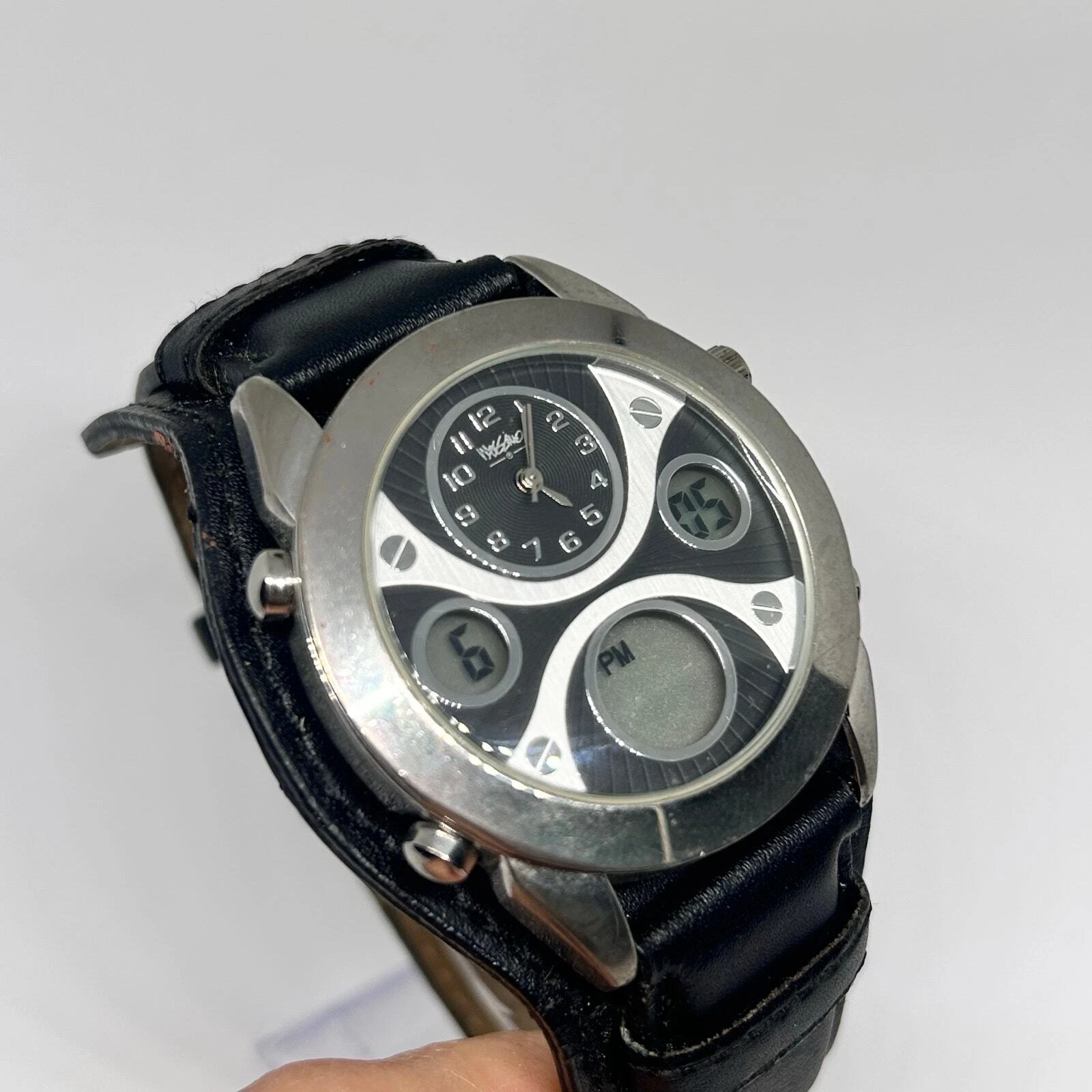 Mossimo Silver Tone Black Genuine Leather Men’s Watch New Battery