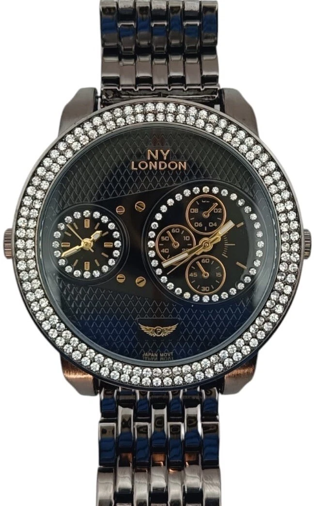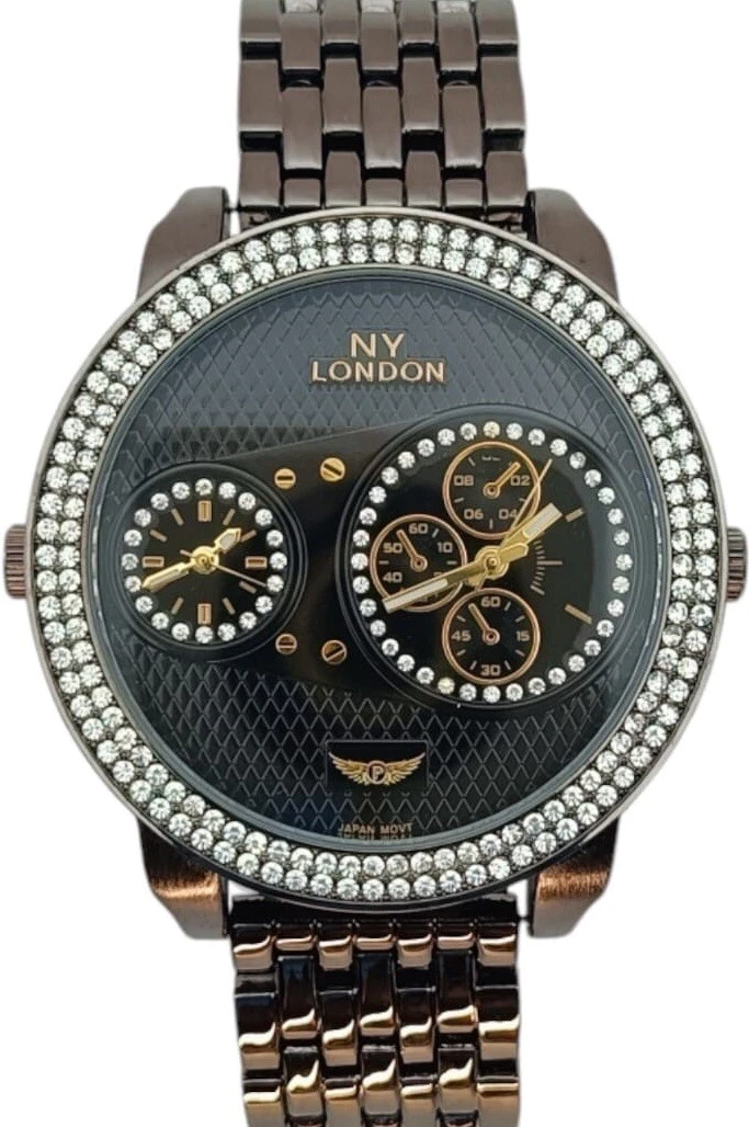 NY London Men's Dual Time Zones Watch Fashion Dress Diamond Black Analog Quartz.