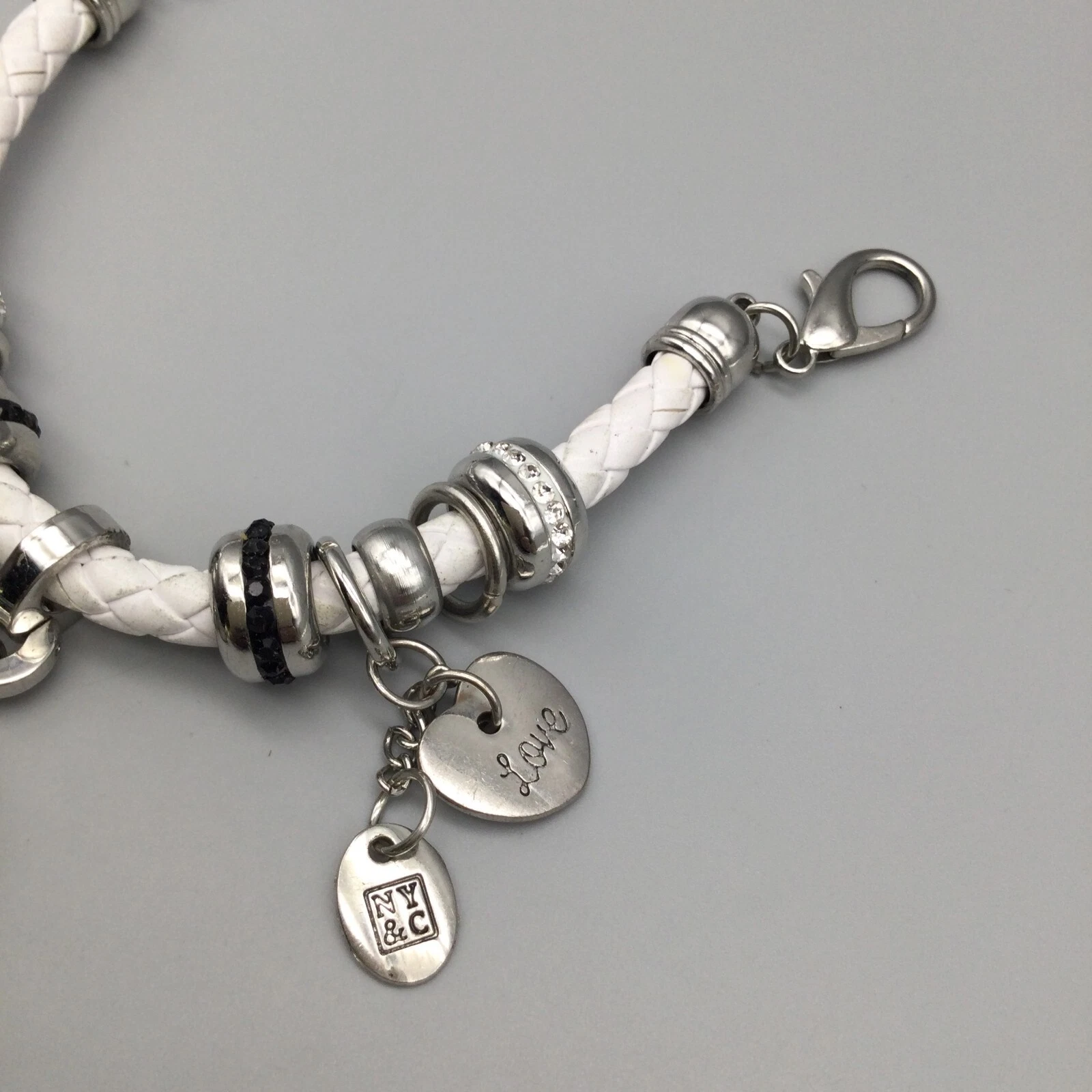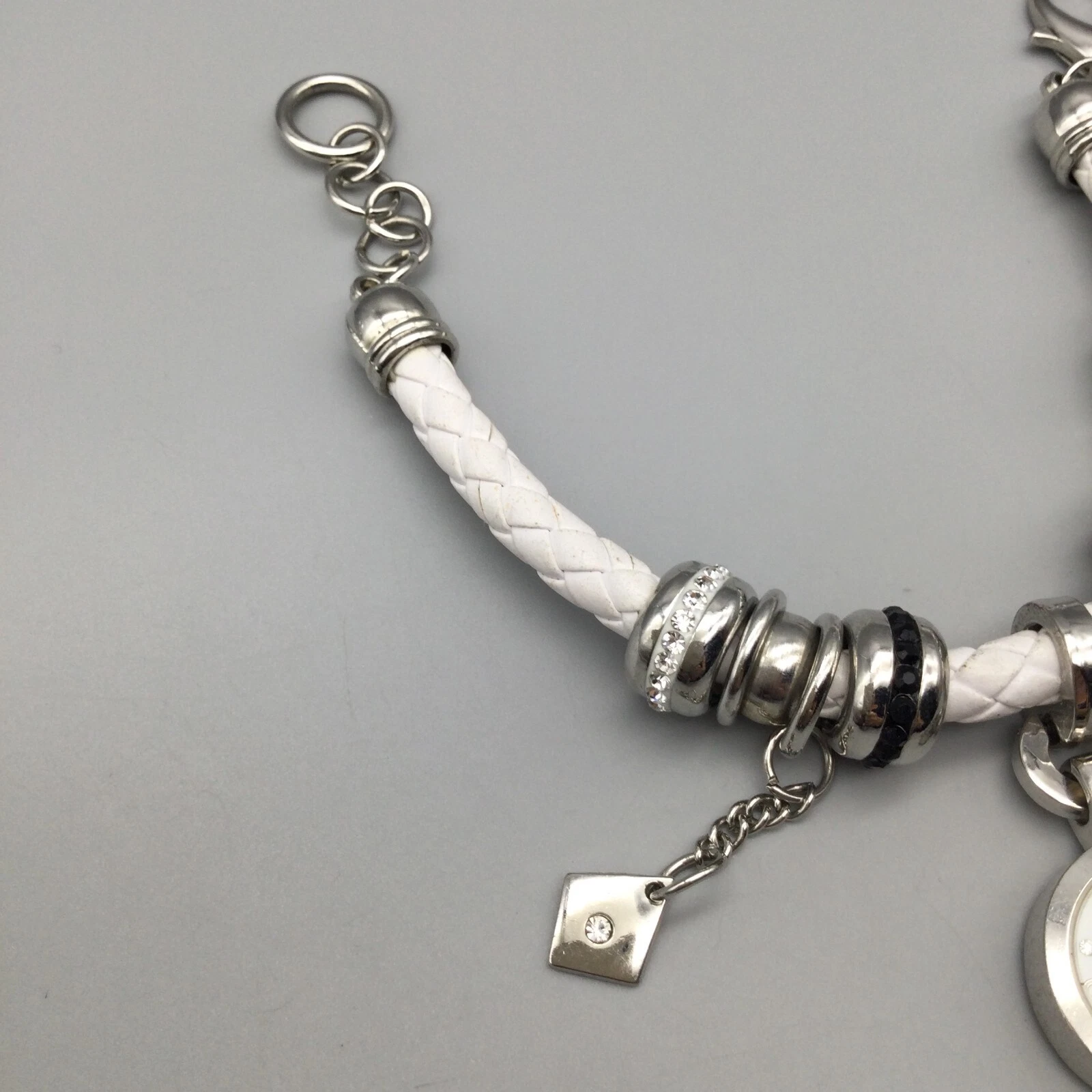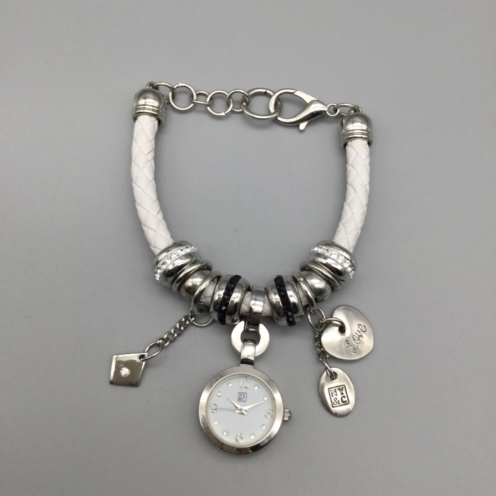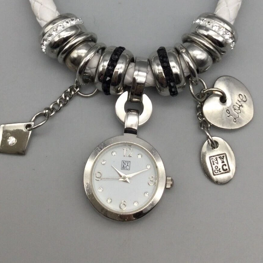 NY&C Watch Women 21mm Silver Tone White Charm Bracelet Band New Battery 8"
