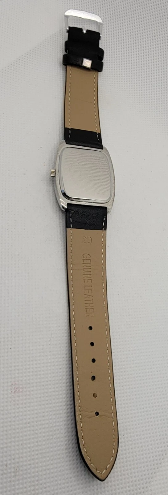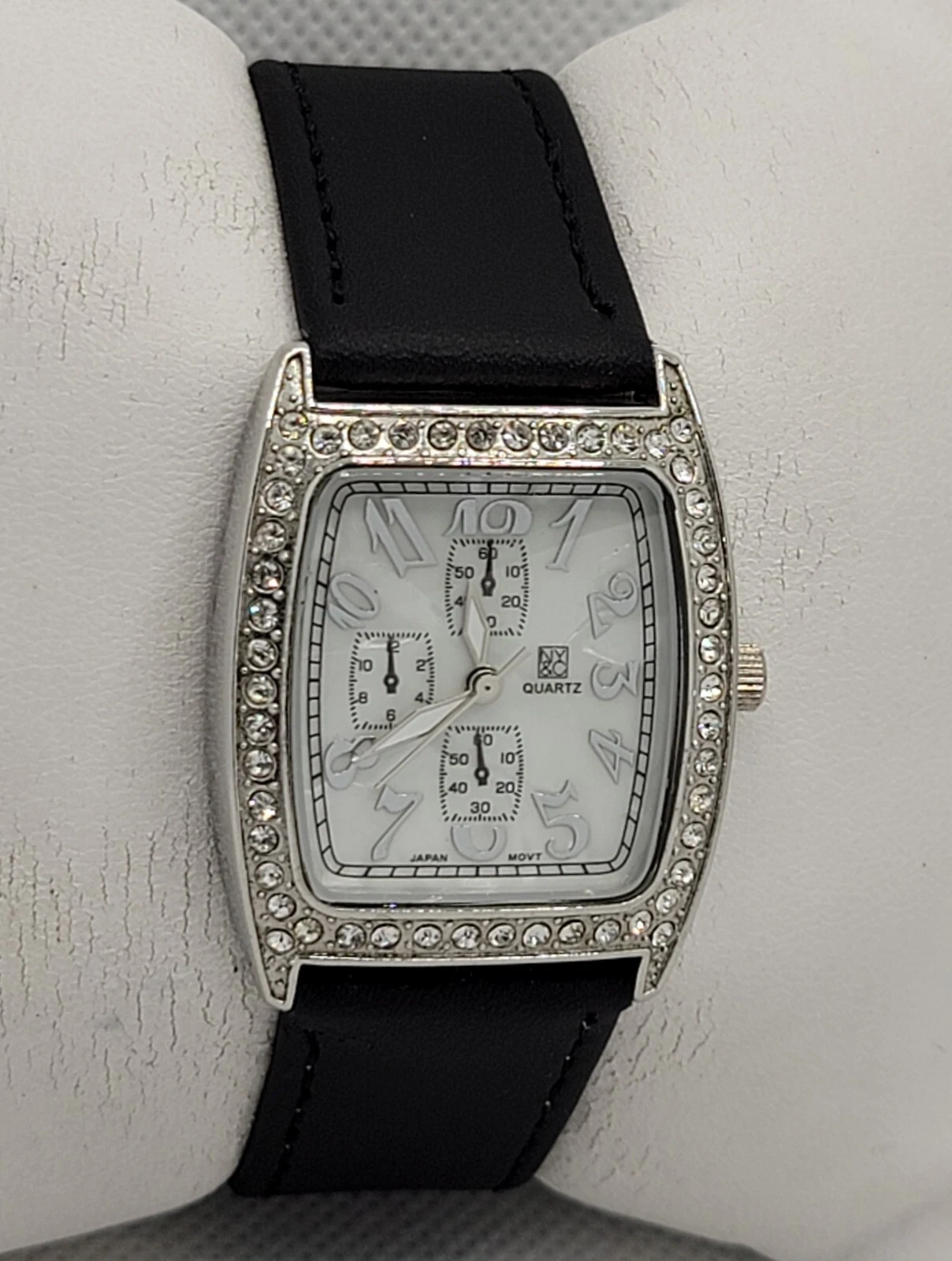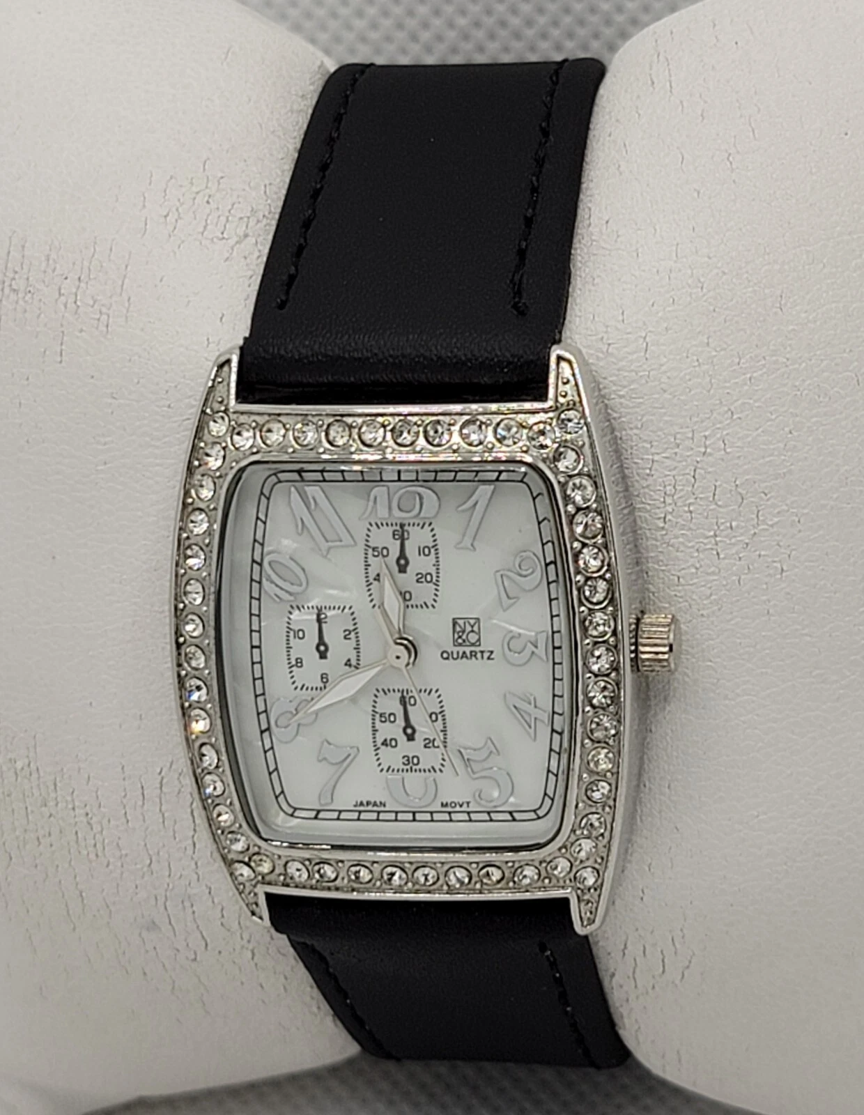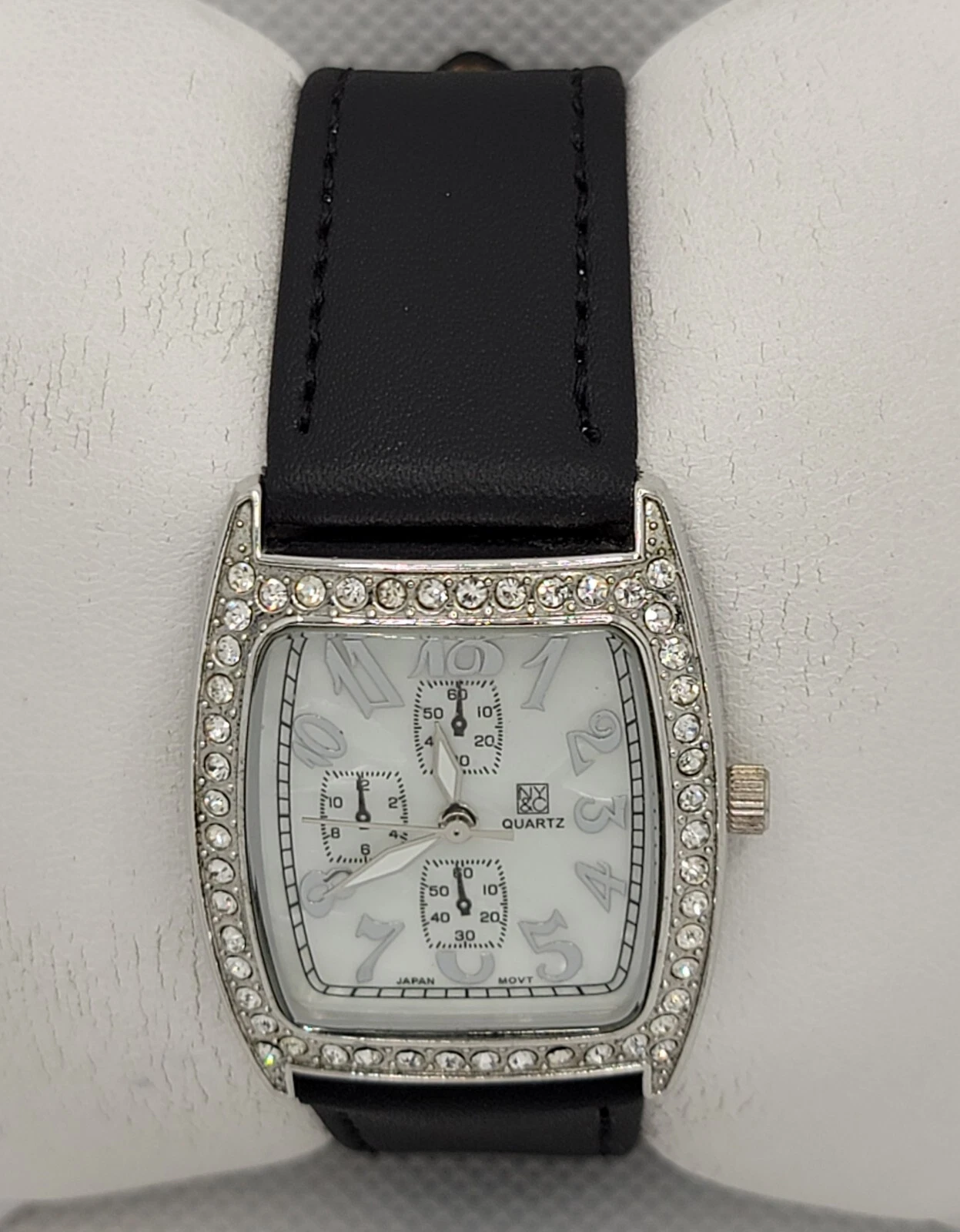 Ladies NY&C Stylish Paved Tank Silver Tone Black Leather Band Analog Watch K7