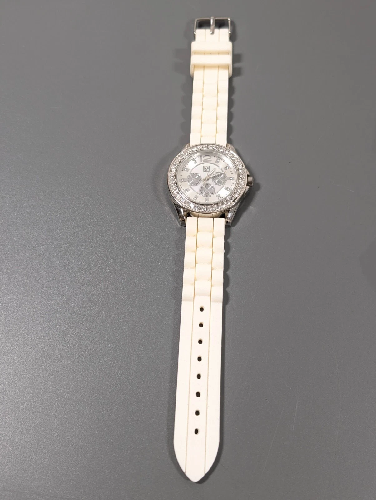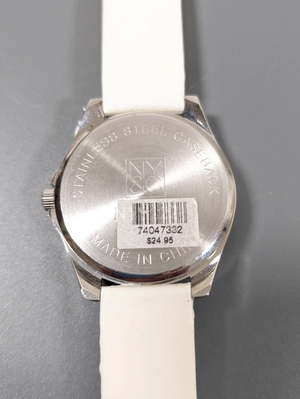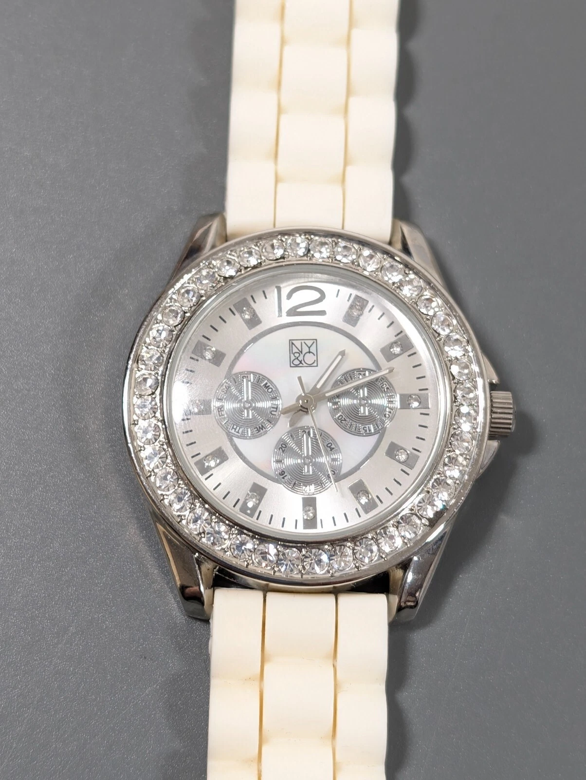 NY&C Crystal White Jelly Watch Rubber Silicone Band Silver Tone Faux Chrono