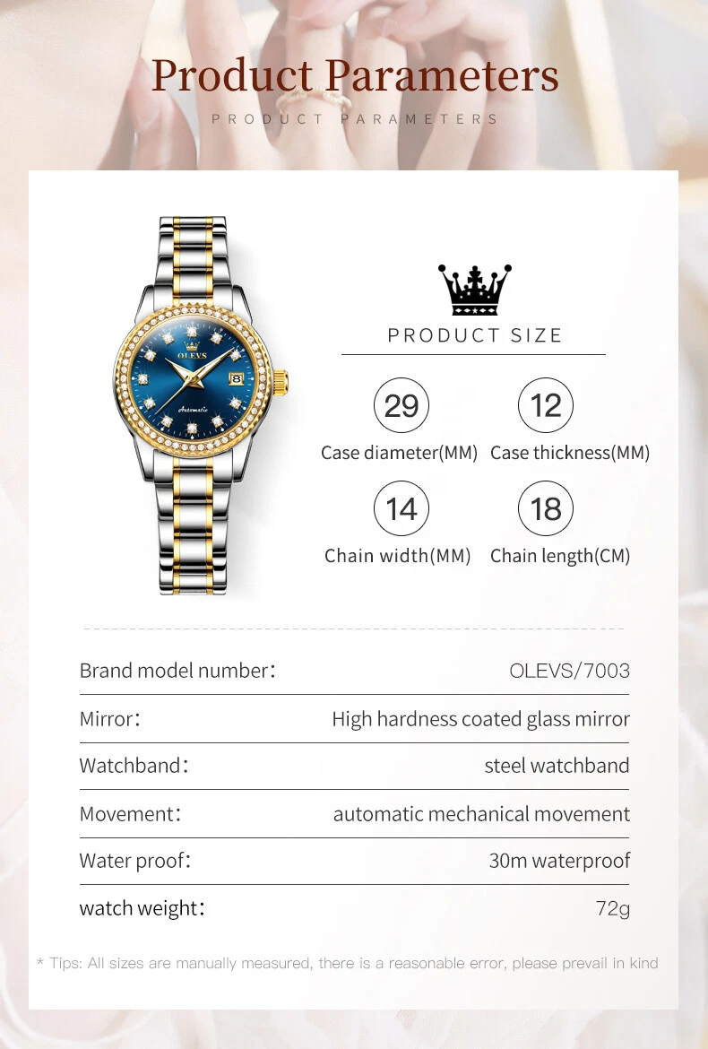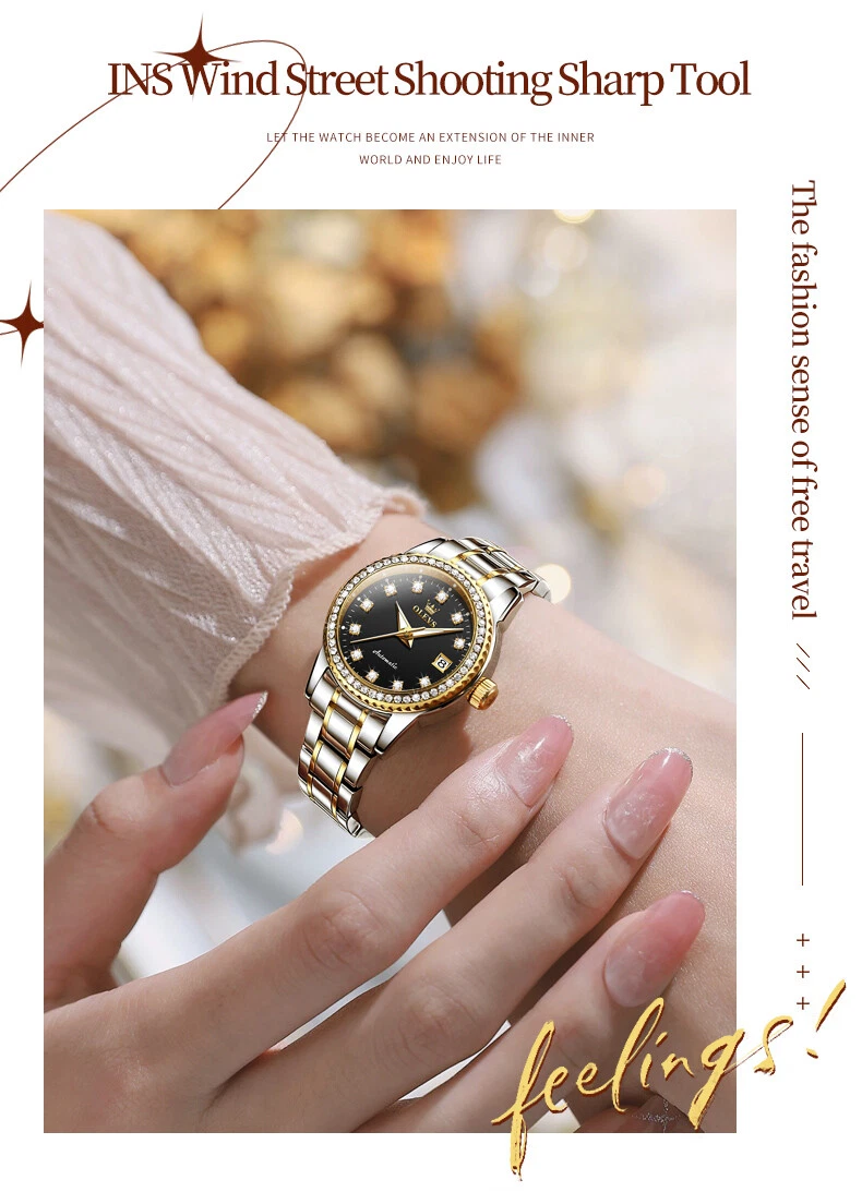 Women's Watch Steel Band Automatic Mechanical Watch Waterproof Date Rhinestone