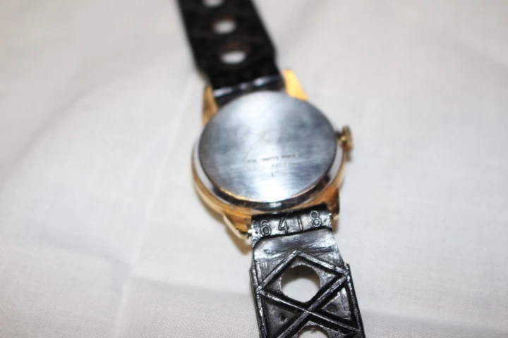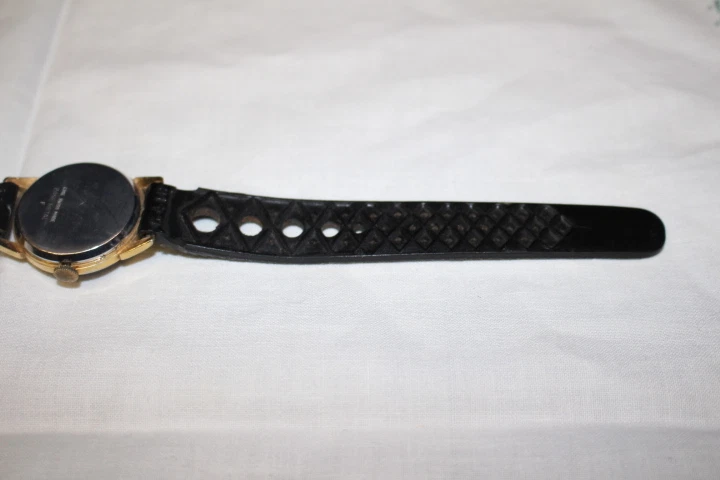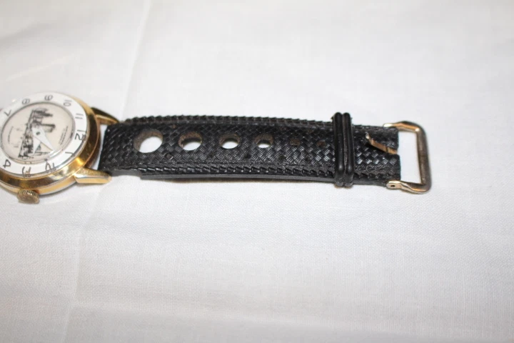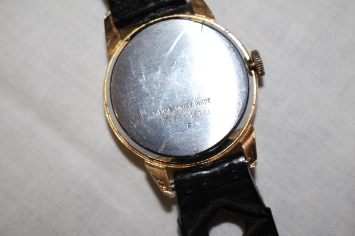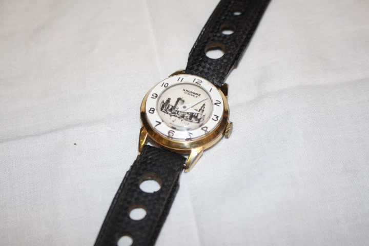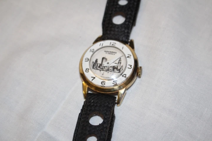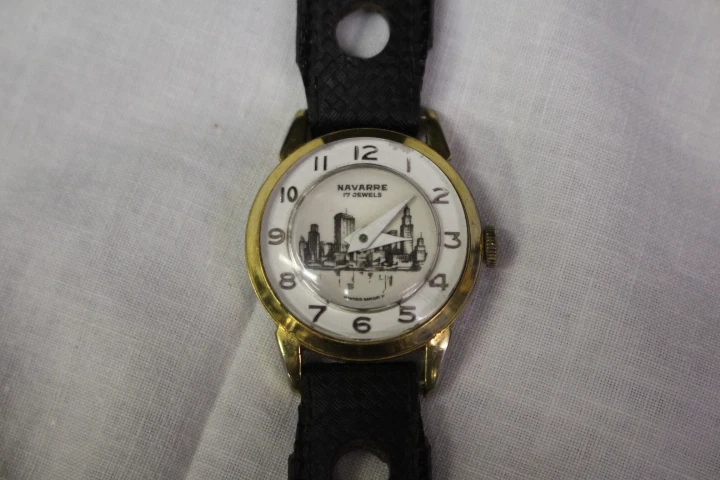 Mens Gold Tone NAVARRE 17 Jewels Swiss Mechanical Wind Wristwatch w/City Skyline