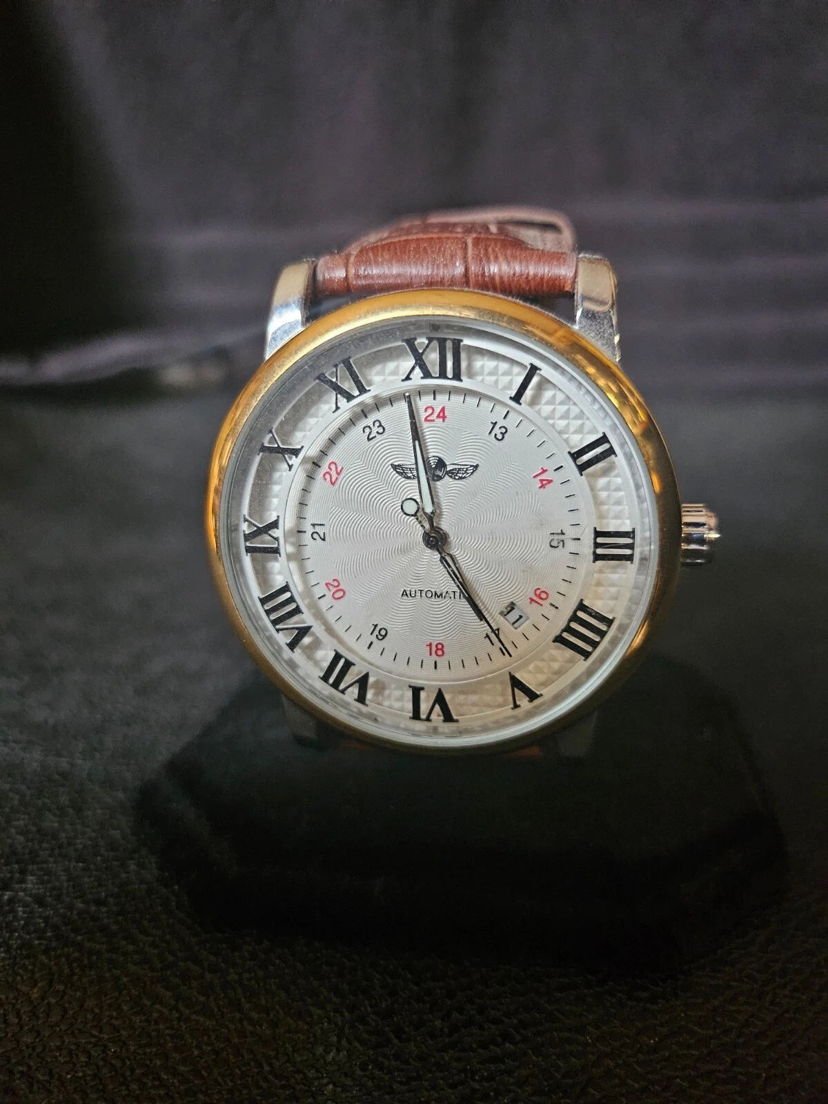 Mens Watch Automatic Brown Faux Leather Band Self Winding Roman Numberals Design