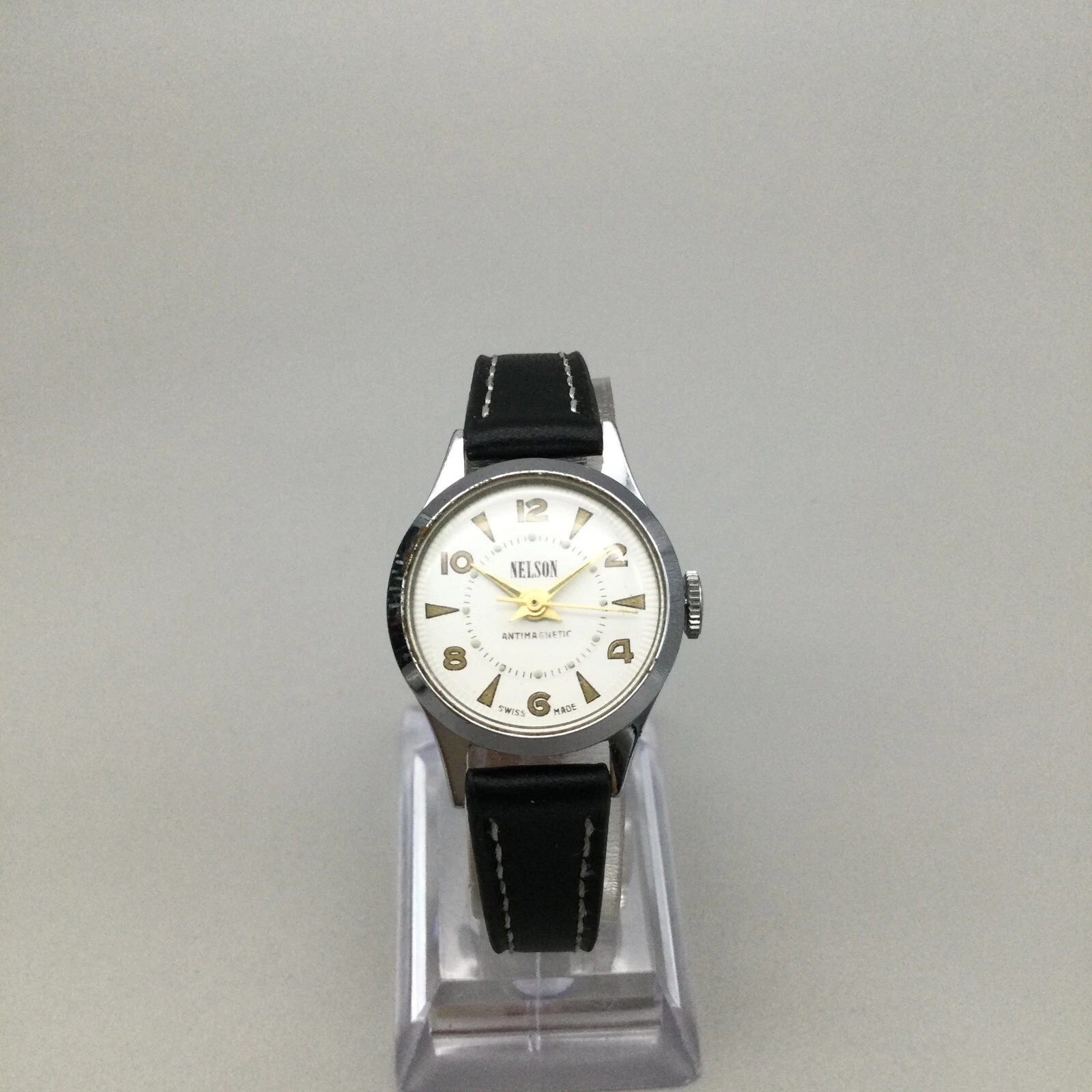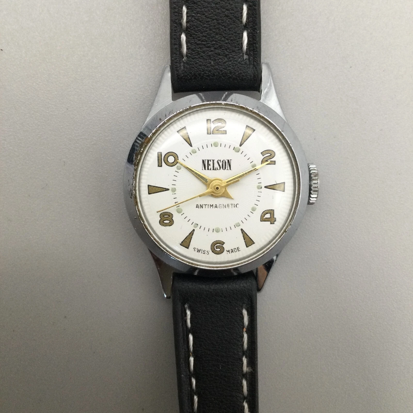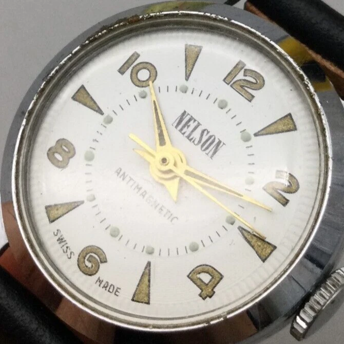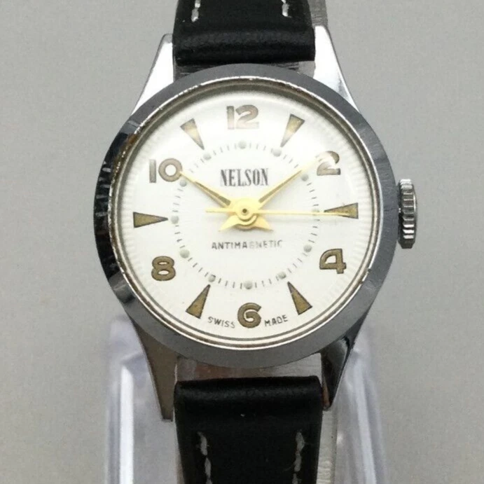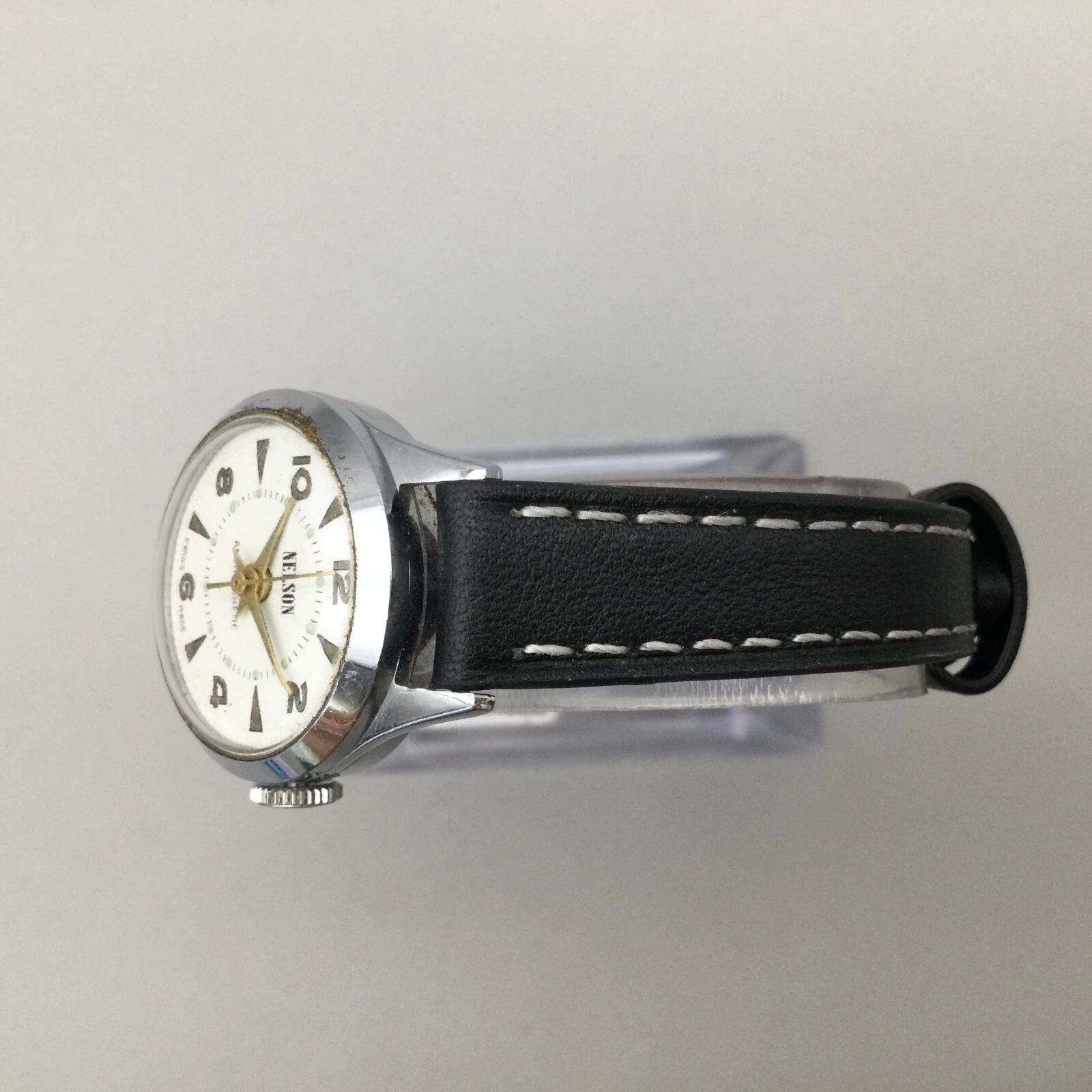 Vtg Nelson Watch Women 26mm Silver Tone Swiss Made Leather Band Manual Wind