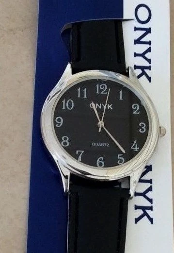 Onyk Men's Silver Watch Round Black Dial Silver Number Hours Black Leather Band!