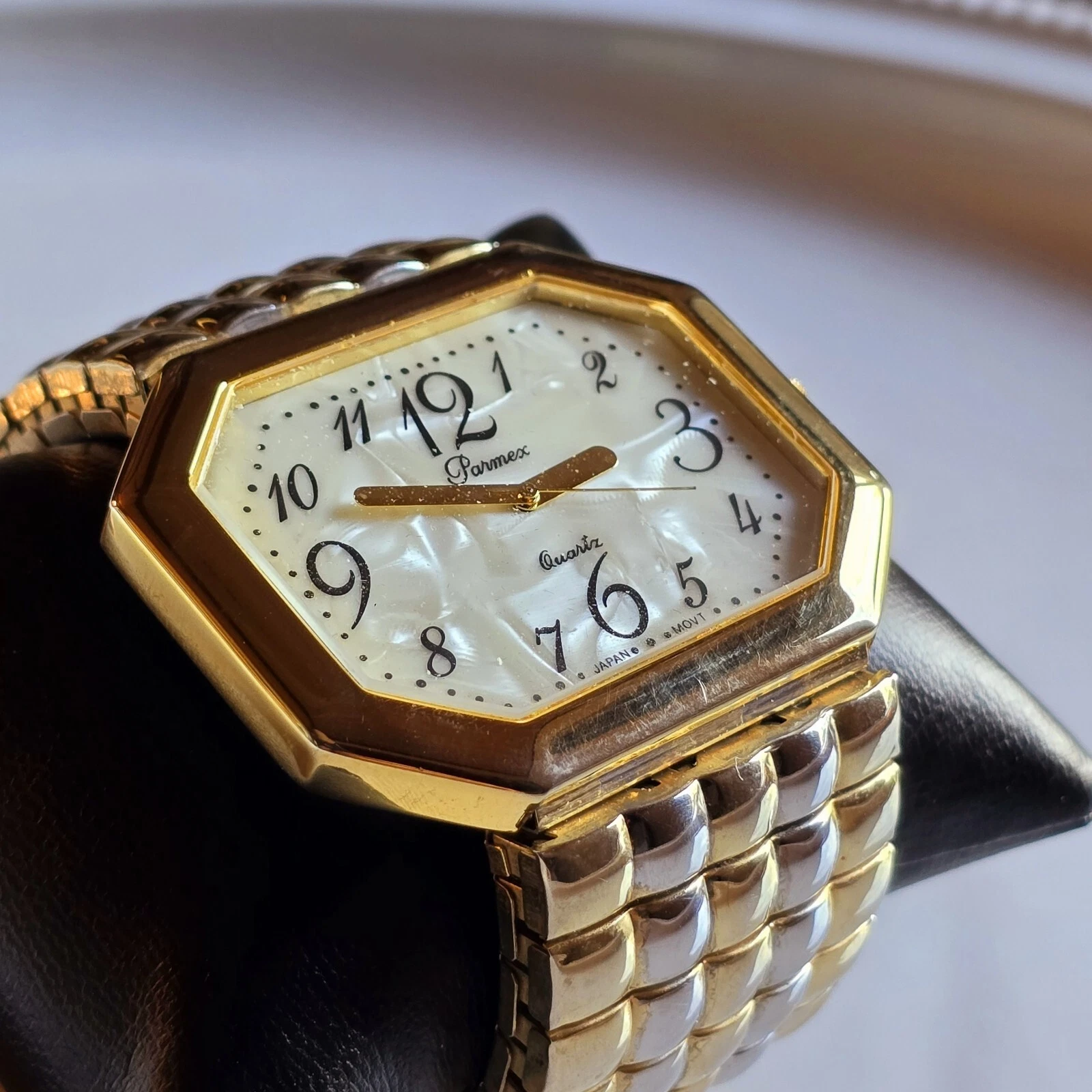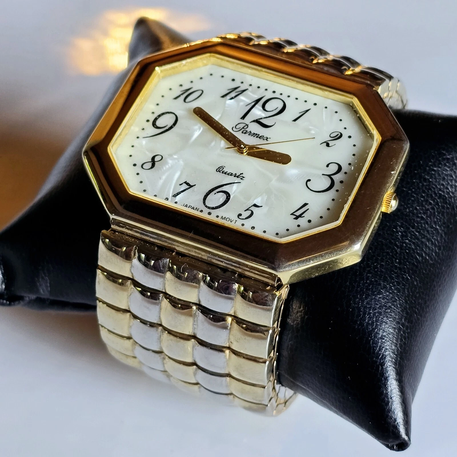 Vintage Chunky Parmex Gold Tone Watch Stretch Band with New Battery