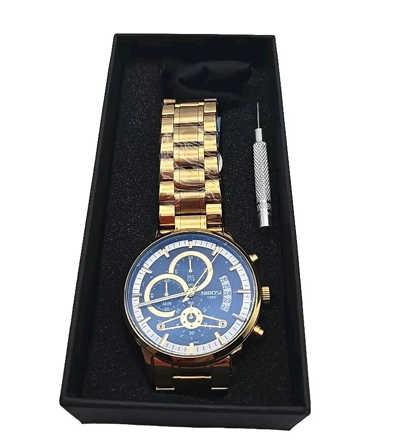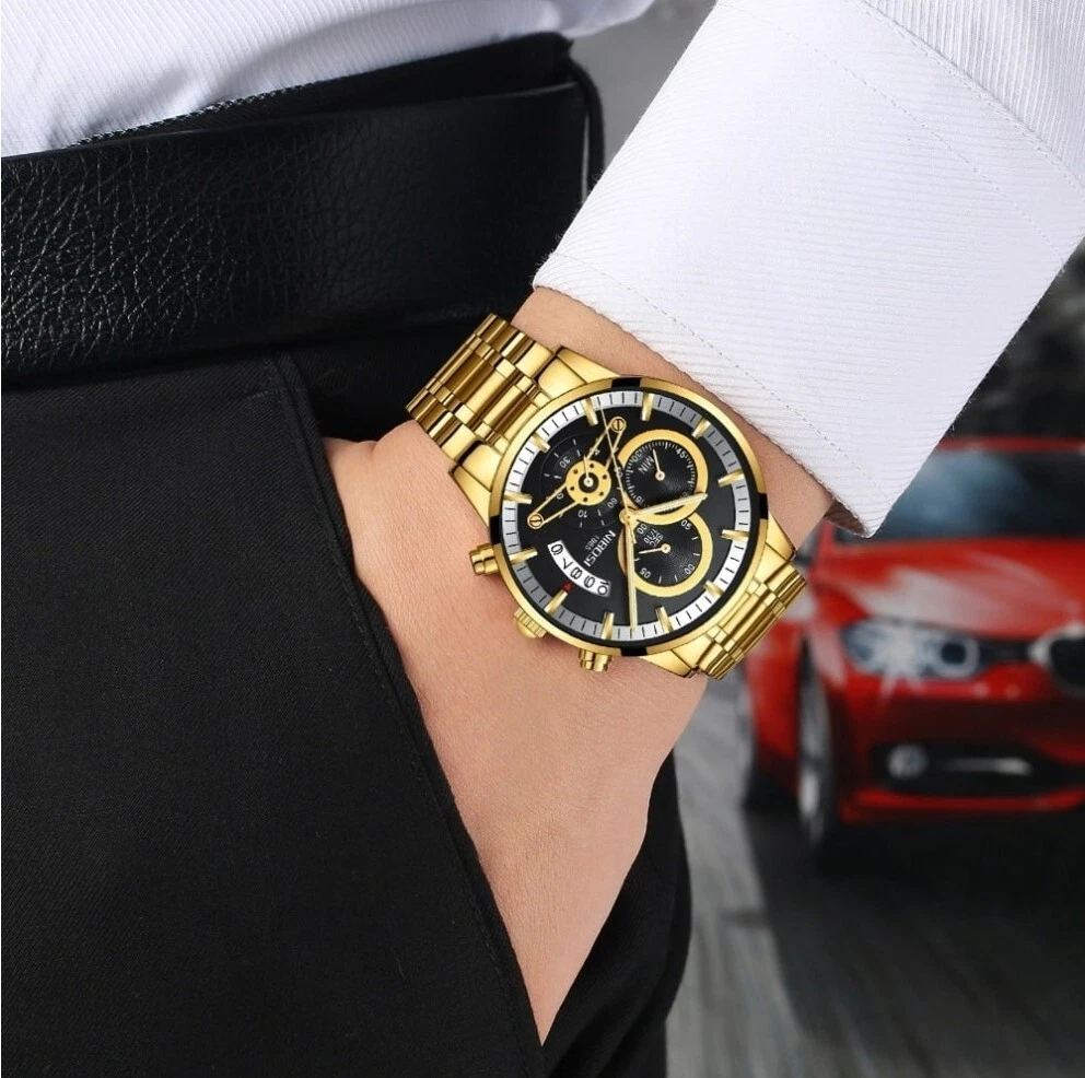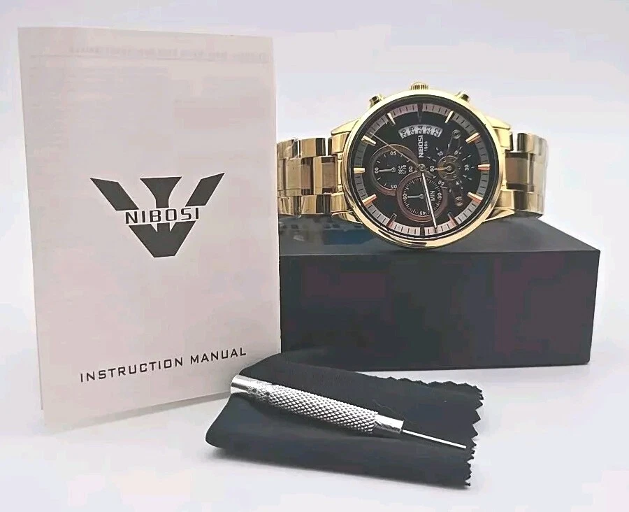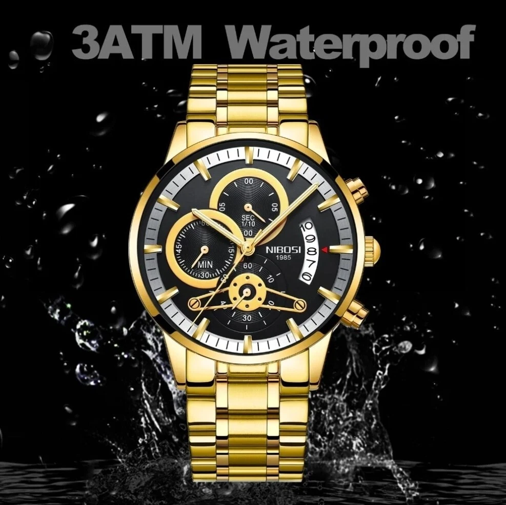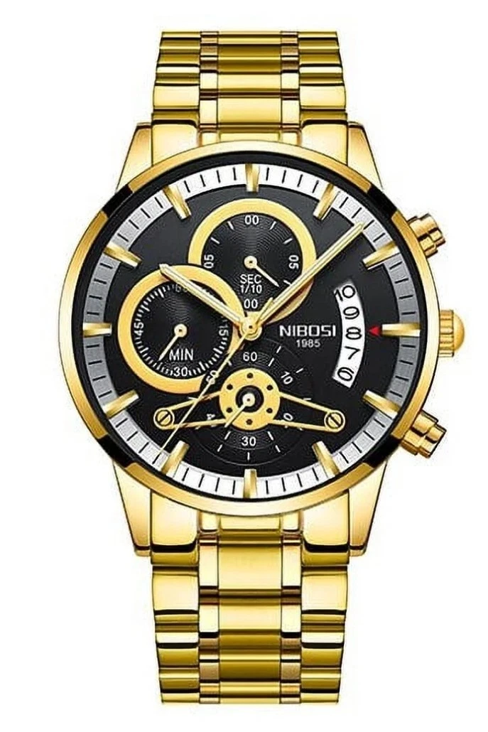 NIBOSI Men's Gold/Black Color Watch Chronograph Waterproof 30M Full Steel Quartz