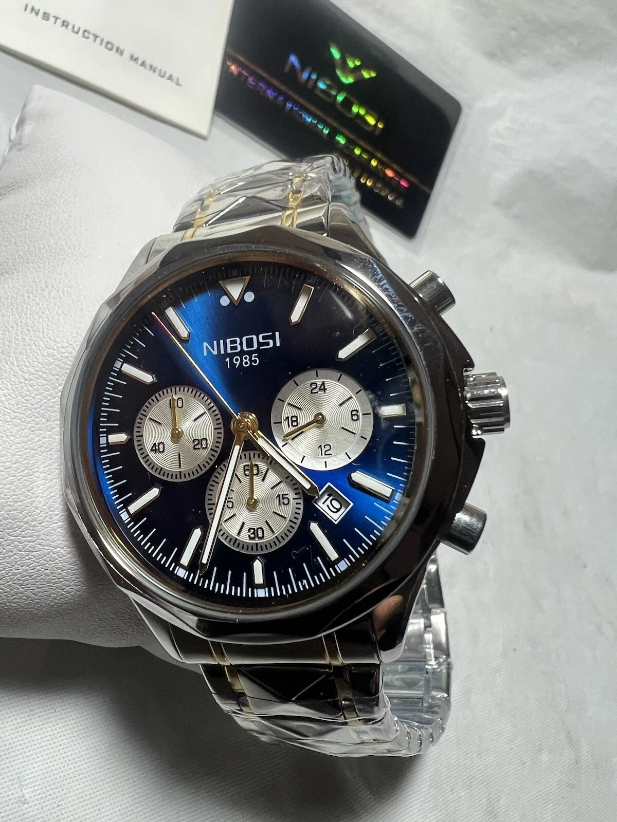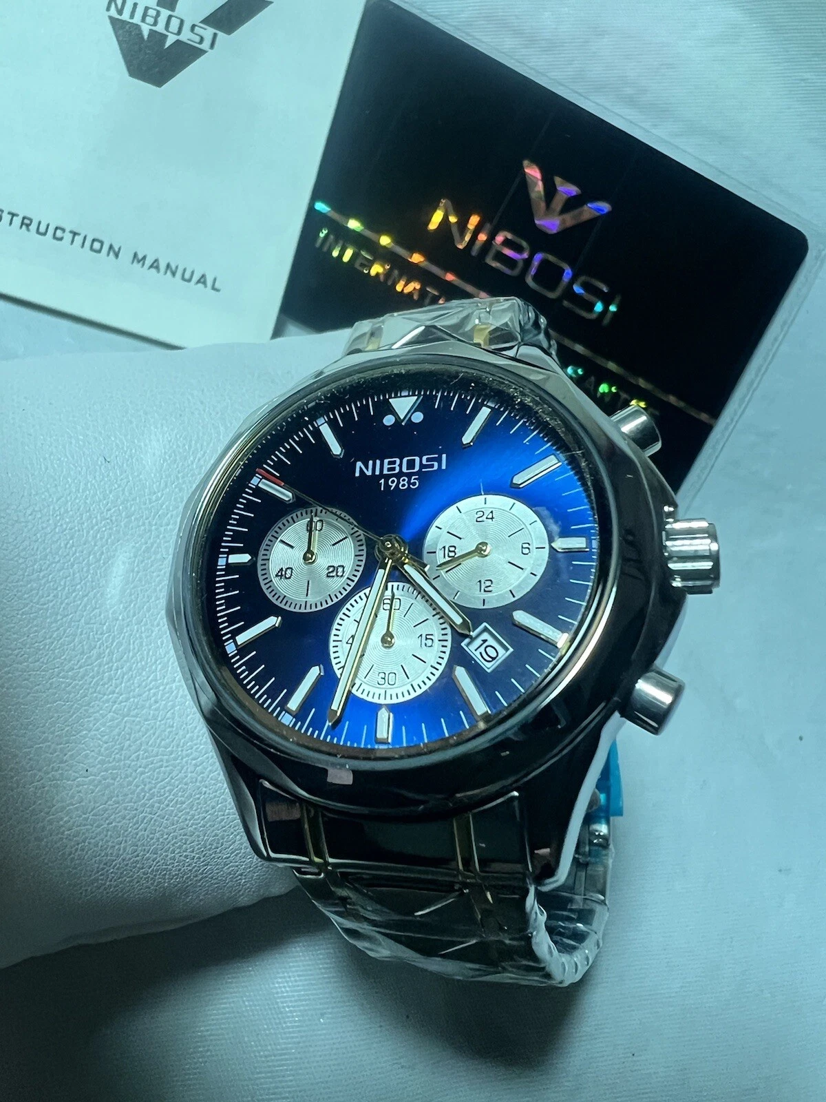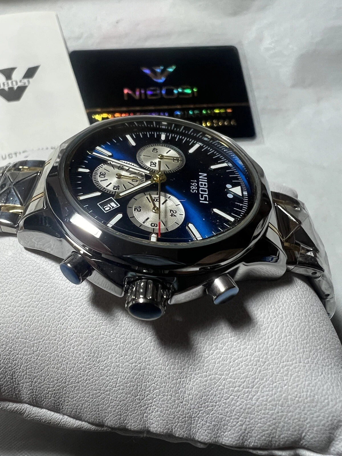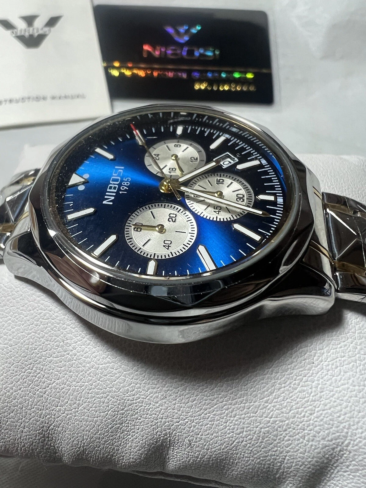 NIBOSI, chronograph date, Beautiful Navy Blue, stainless Steel,44mm,N12608,mens