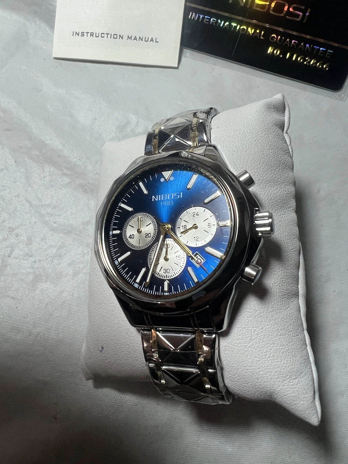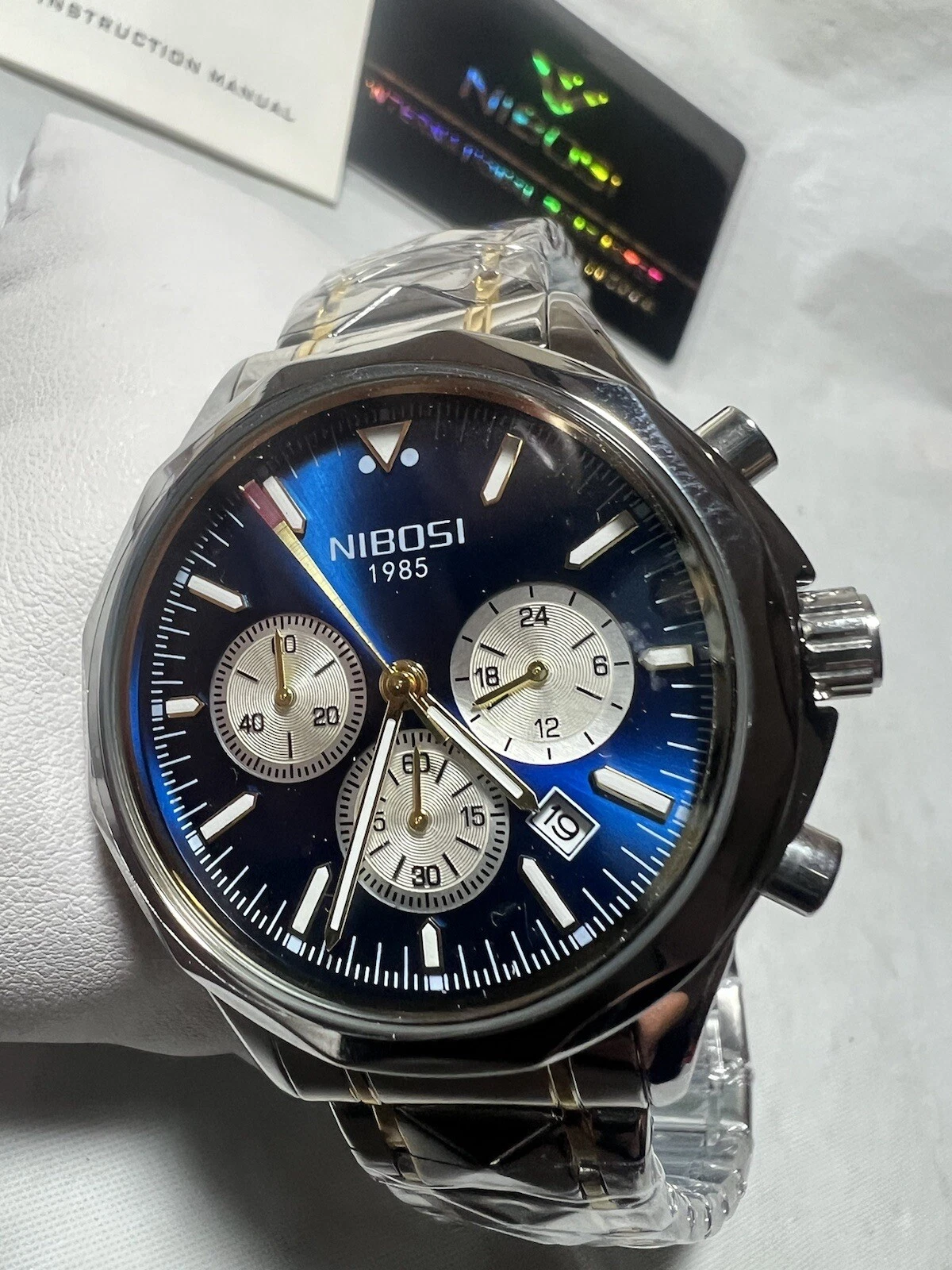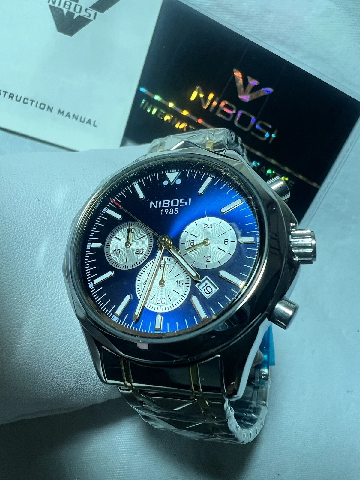 NIBOSI, chronograph date, Beautiful Navy Blue, stainless Steel,44mm,N12608,mens