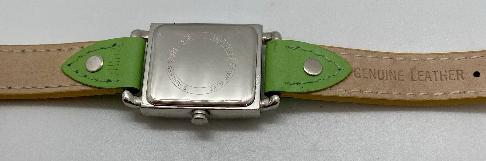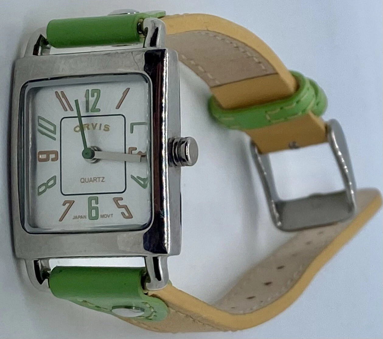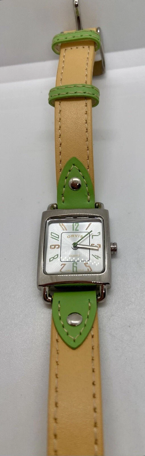 NEW ORVIS Ladies Watch Fresh Battery Green/Gold Leather Silver Rectangle WR3ATM