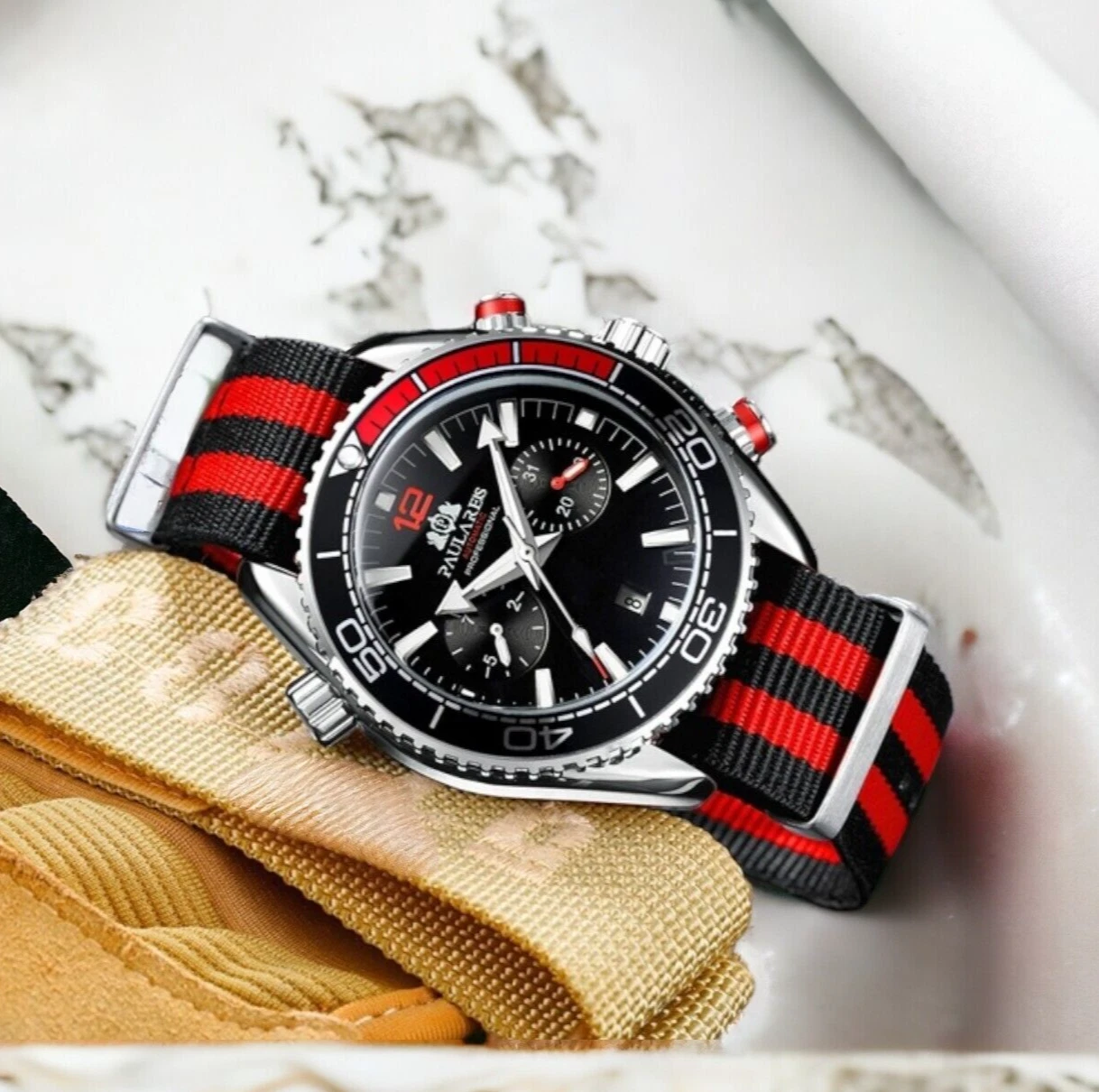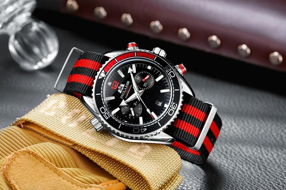 PAULAREIS Automatic Nylon Strap Diver Watch Men Chronograph Waterproof Luminous
