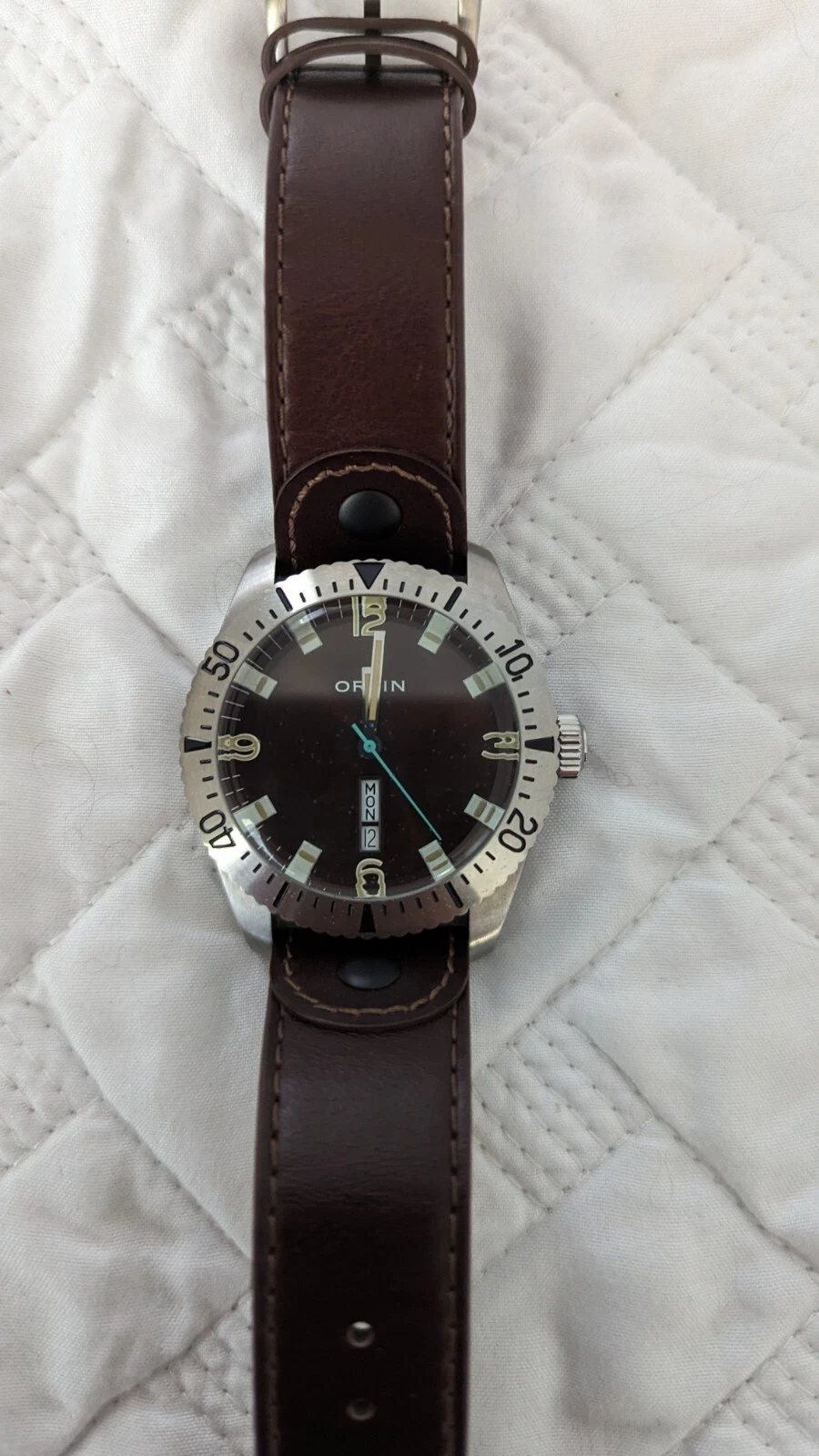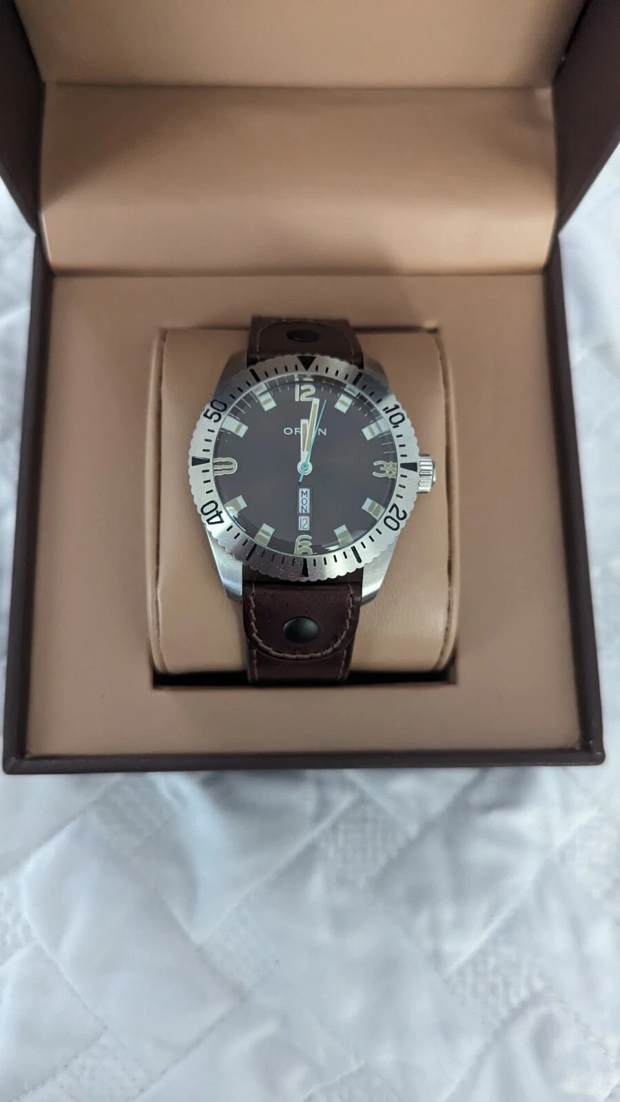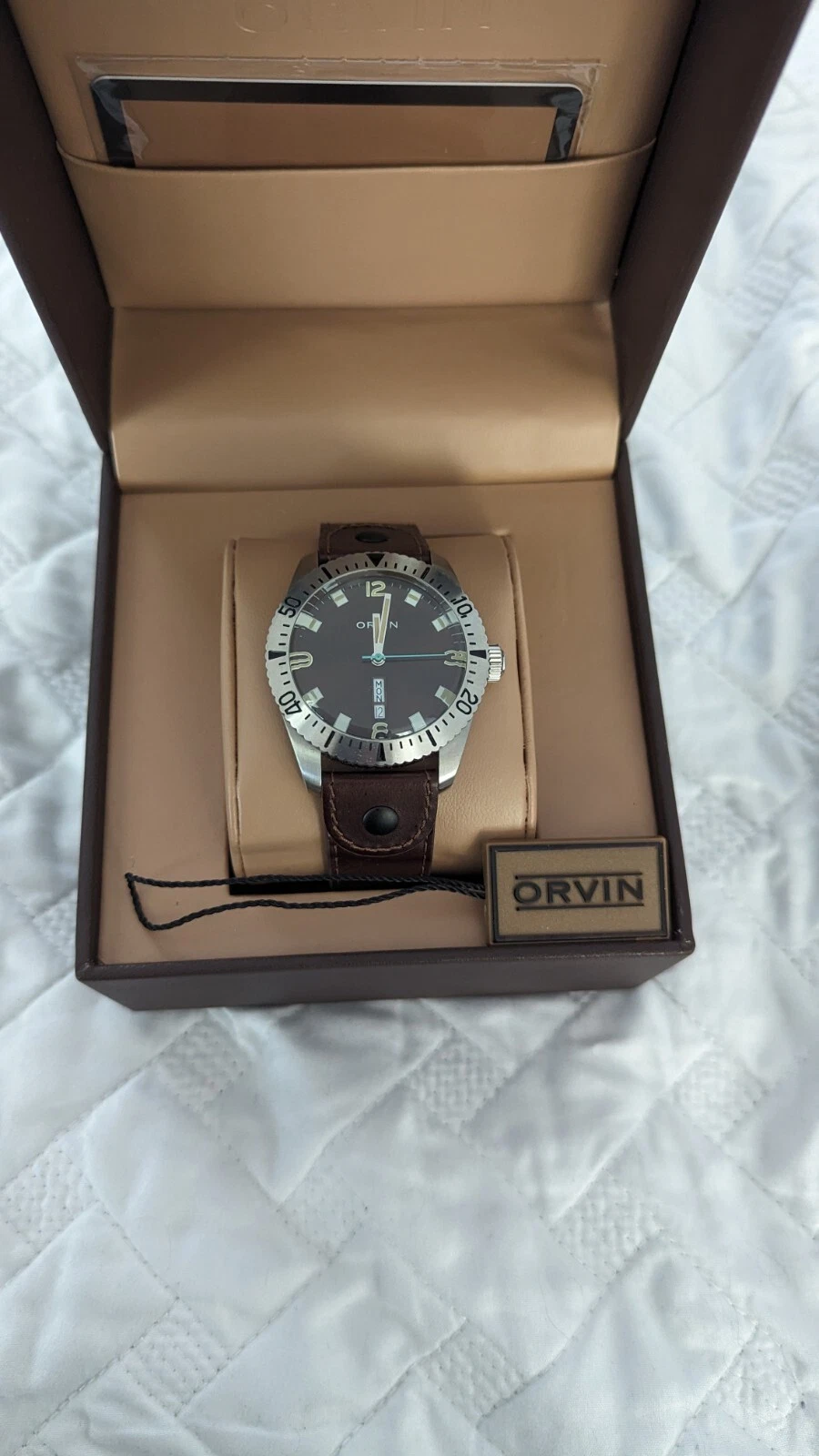 Orvin Brown Leather Watch Diver DayDate Swiss Quality 2 YR Warranty MSRP $290