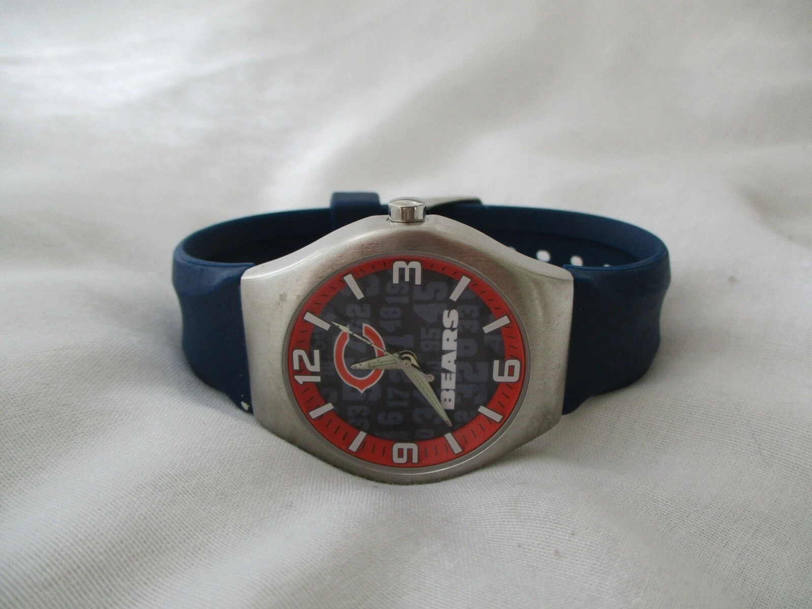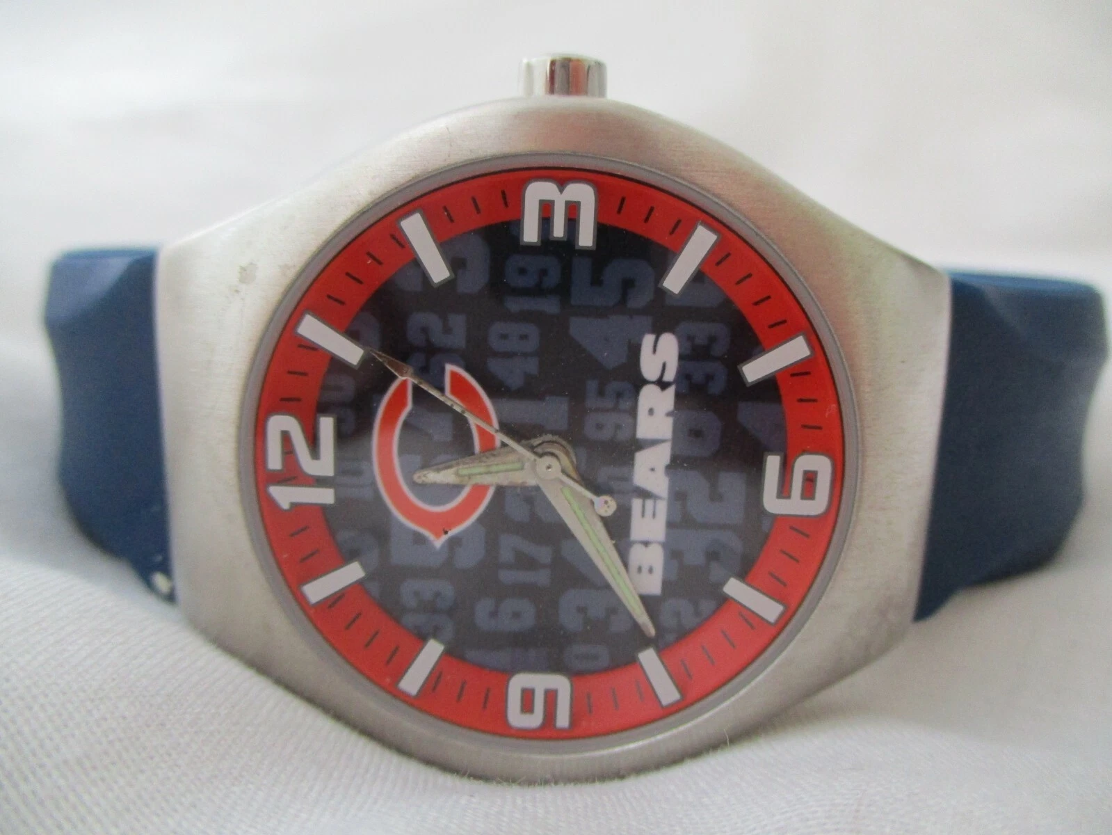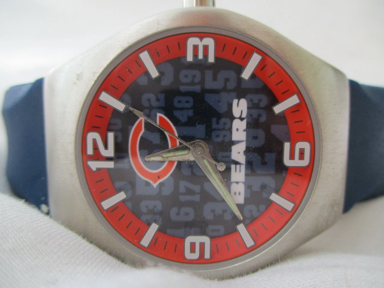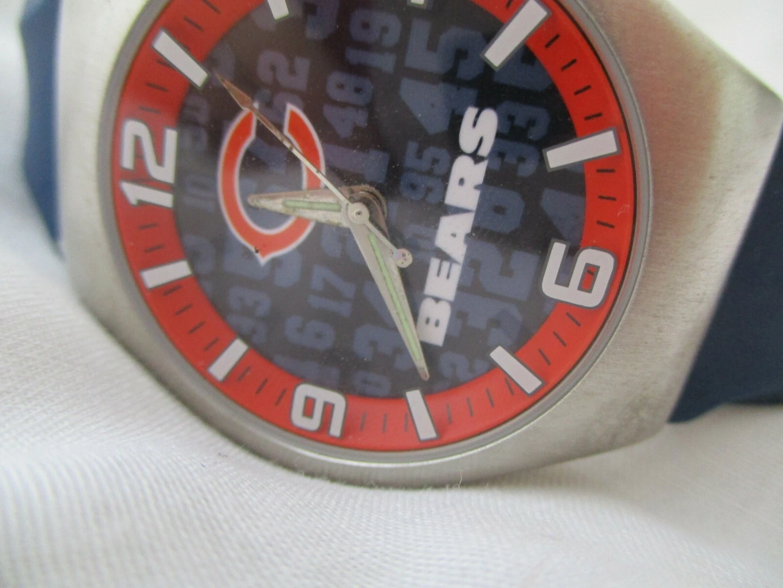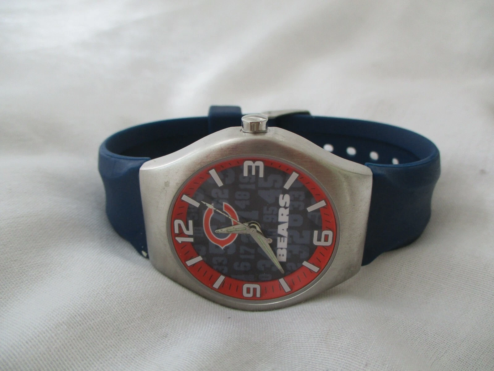 Bears NFL Watch Silver Toned Red Round Face Blue Buckle Band WORKING!