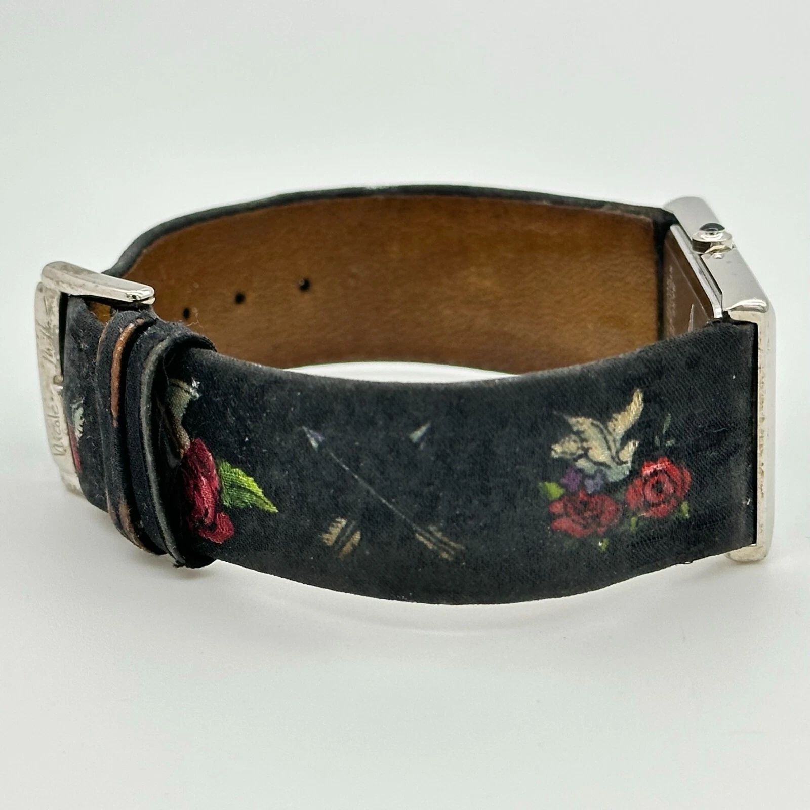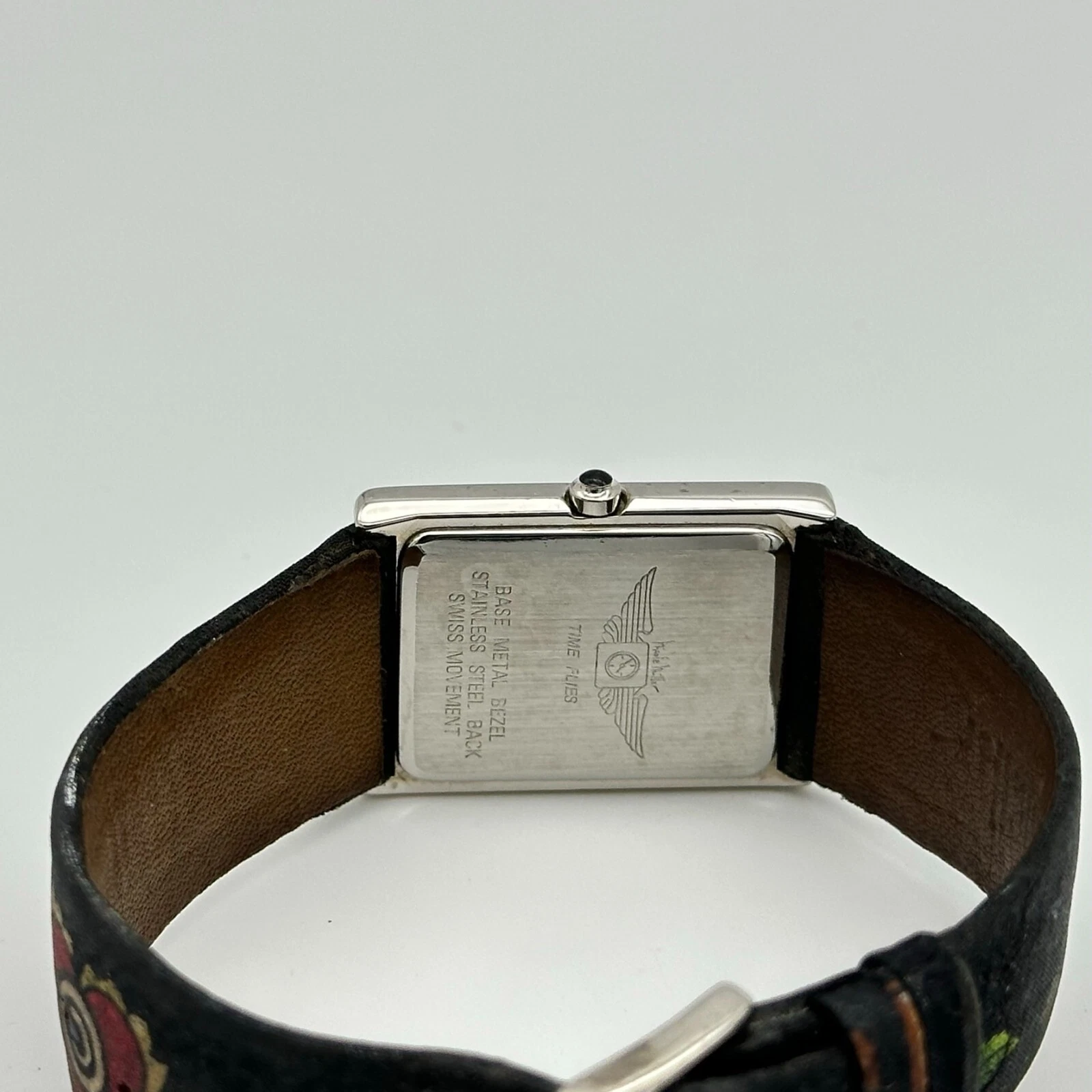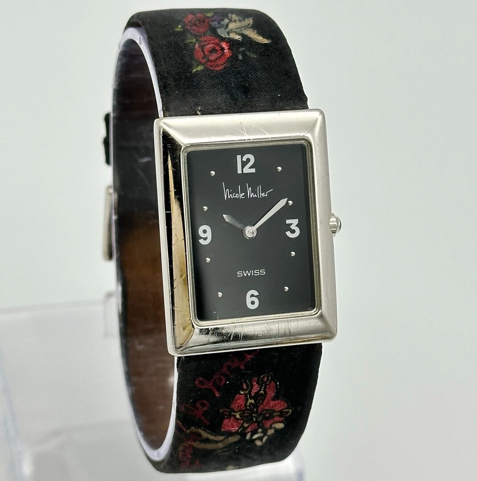 Ladies NICOLE MILLER Time Flies Silver Tone Swiss Watch, Black Floral Band Runs