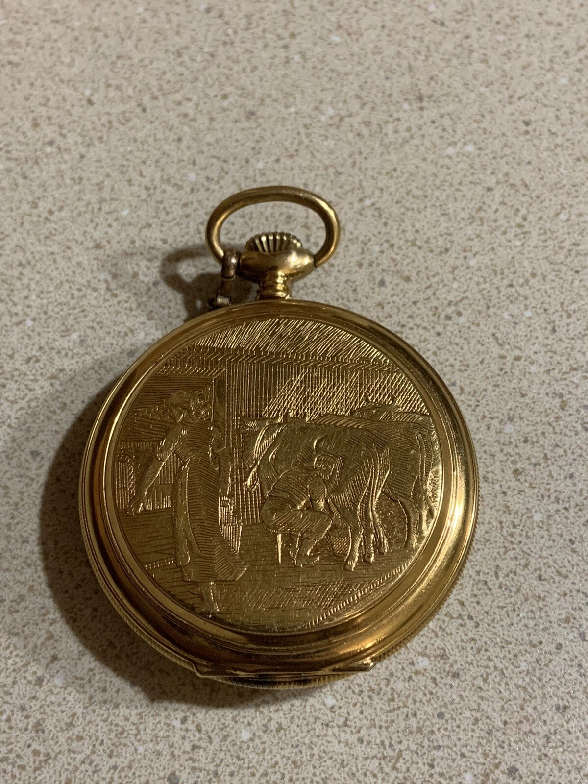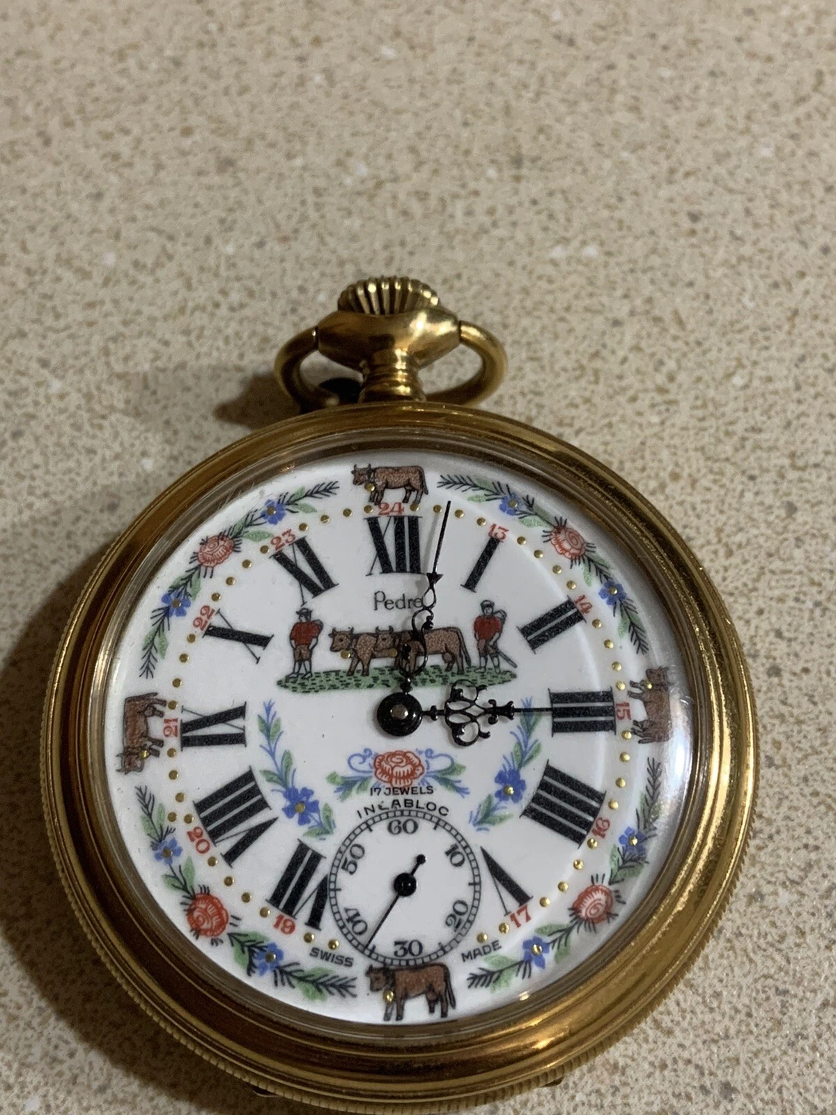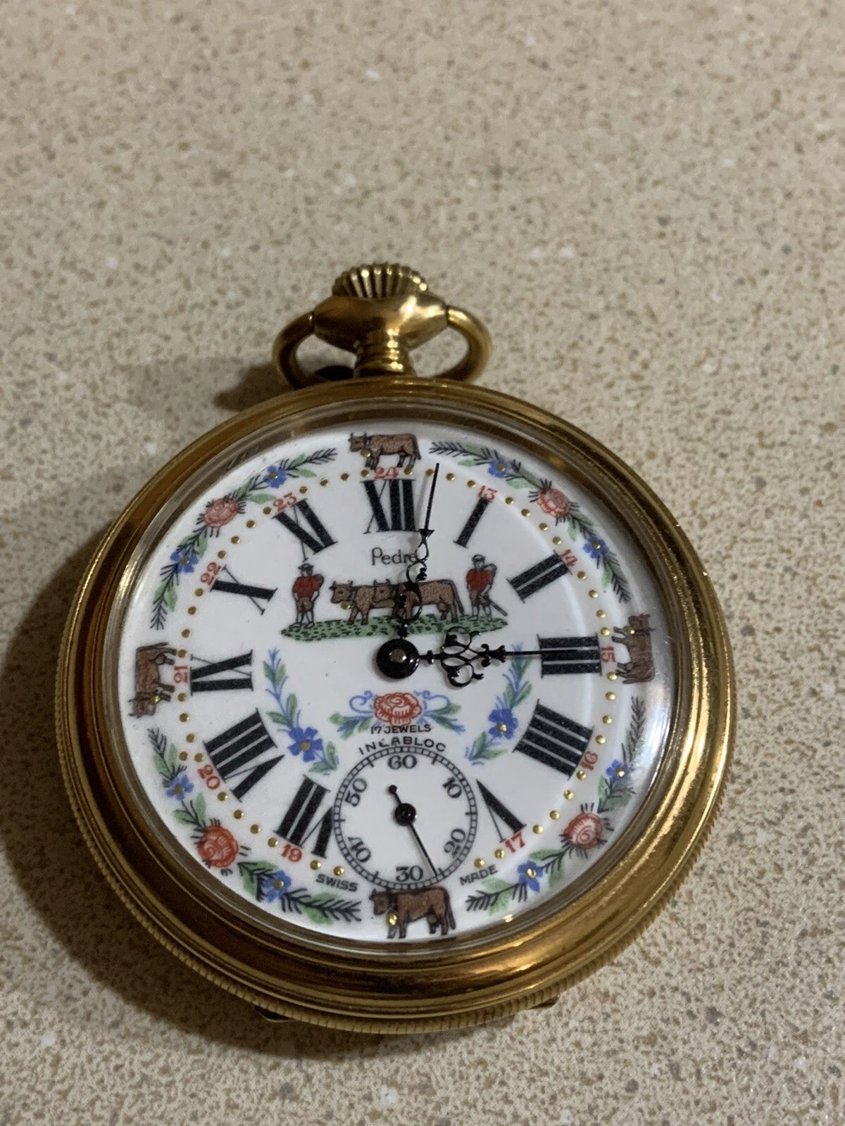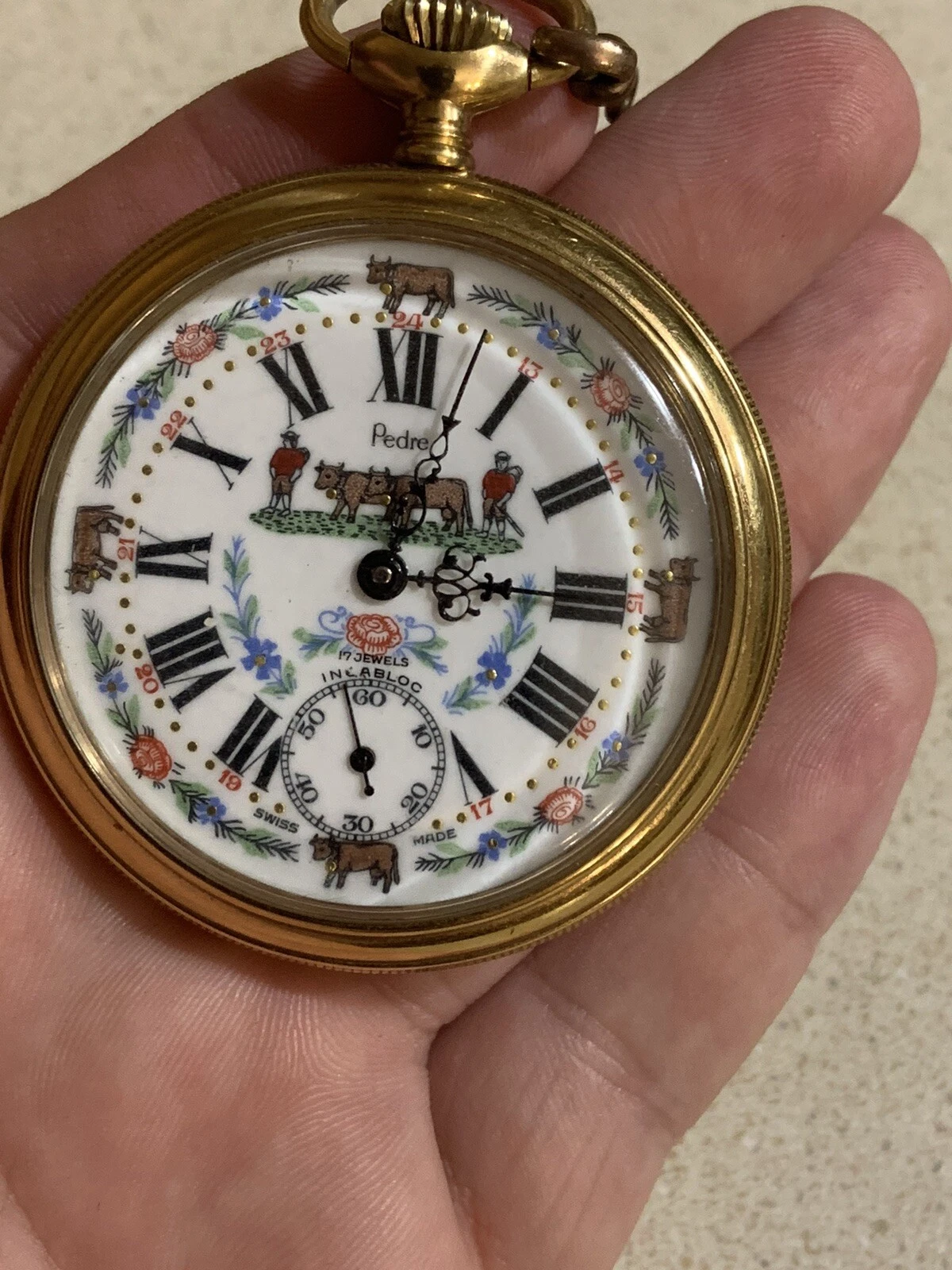 Beautiful Pedre 17 Jewels Gold Tone Farm Theme Hand-Wind Mechanical Pocket Watch