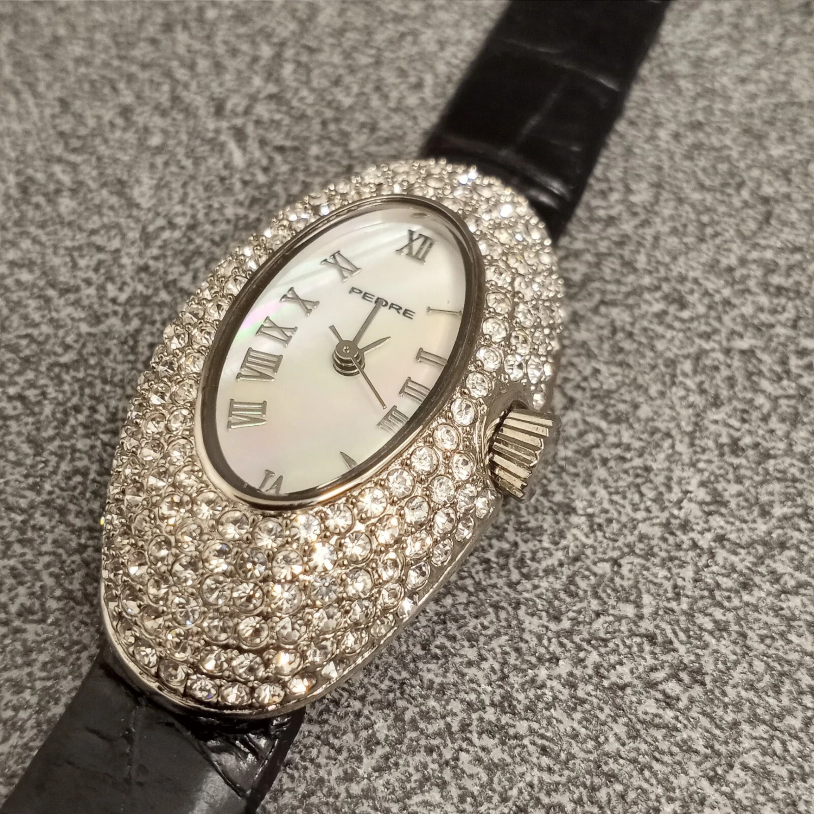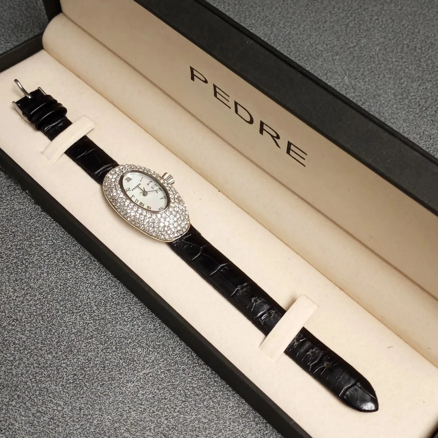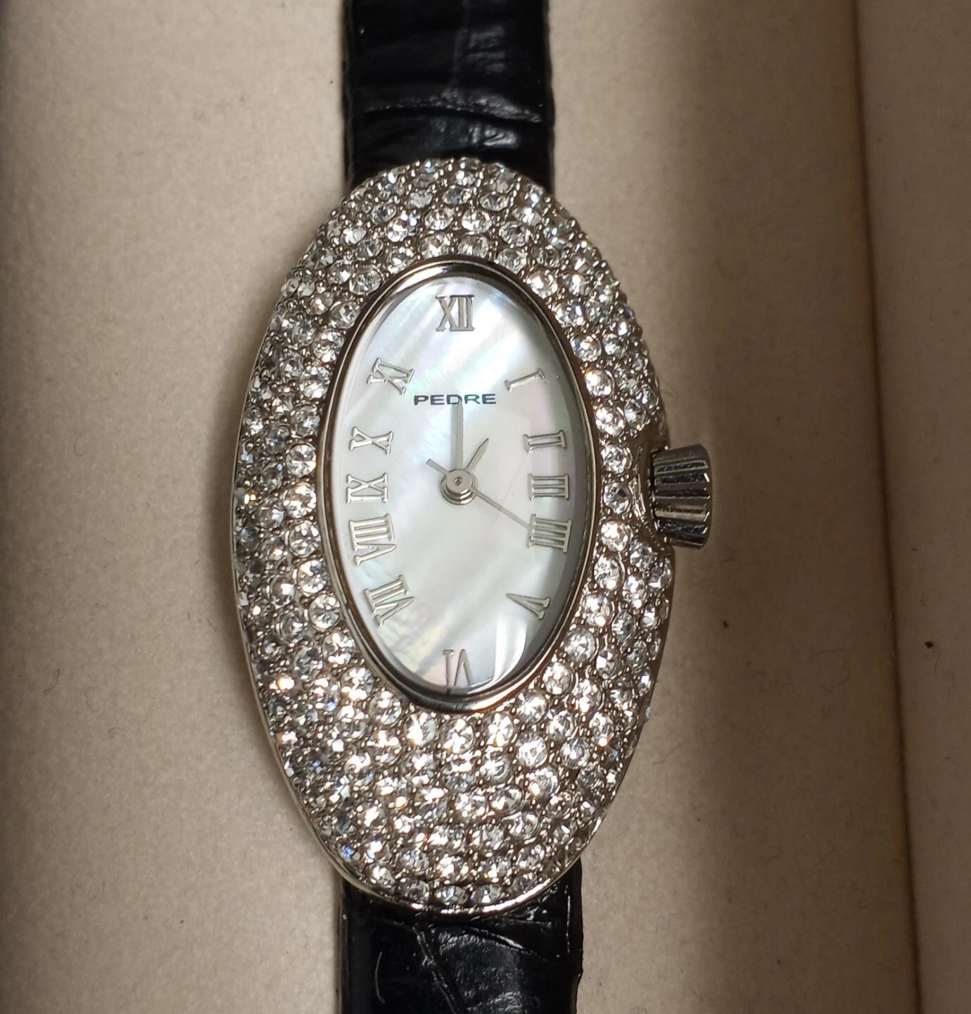 NEW Pedre Mother of Pearl Jewel Encrusted Watch with Black Leather Band