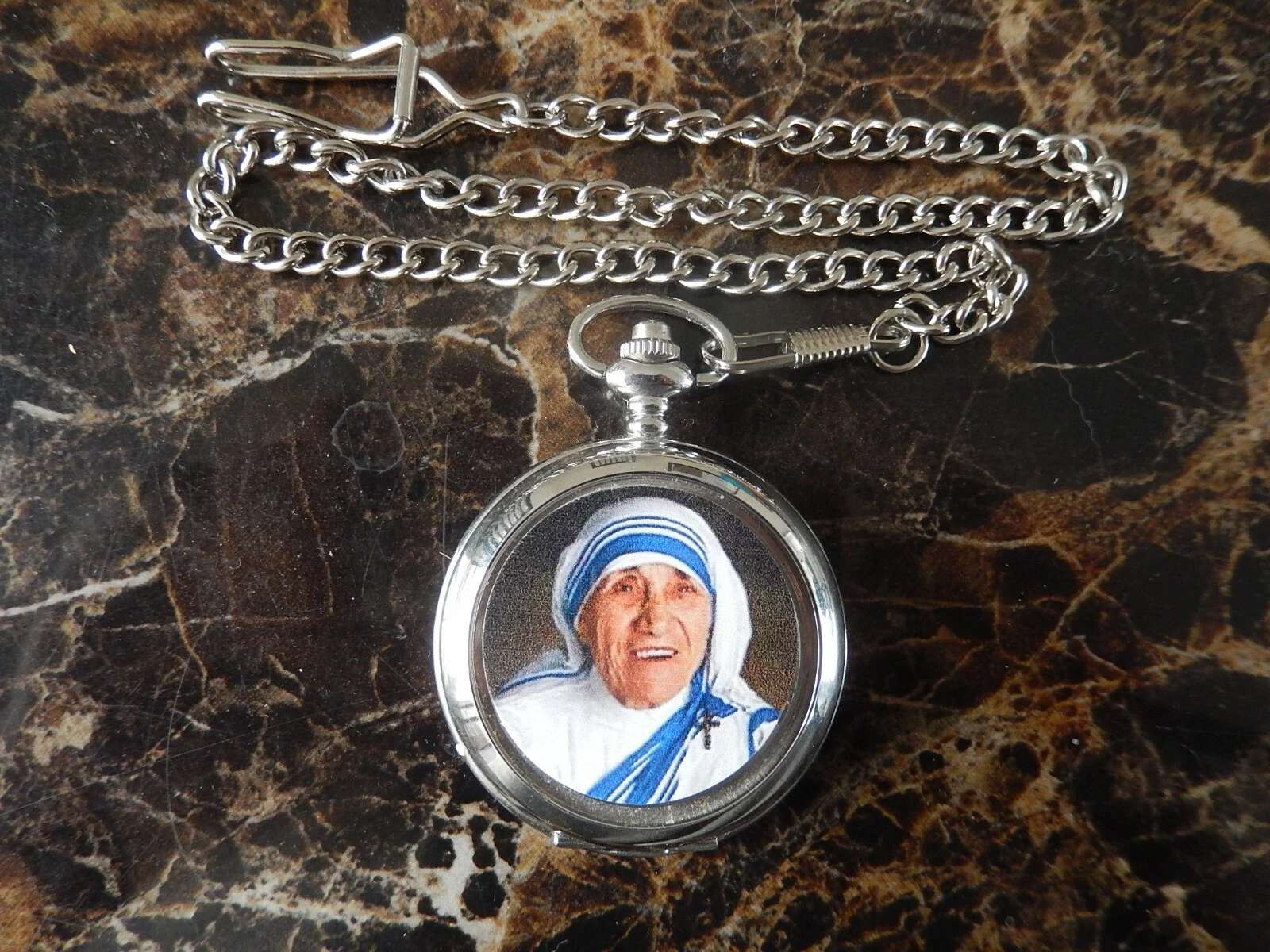 MOTHER TERESA CHROME POCKET WATCH WITH CHAIN (NEW)
