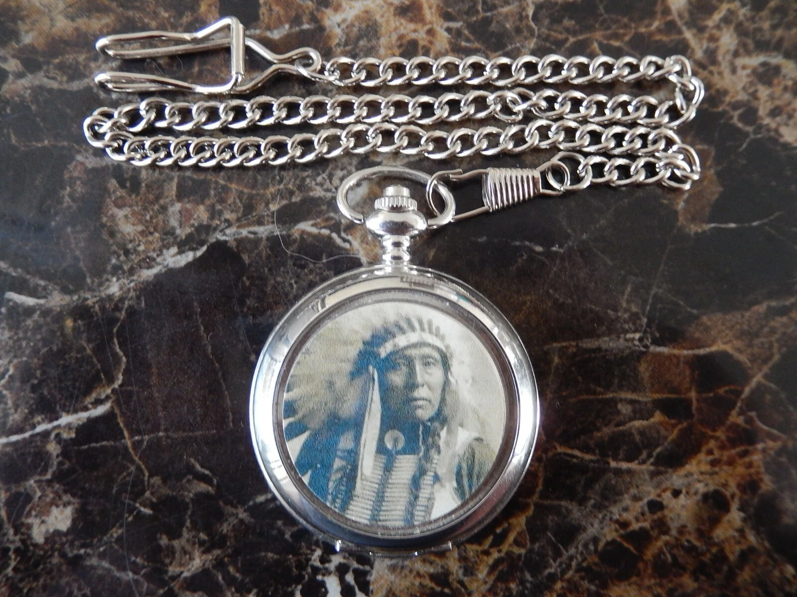 RED INDIAN CHIEF CHROME POCKET WATCH WITH CHAIN (NEW)
