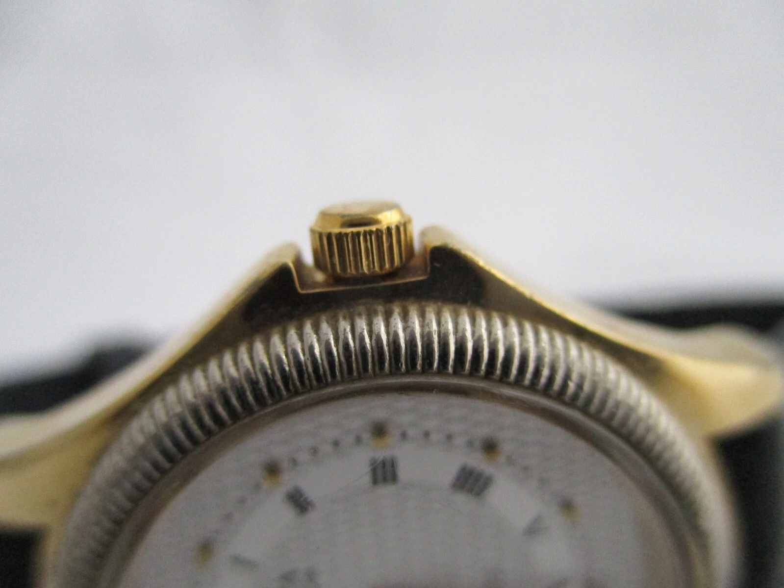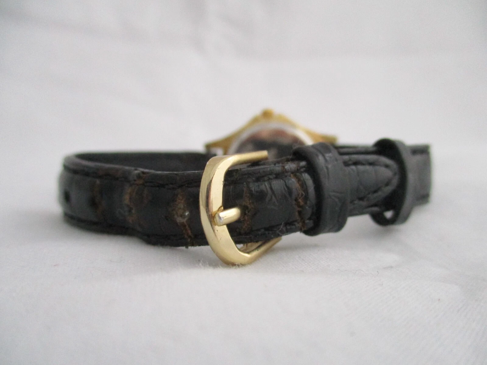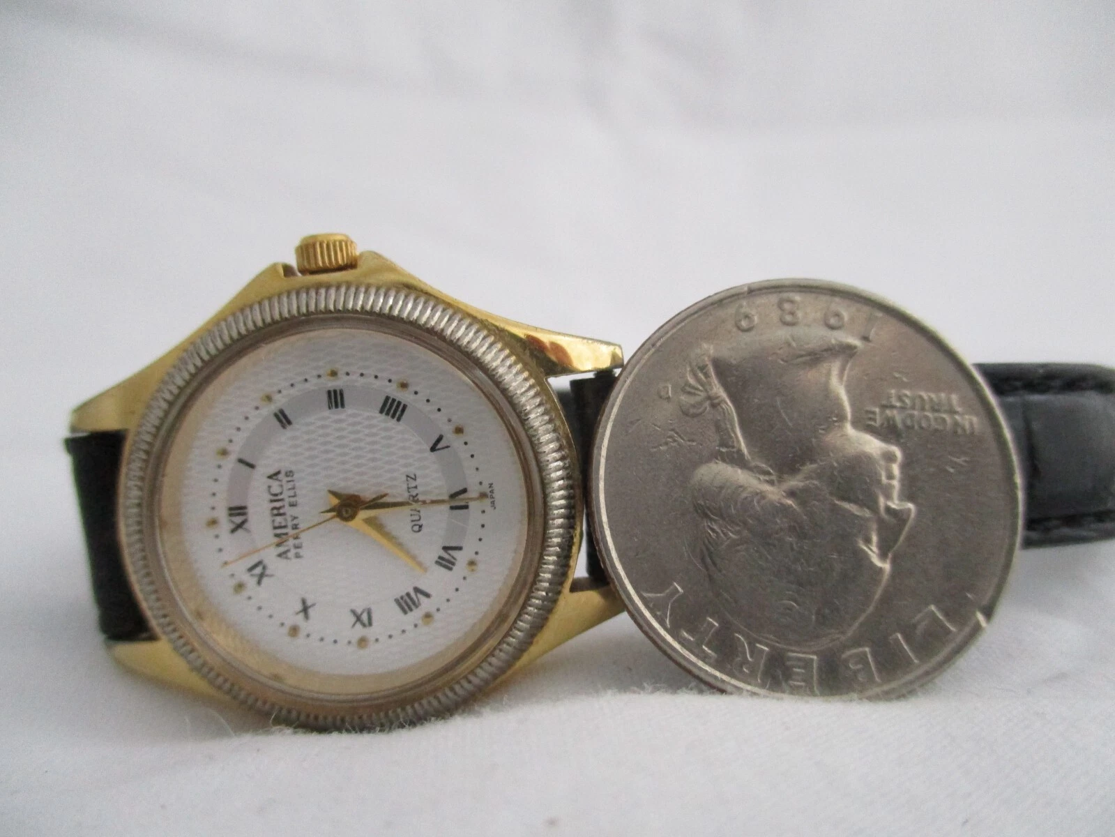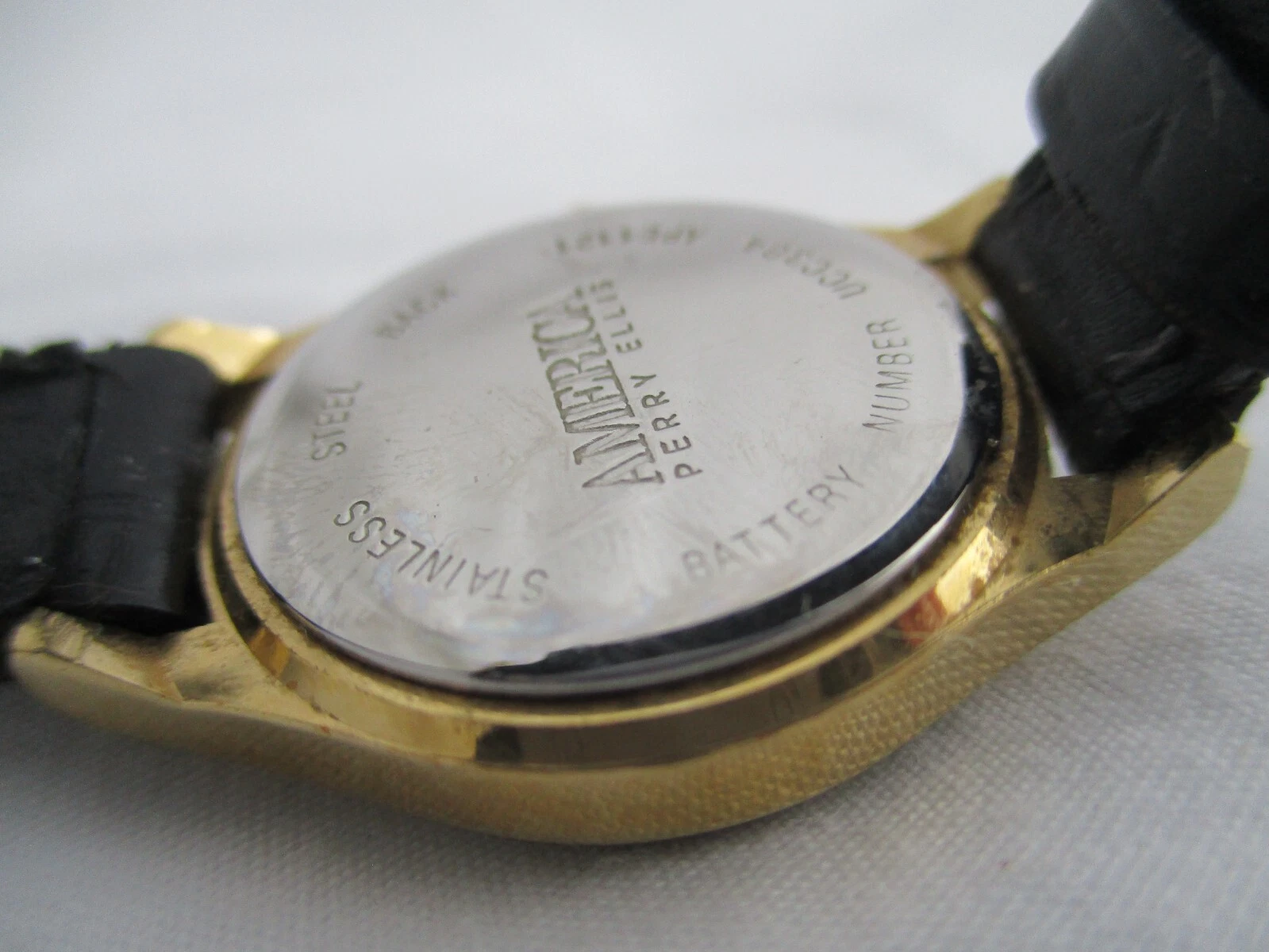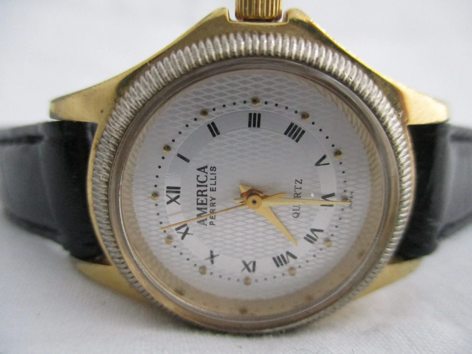 America Perry Ellis Watch Gold & Silver Tone Black Leather Band Roman Numerals