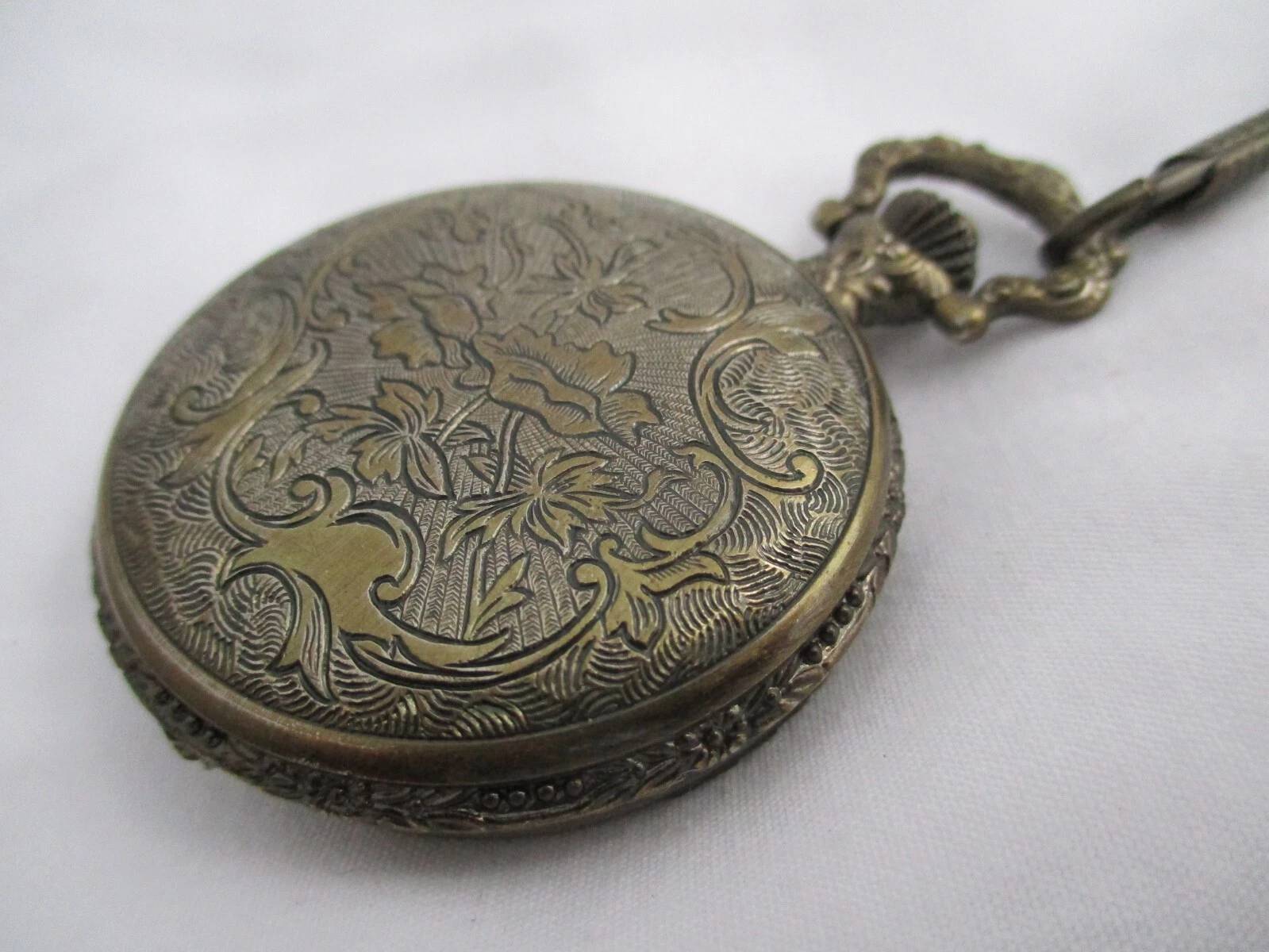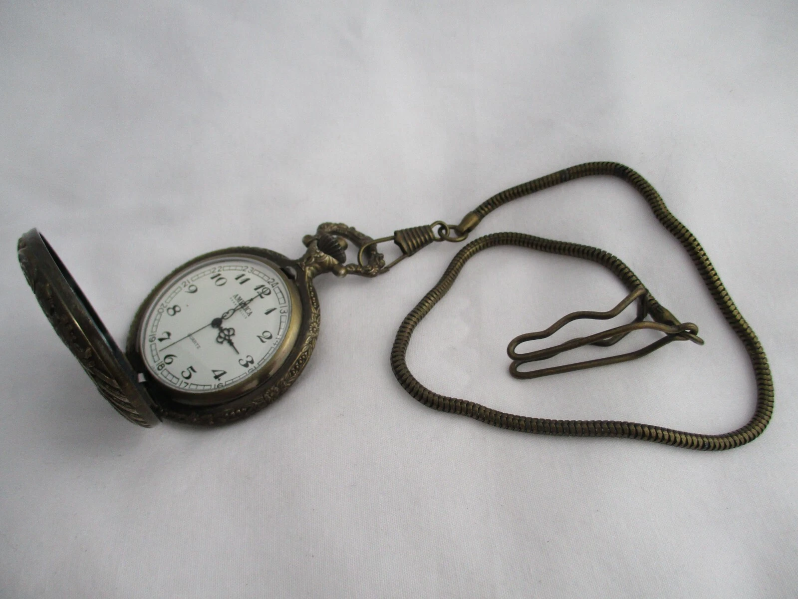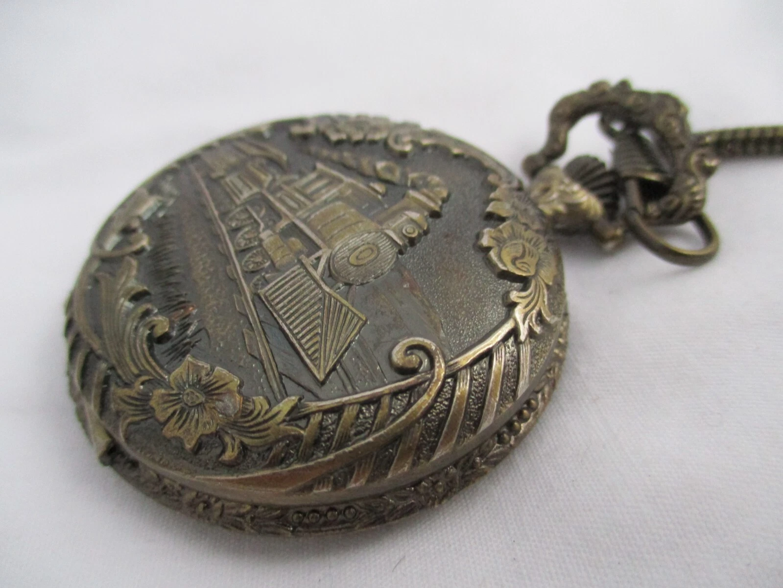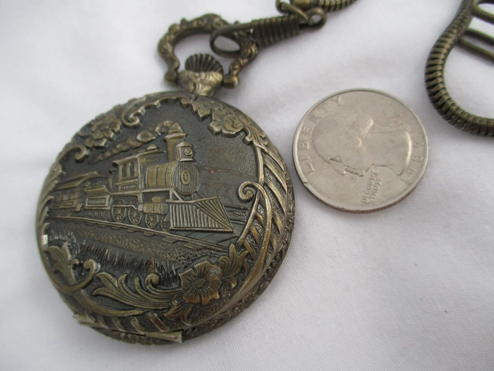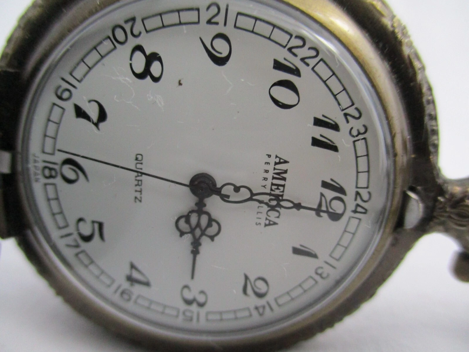 America Perry Ellis Pocket Watch Train Theme Brass Tone Round Face