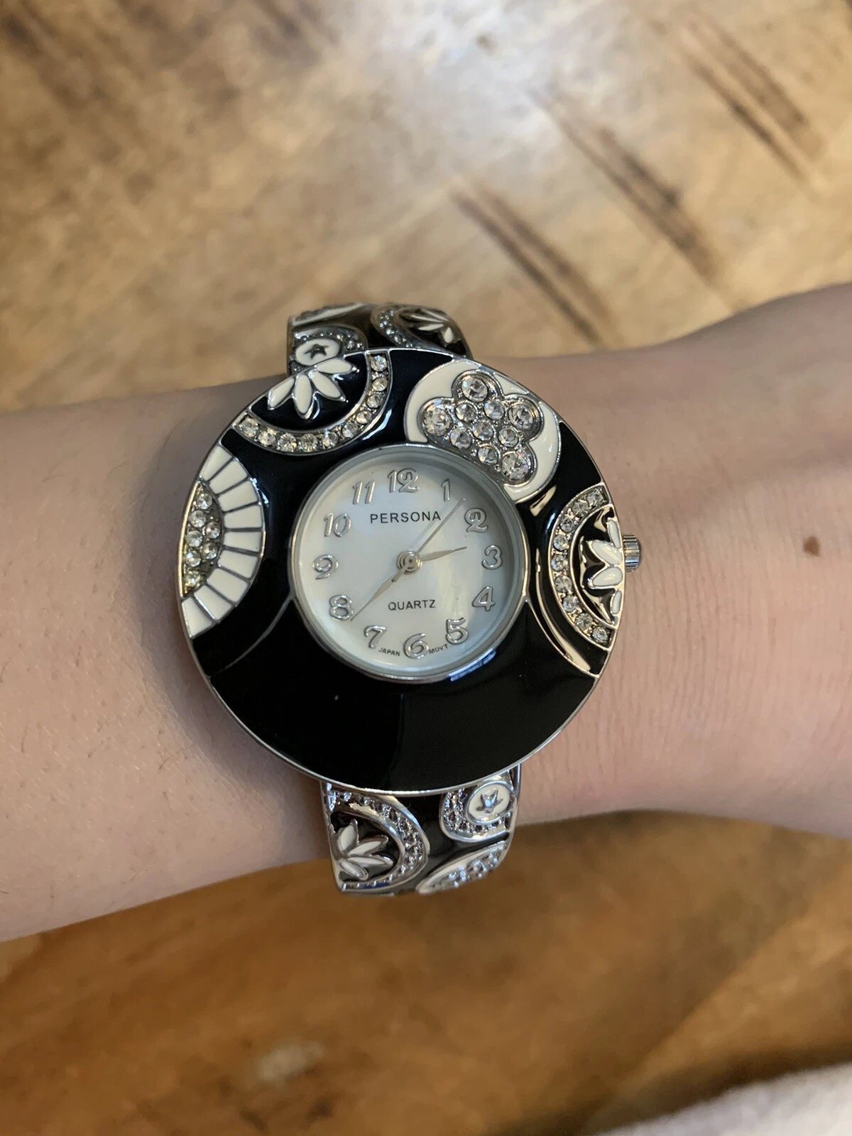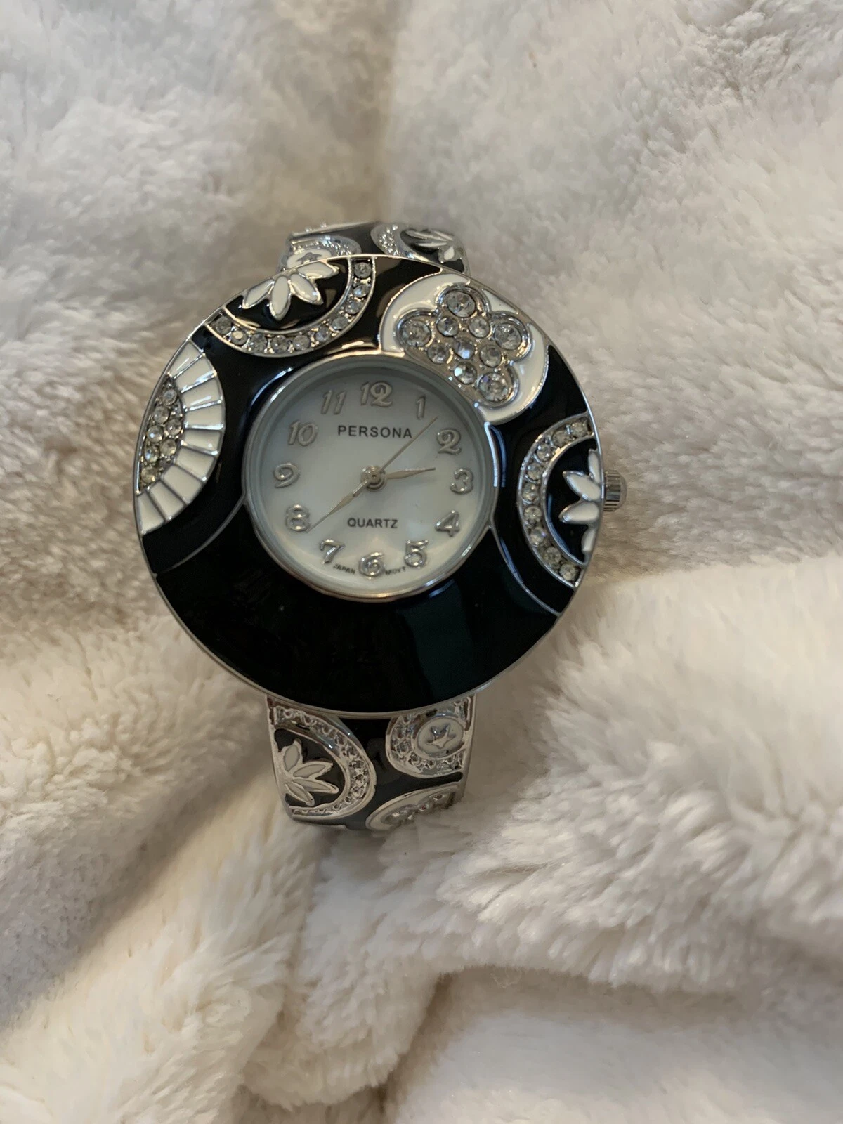 NEW Persona 36mm Silver Watch w Crystal & Black Enamel Mother Of Pearl Face