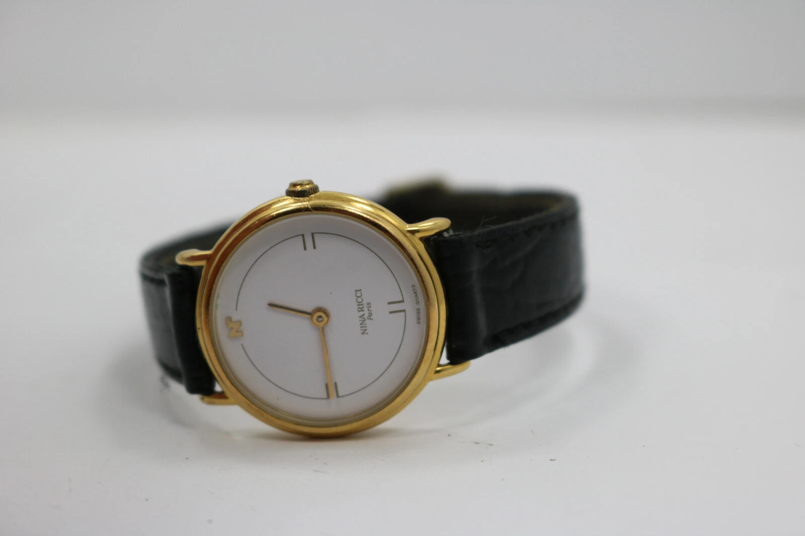 NINA RICCI 572, PARIS LEATHER BAND WOMENS WATCH GOLD TONE NEW BATT