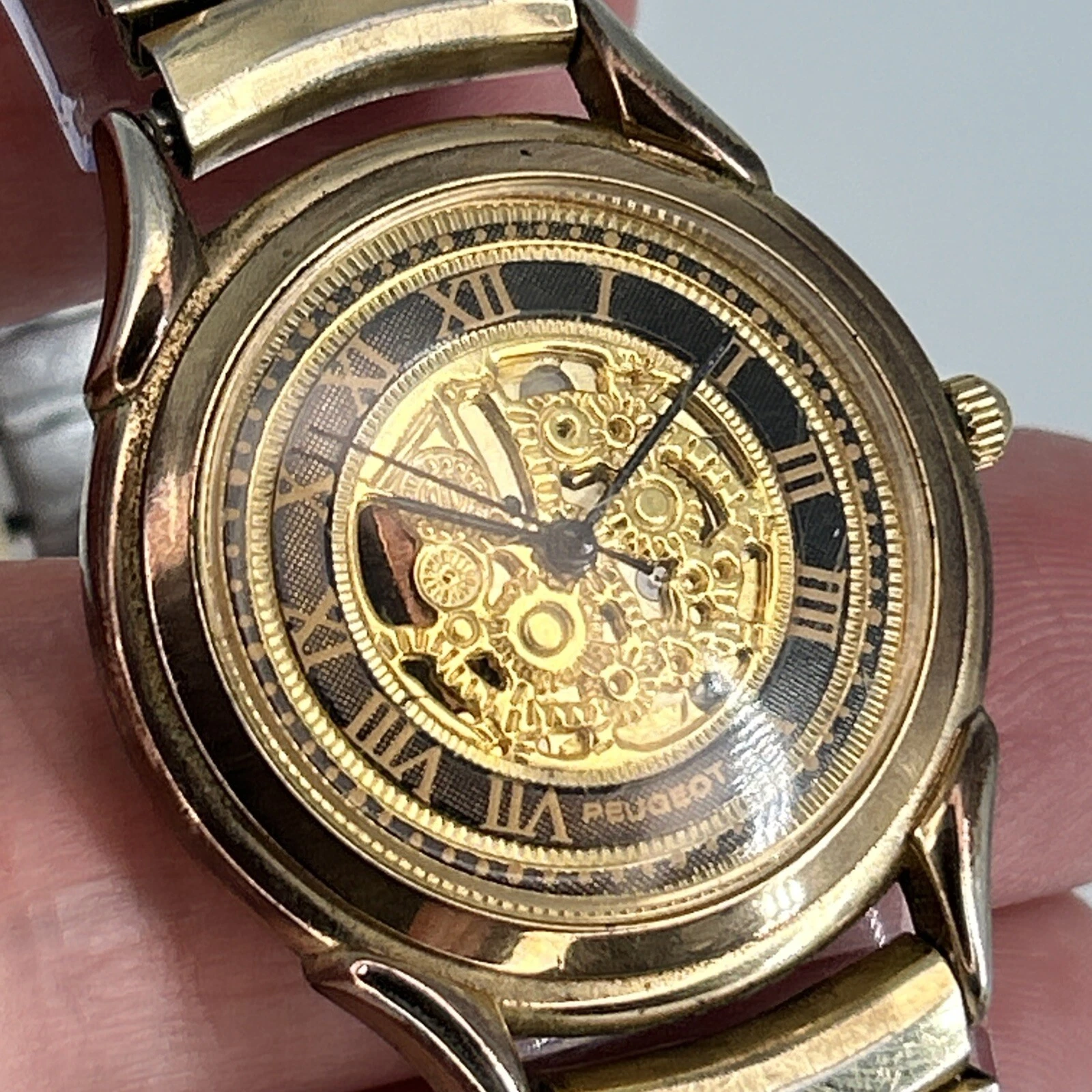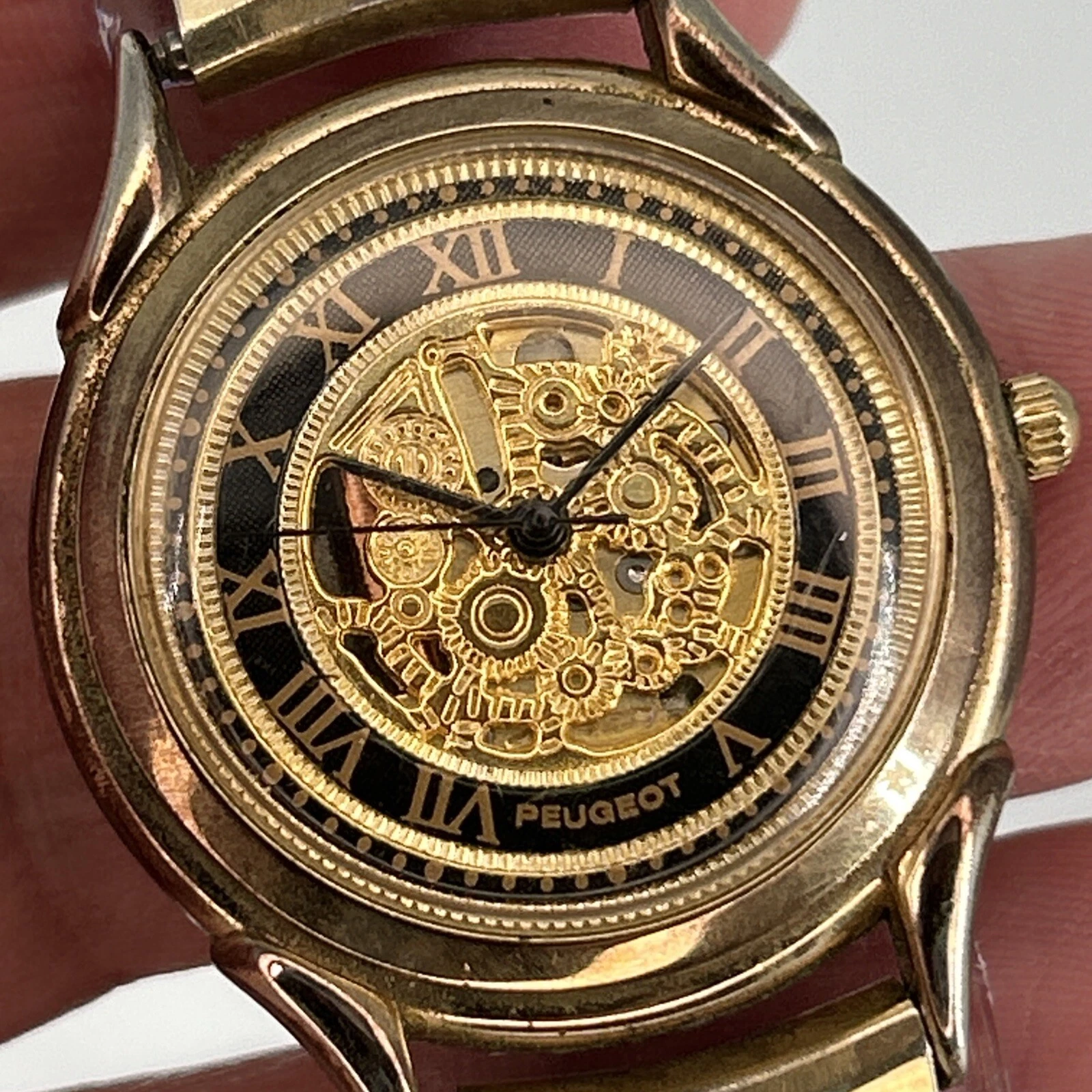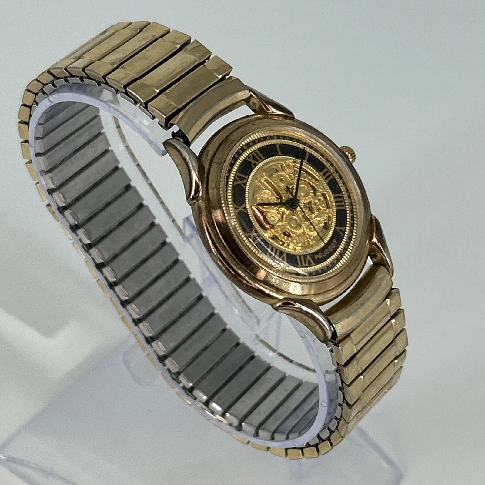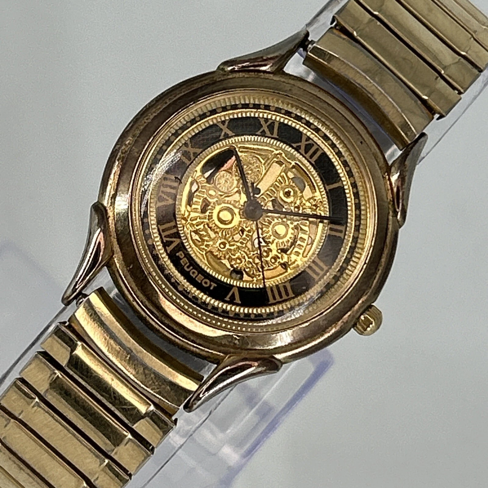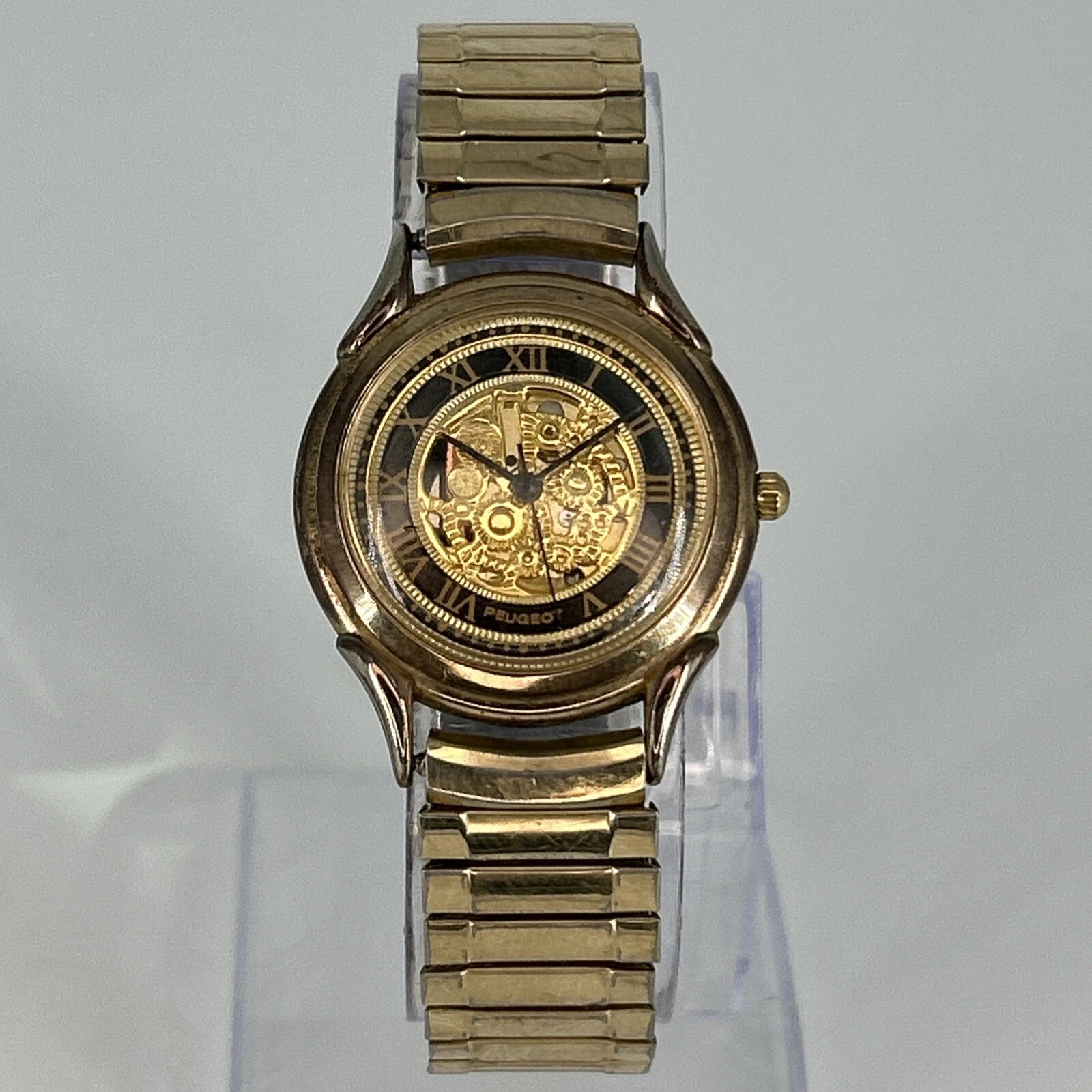 Vintage Peugeot Skeleton Dial QUARTZ Watch Gold Tone Stretch Band NEW BATTERY
