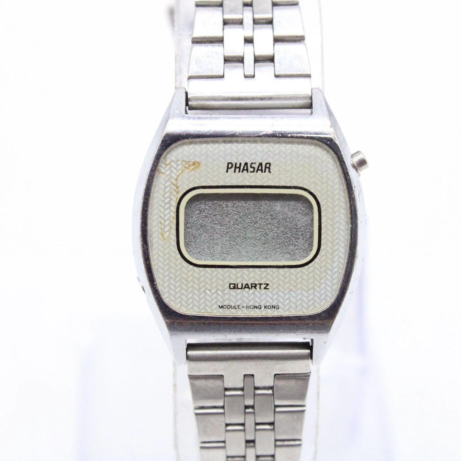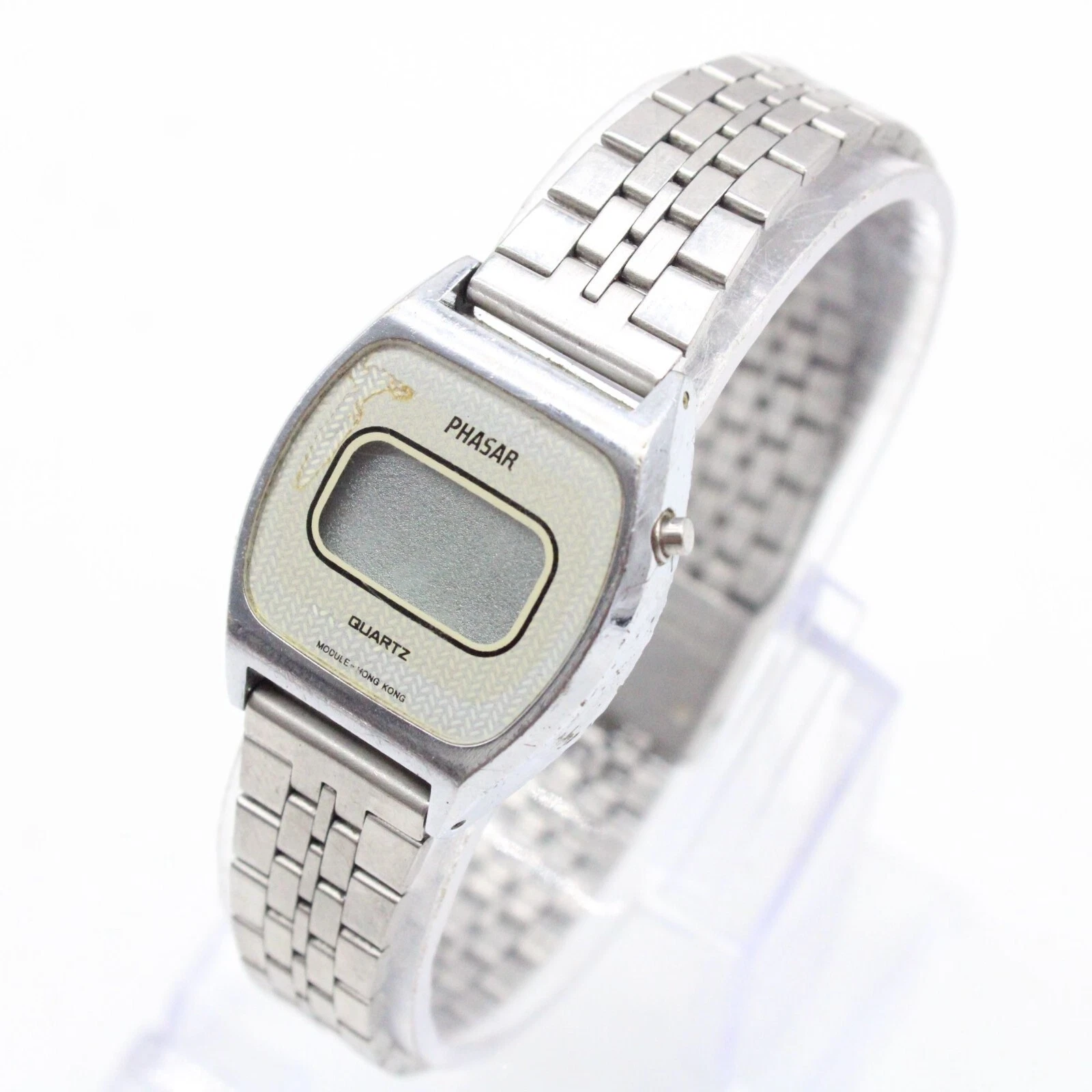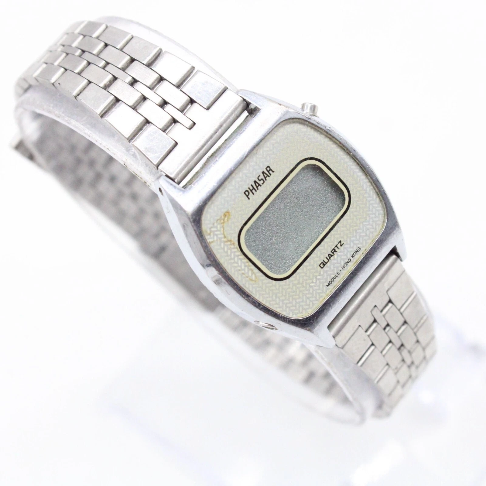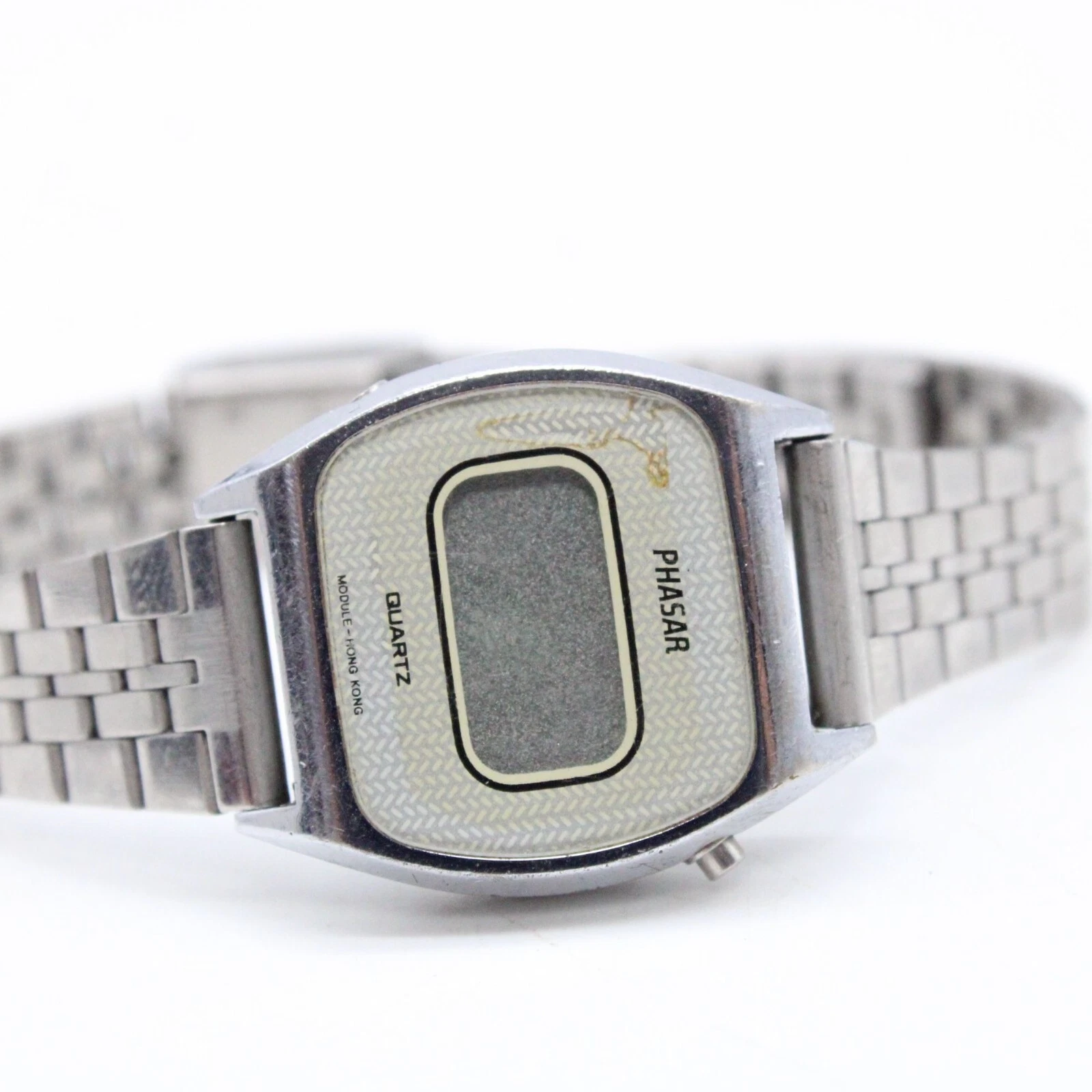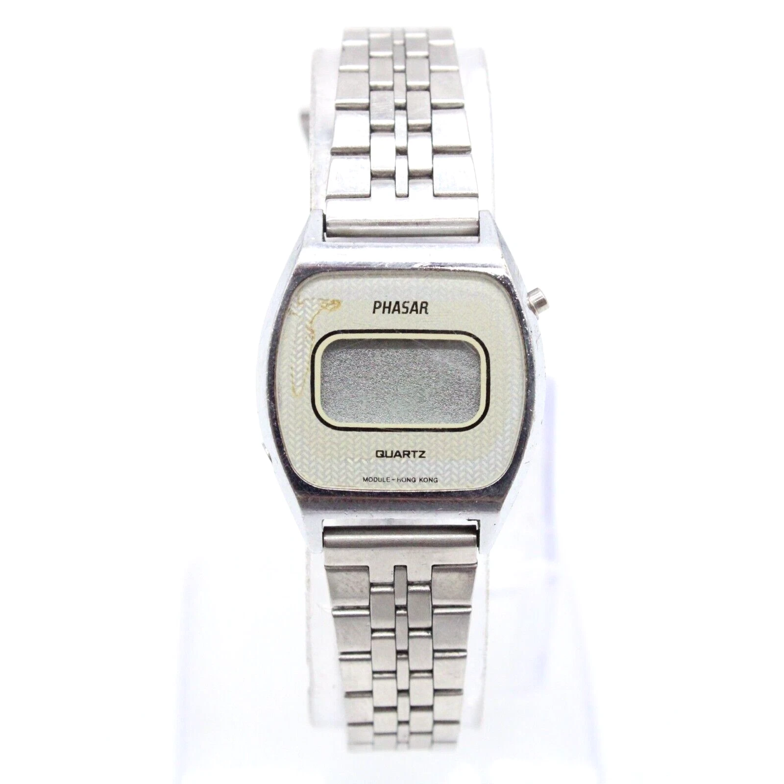 Vintage PHASAR Digital Watch Womens Silver Tone Stainless Steel Quartz 80s