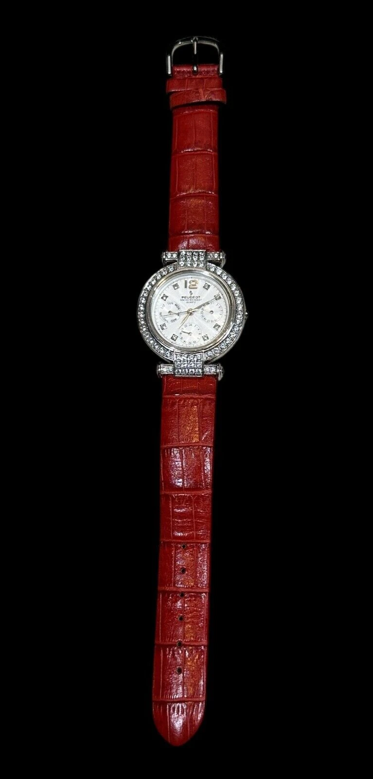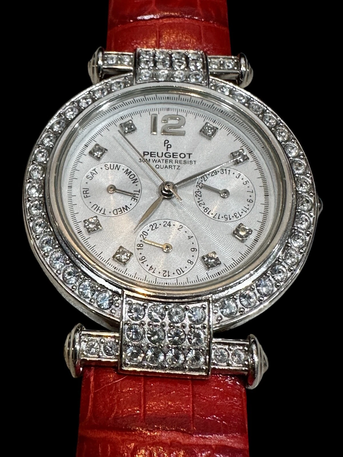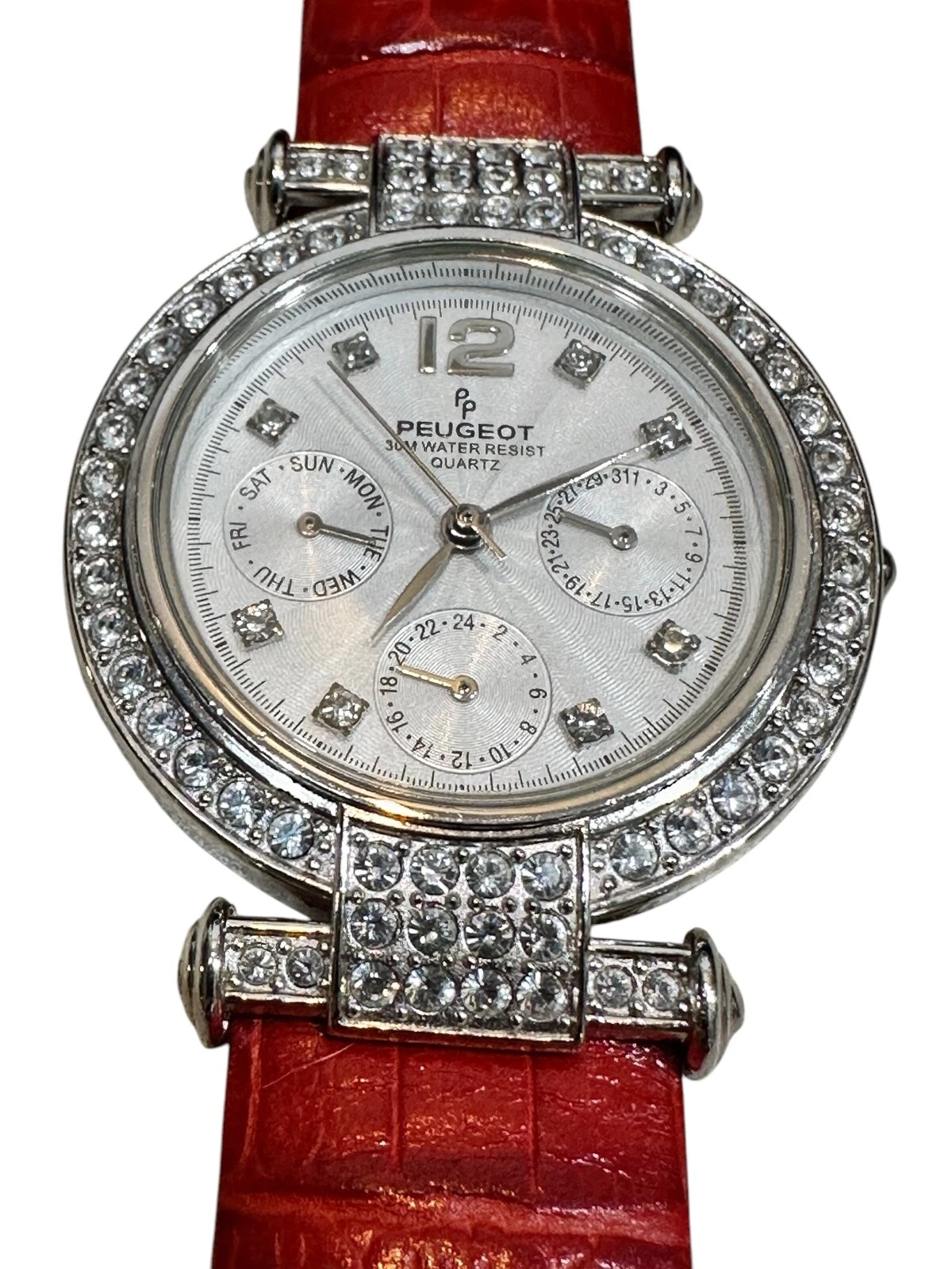 PEUGEOT WOMEN'S 338 CHRONOGRAPH CRYSTAL ACCENTED CASE WHITE DIAL RED STRAP 3 ATM