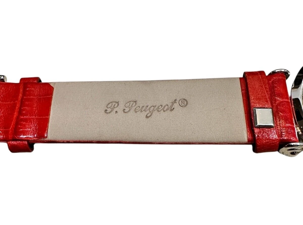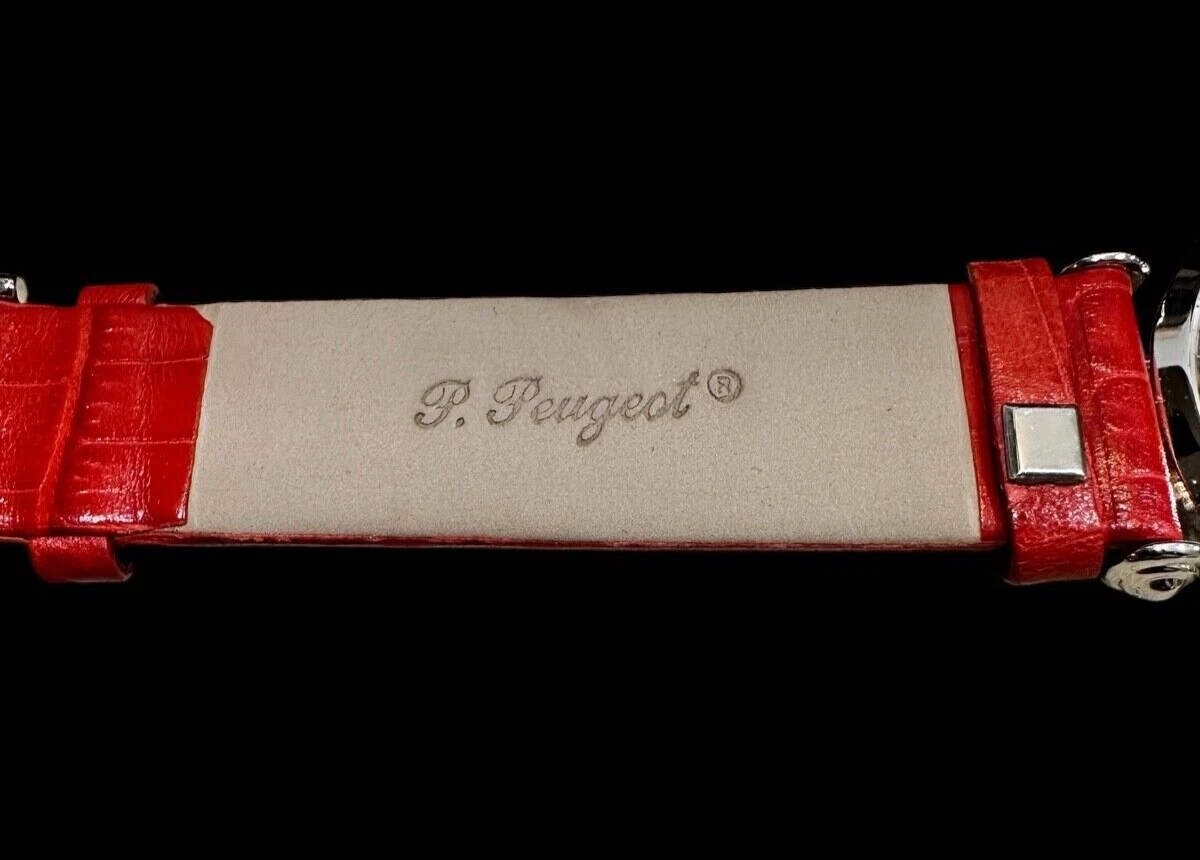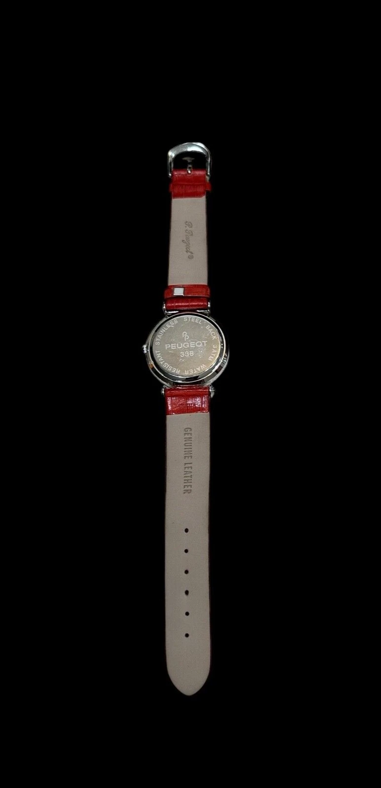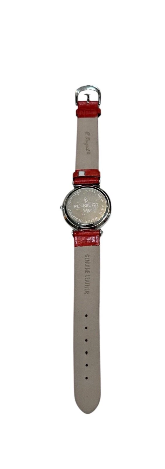 PEUGEOT WOMEN'S 338 CHRONOGRAPH CRYSTAL ACCENTED CASE WHITE DIAL RED STRAP 3 ATM