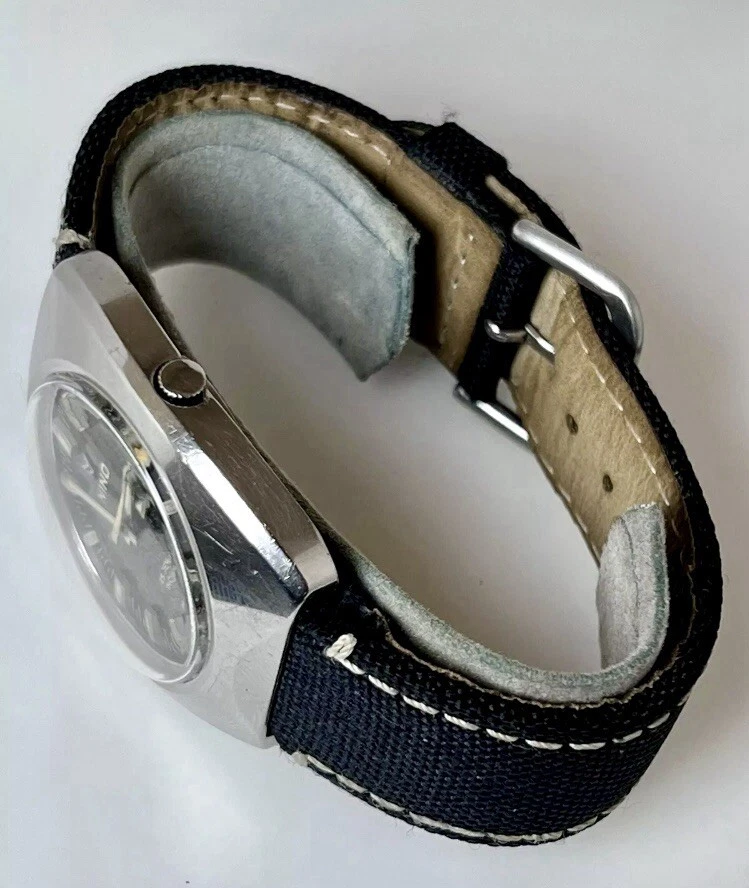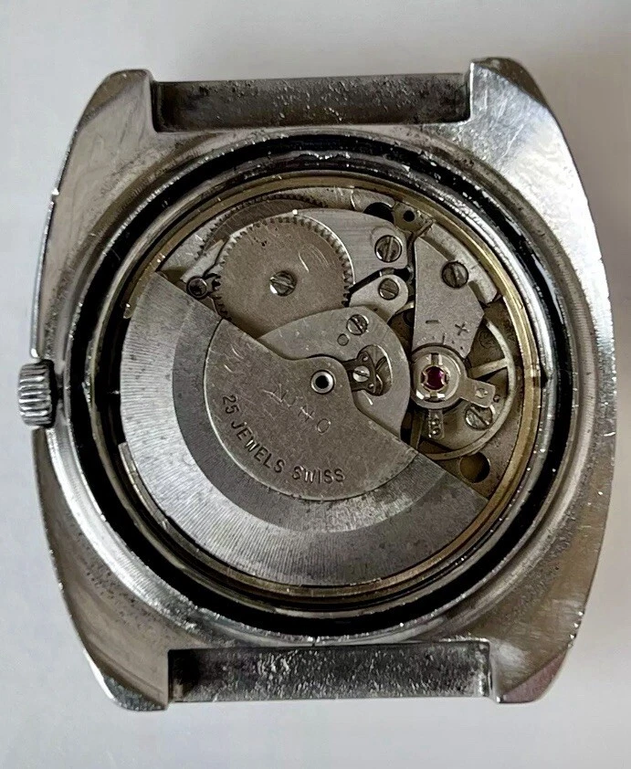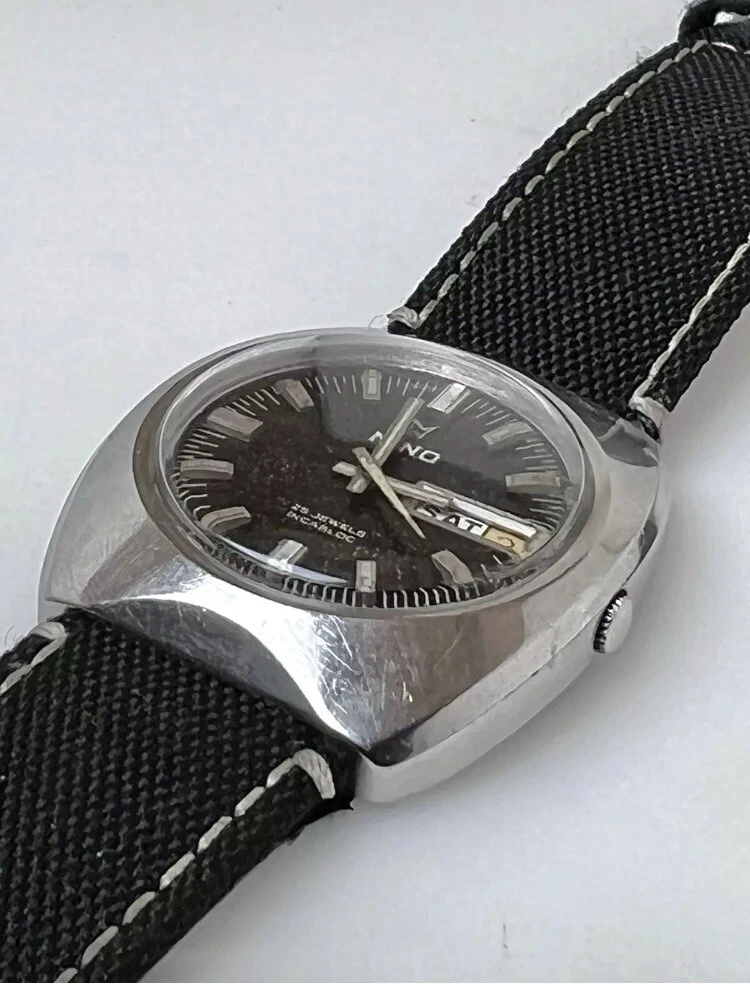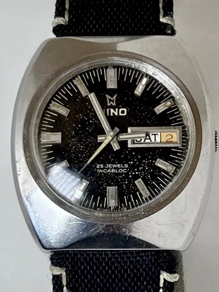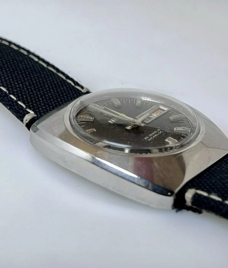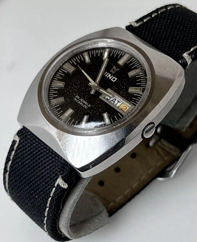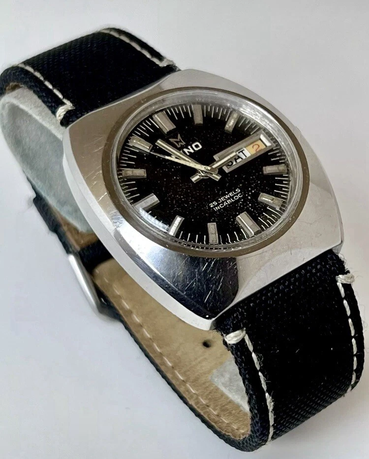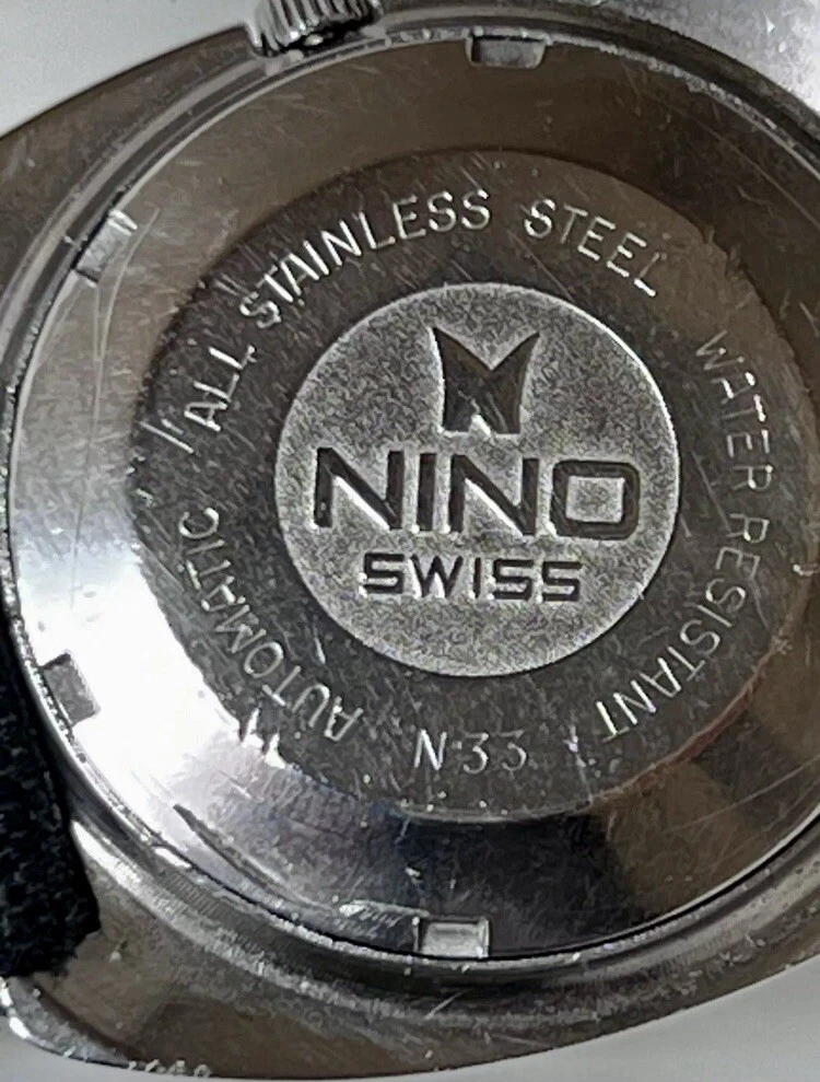 Vintage NINO Men’s 40mm Day Date Swiss Automatic Watch 25j SS Black Dial Strap