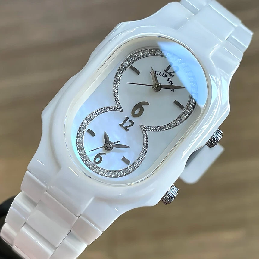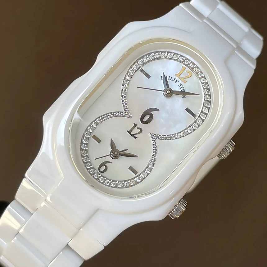 Philip Stein Dual Time Signature Ceramic Mother Pearl Diamond Natural Frequency