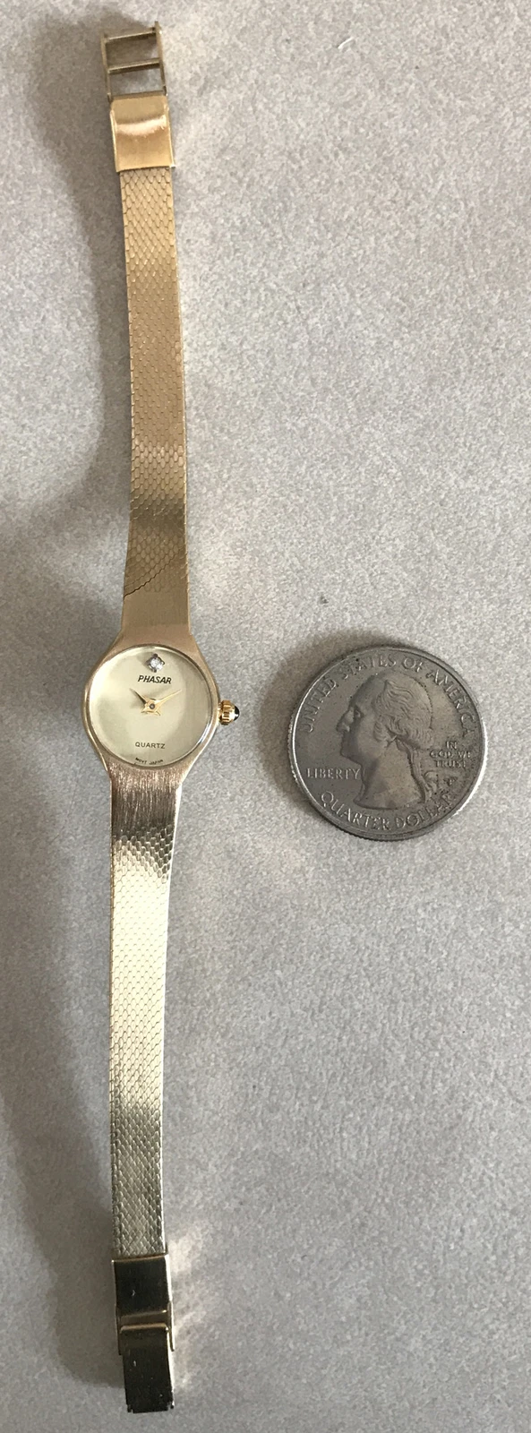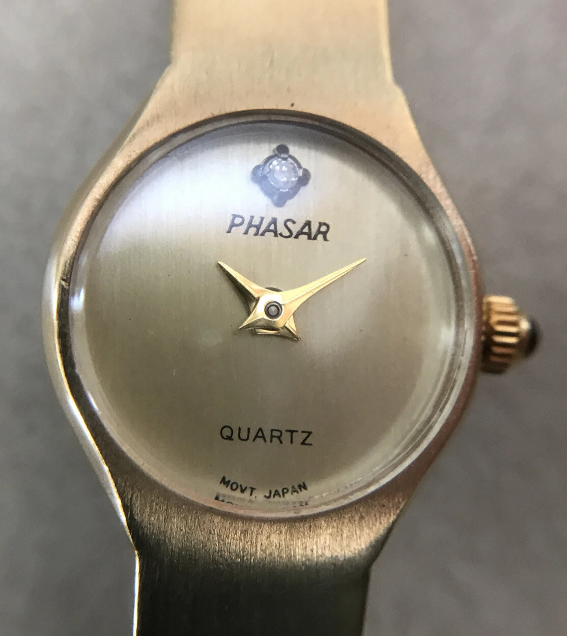 Vtg 80s Phasar Diamond Analog Quartz Stainless Steel Goldtone Band Wrist Watch
