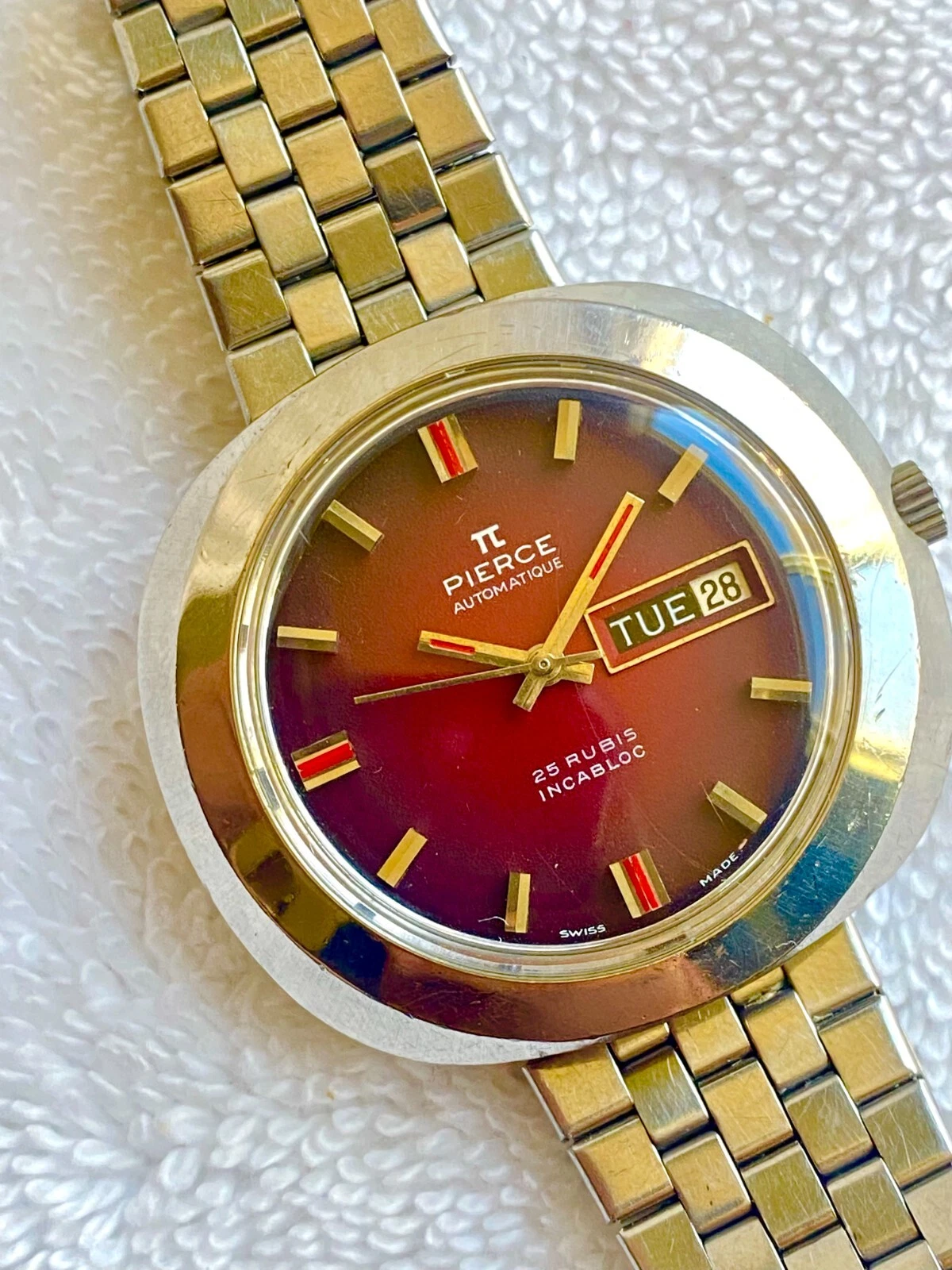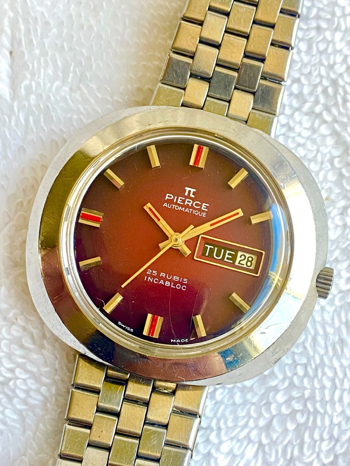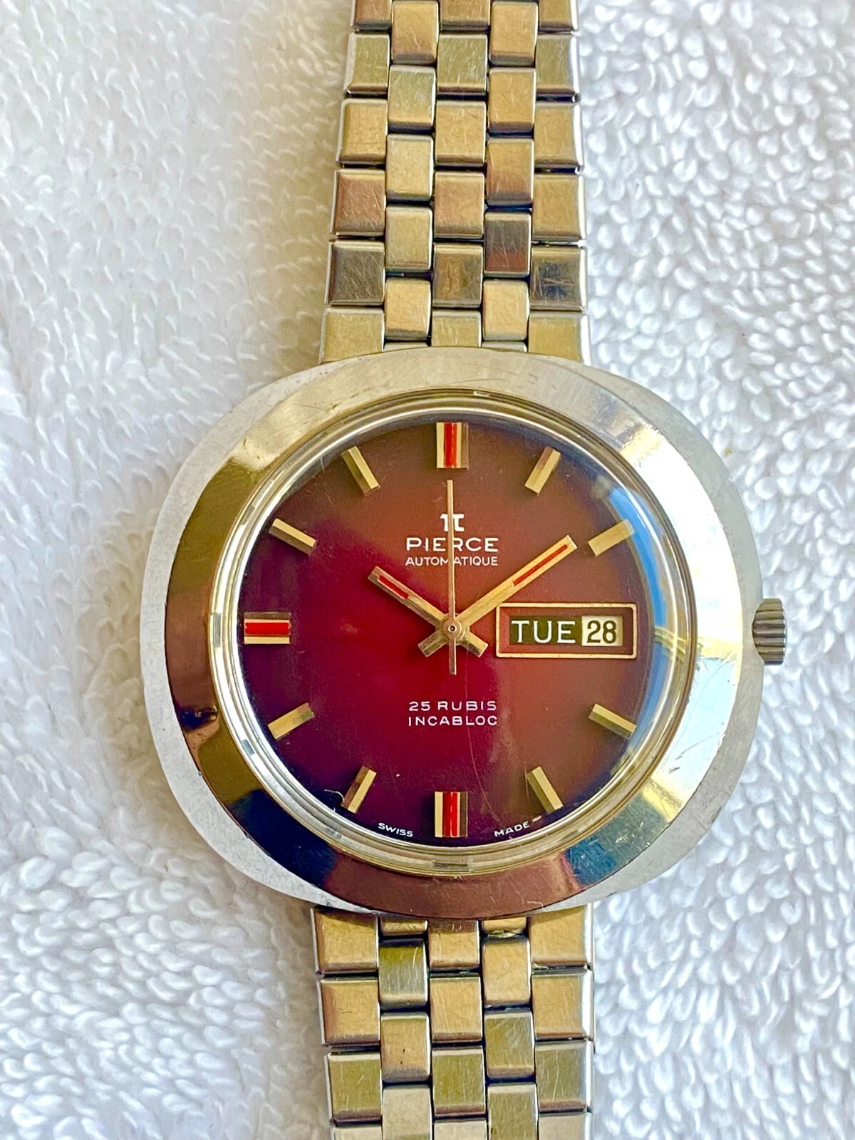 Vintage Pierce Burgundy Automatic 25 Jewels Day Date Steel Swiss Watch Serviced