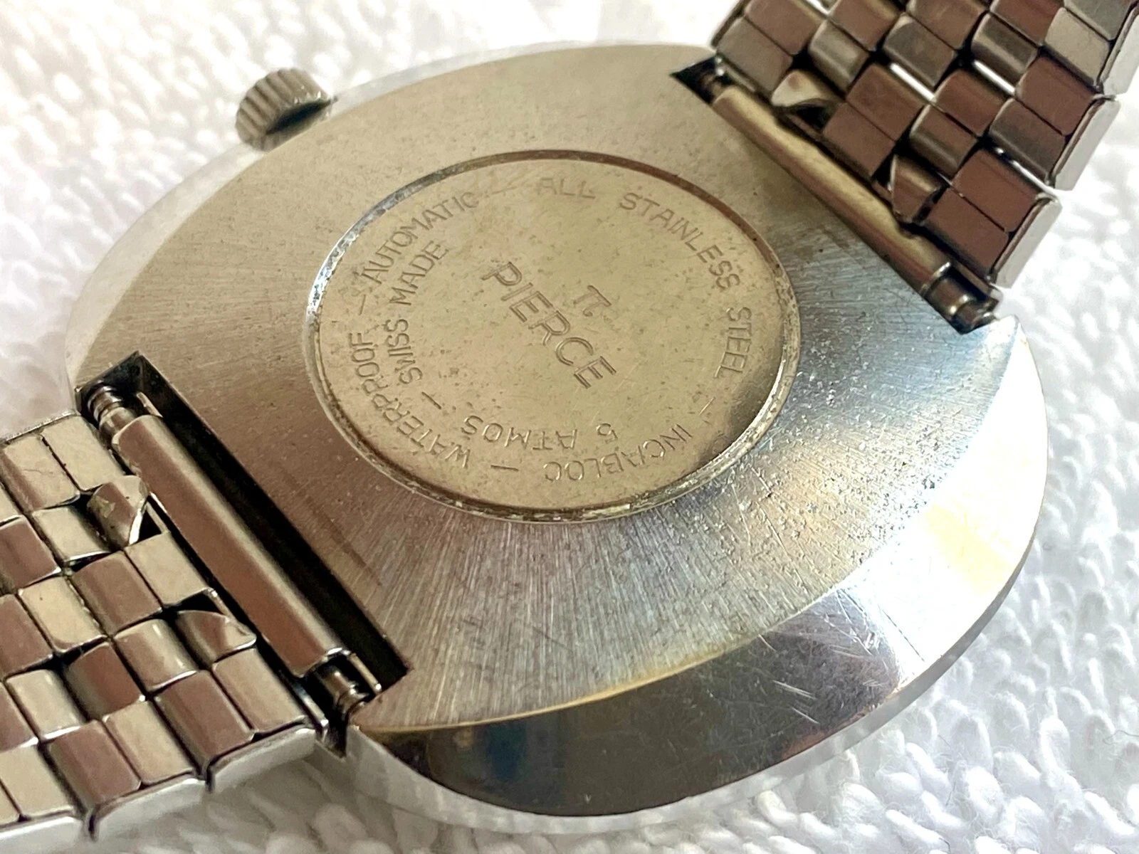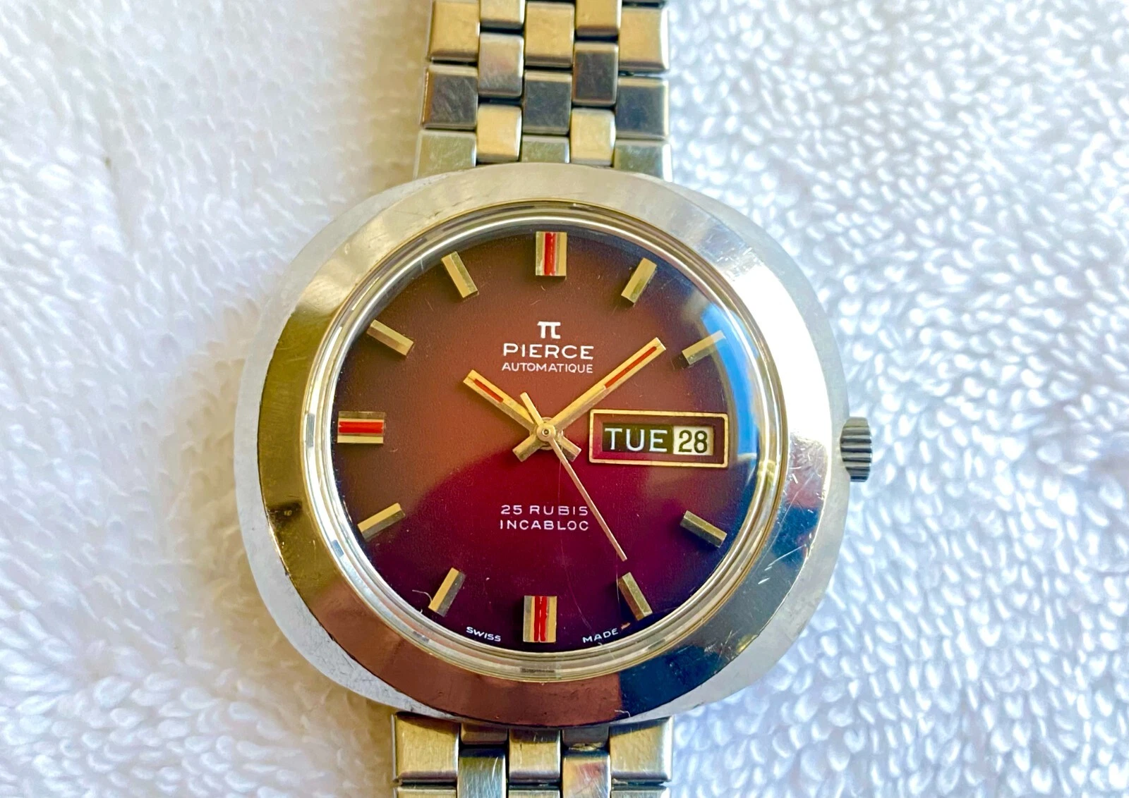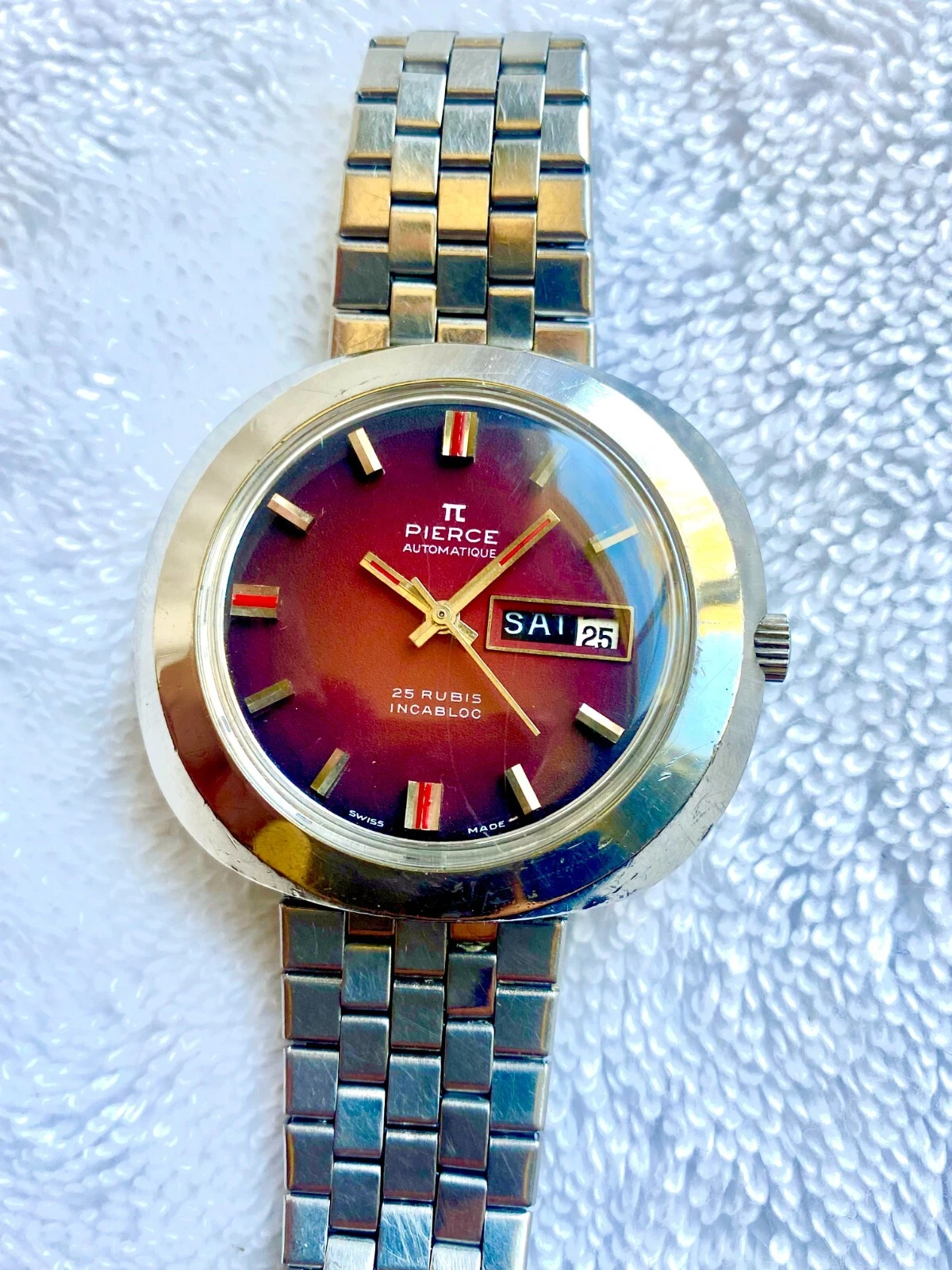 Vintage Pierce Burgundy Automatic 25 Jewels Day Date Steel Swiss Watch Serviced