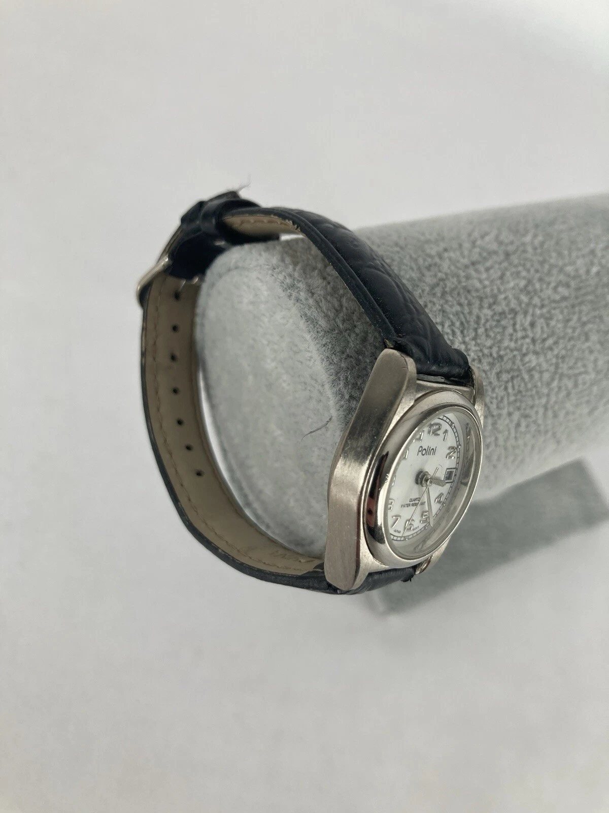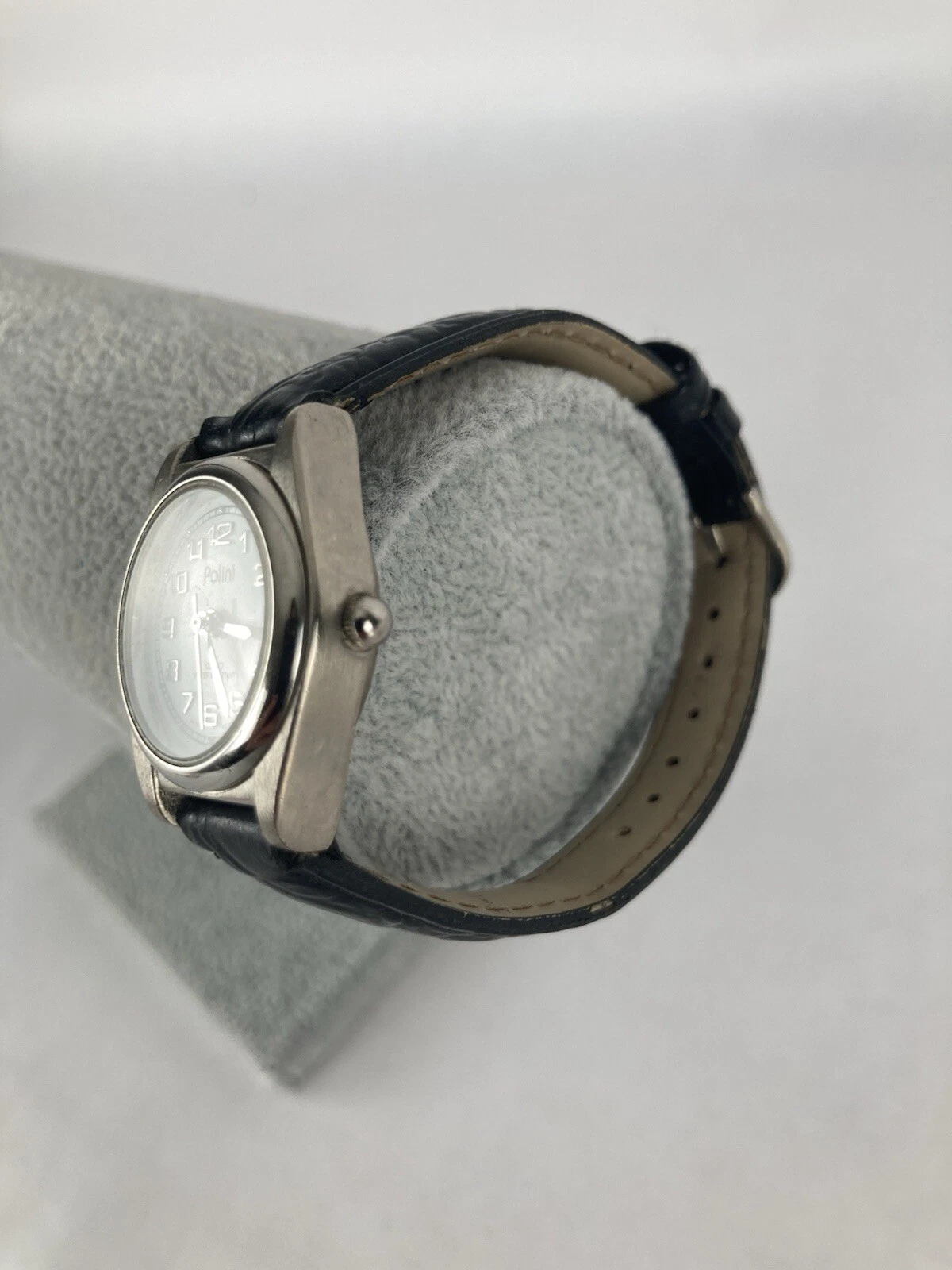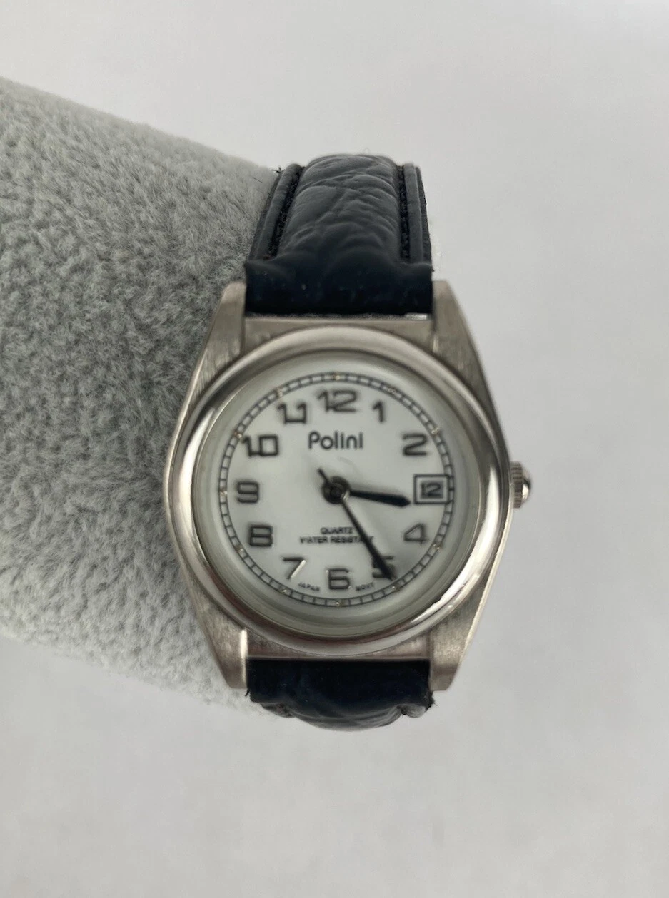 Polini 25mm Silver Tone Quartz Date Watch w/Black Leather Band & Battery