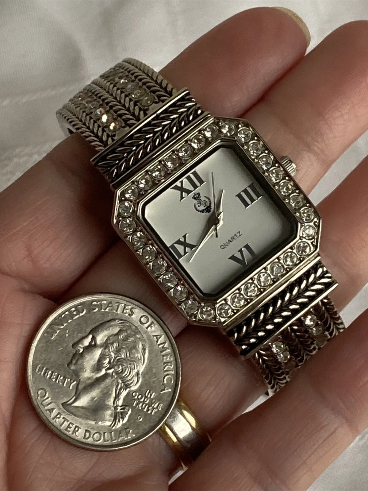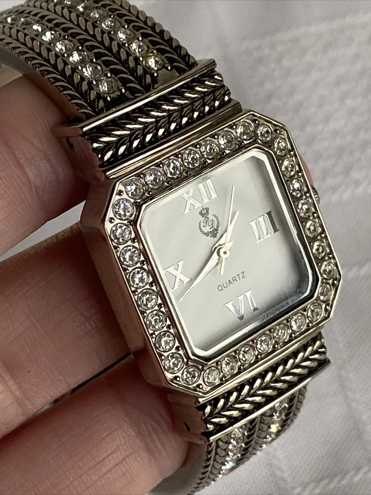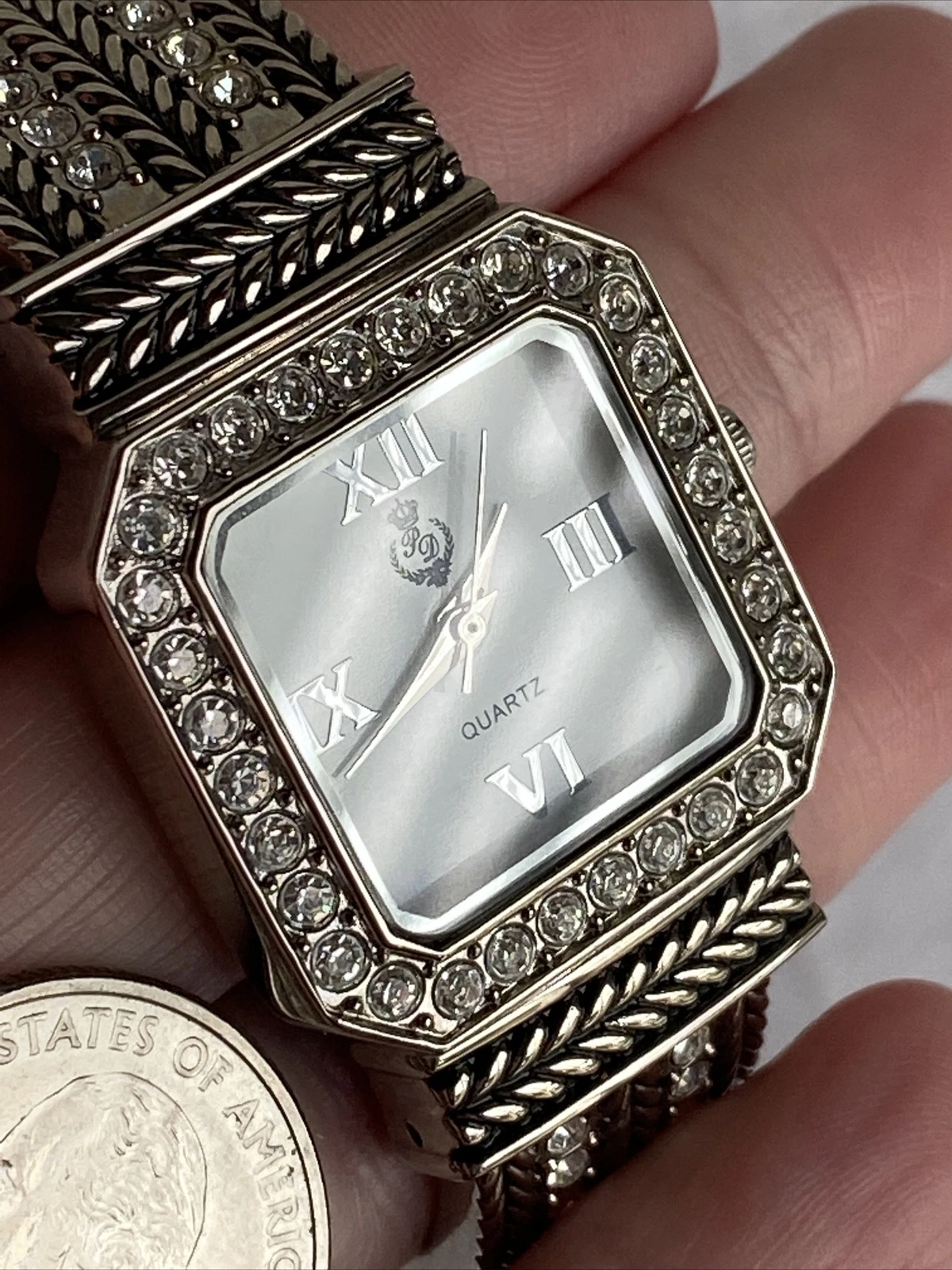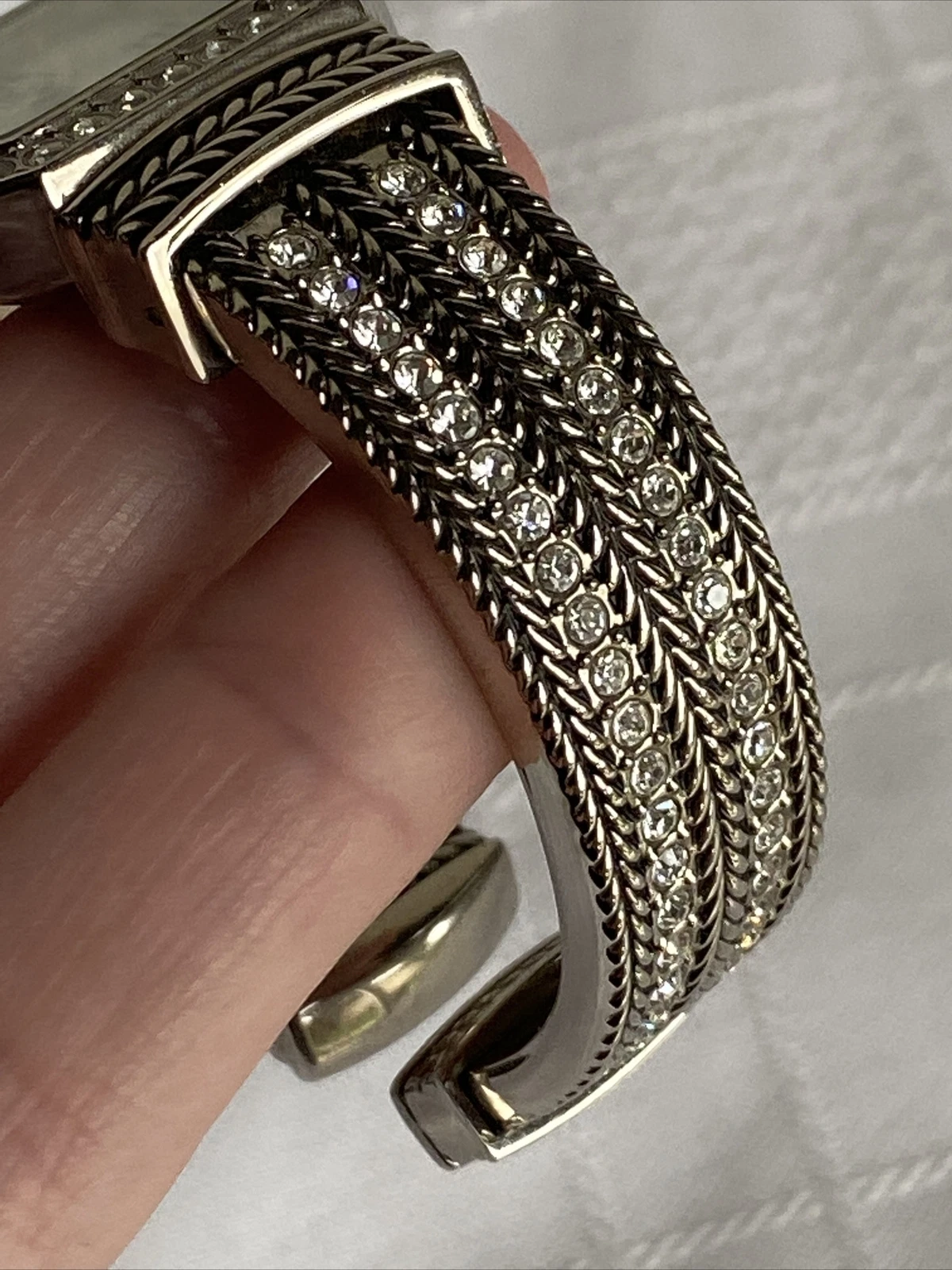 Premier Designs Tribute Watch Cuff Antiqued Silver Tone Pave Frame Needs Battery