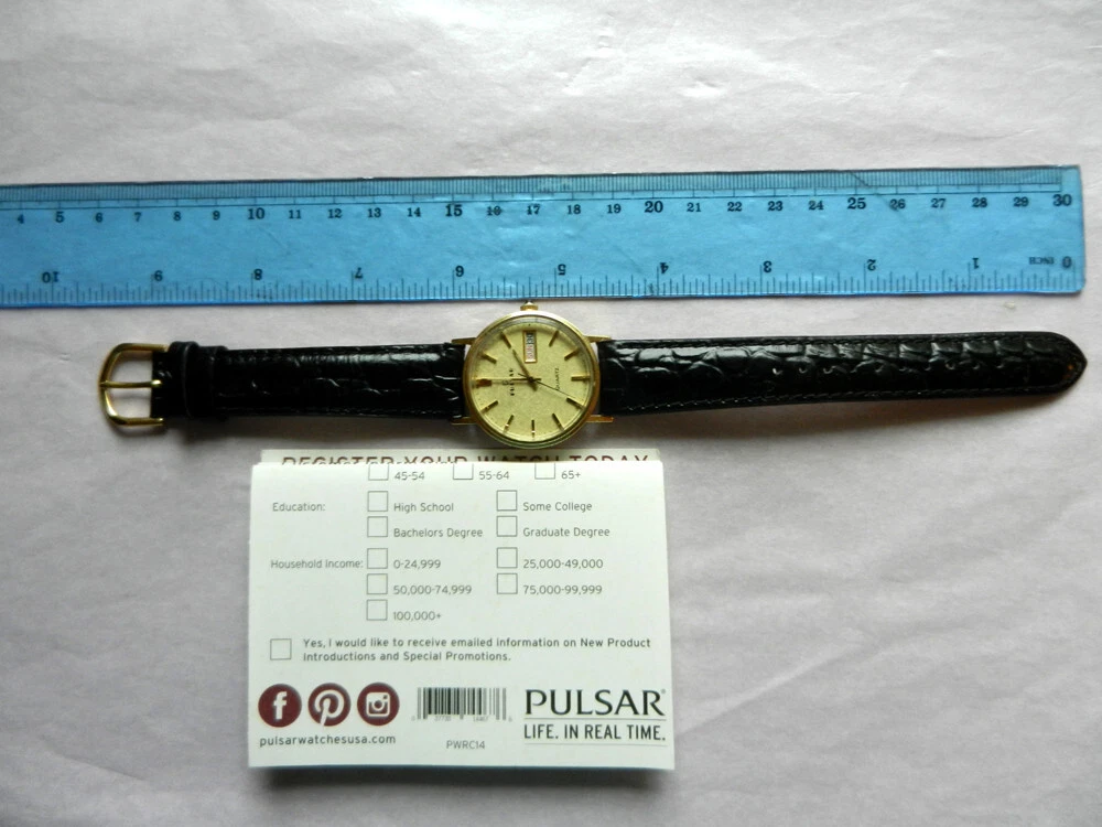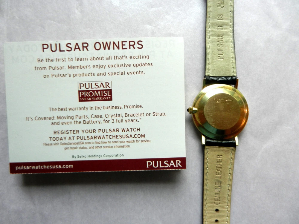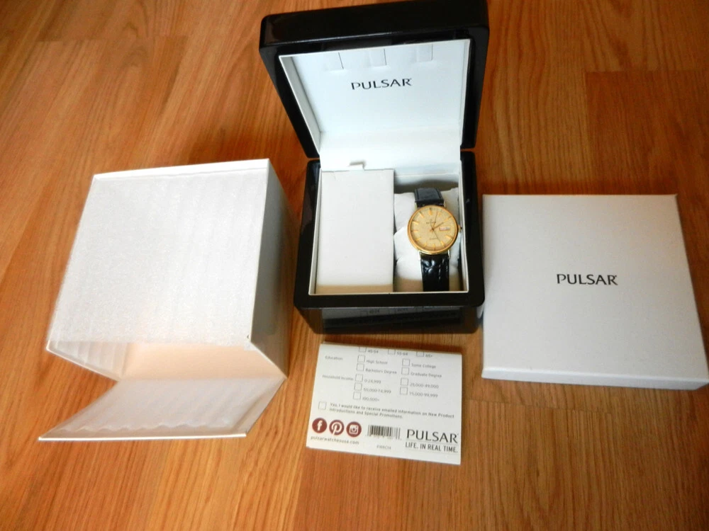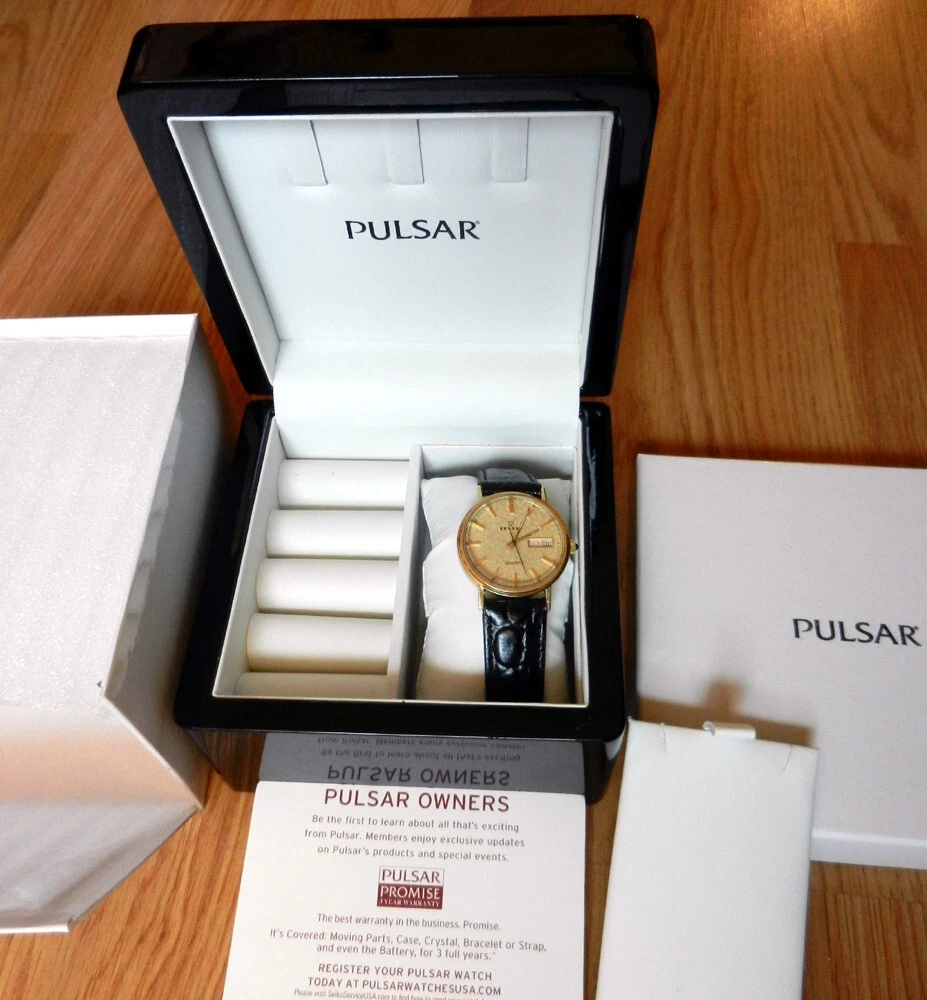 14K/KT/CT Solid Yellow Gold Pulsar/Seiko Quartz Date Day Boxes Papers Strap Rare