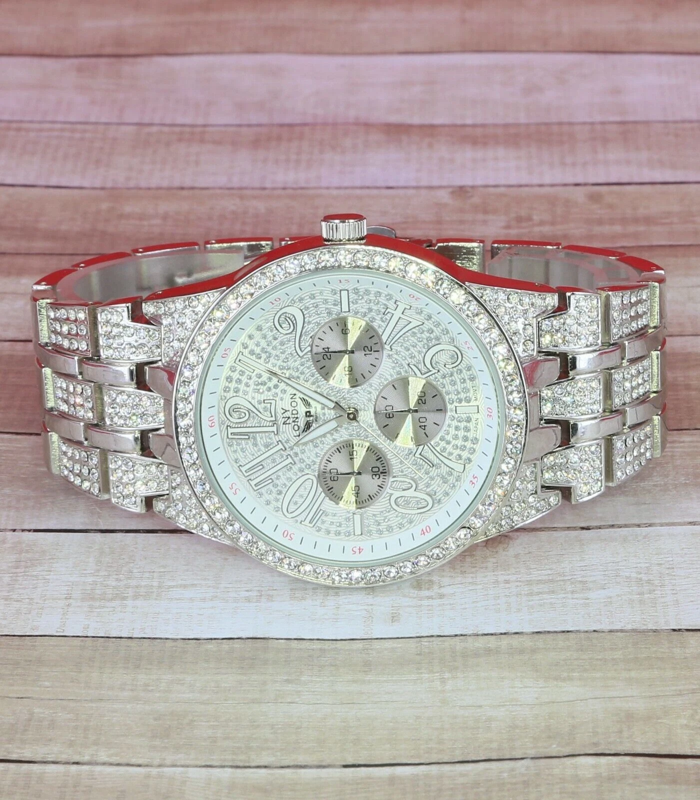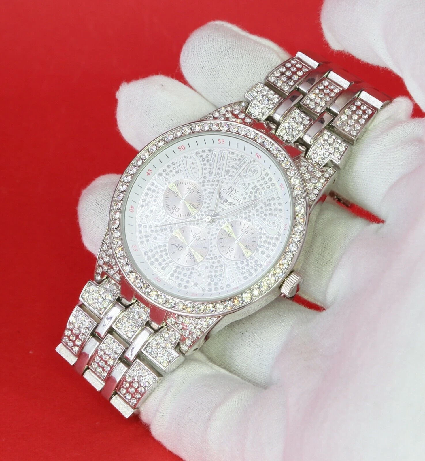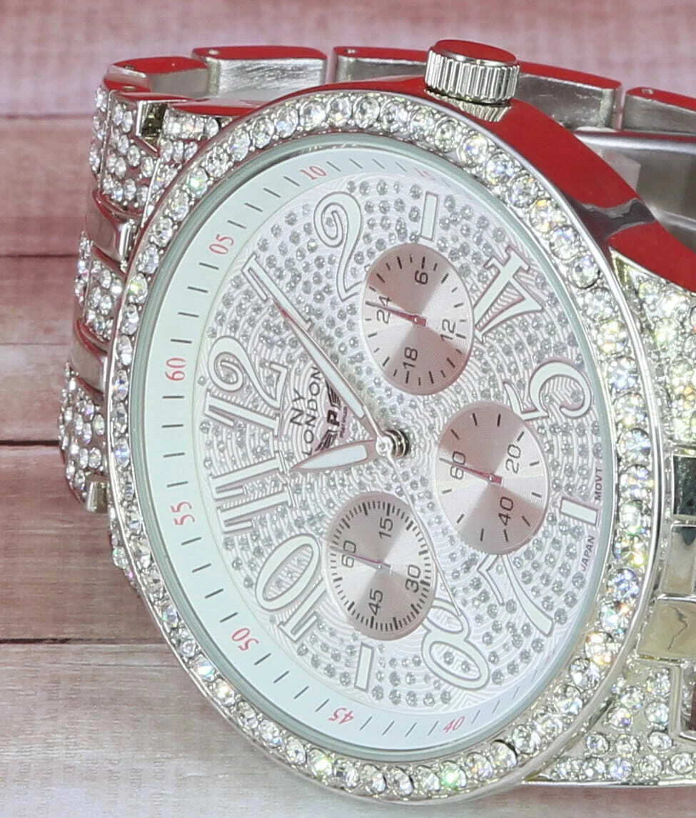 NY LONDON Men Iced Hip Hop Silver Finish Metal Link Band Rapper Watch New