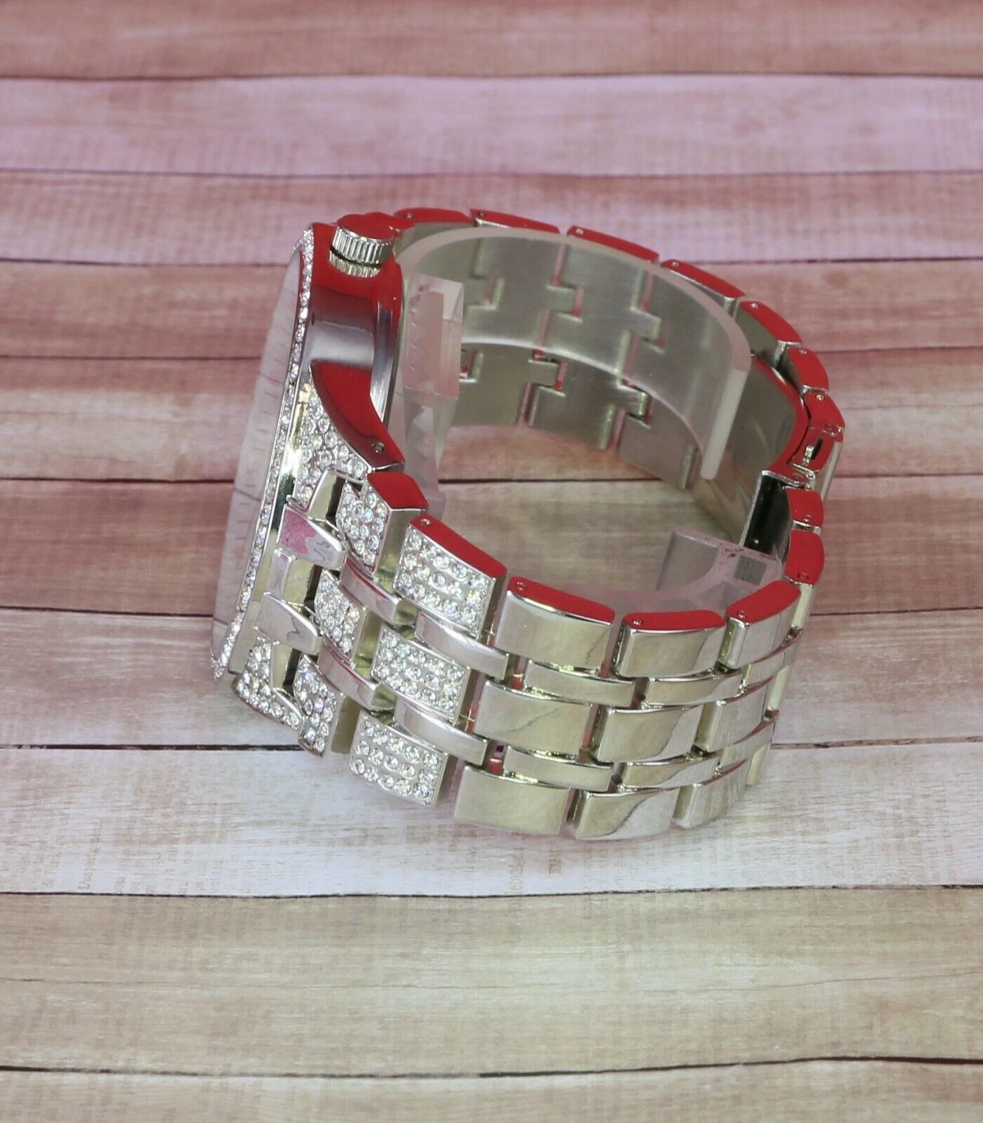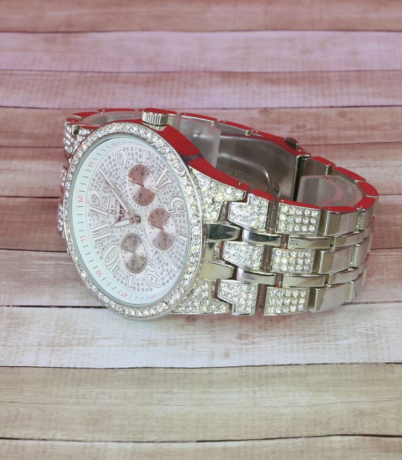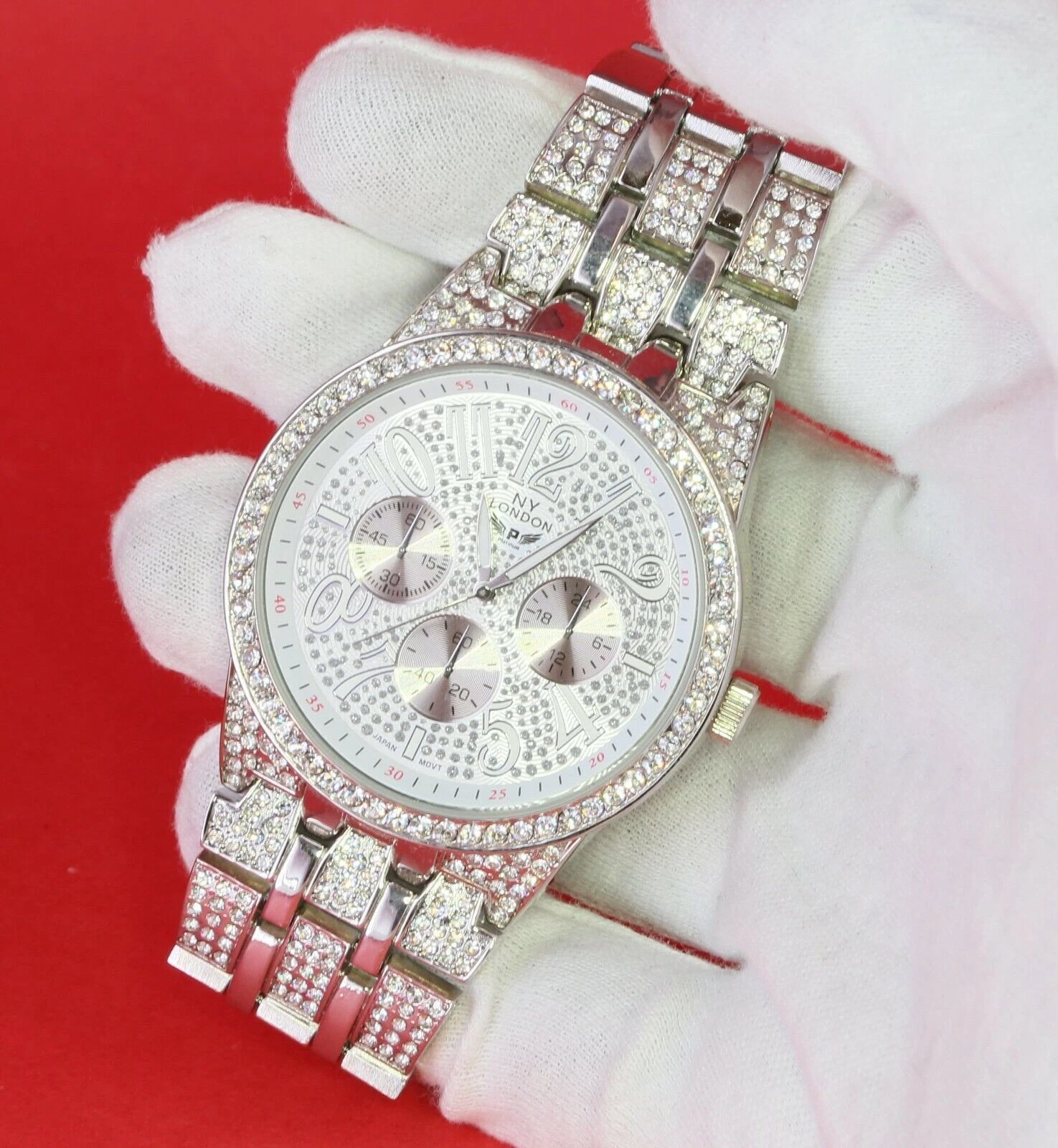 NY LONDON Men Iced Hip Hop Silver Finish Metal Link Band Rapper Watch New