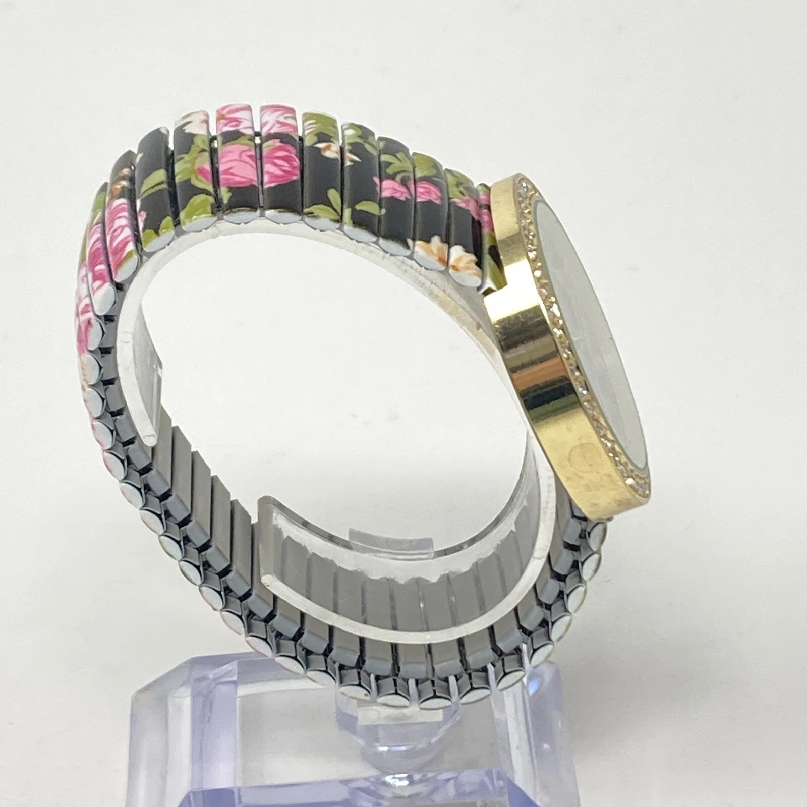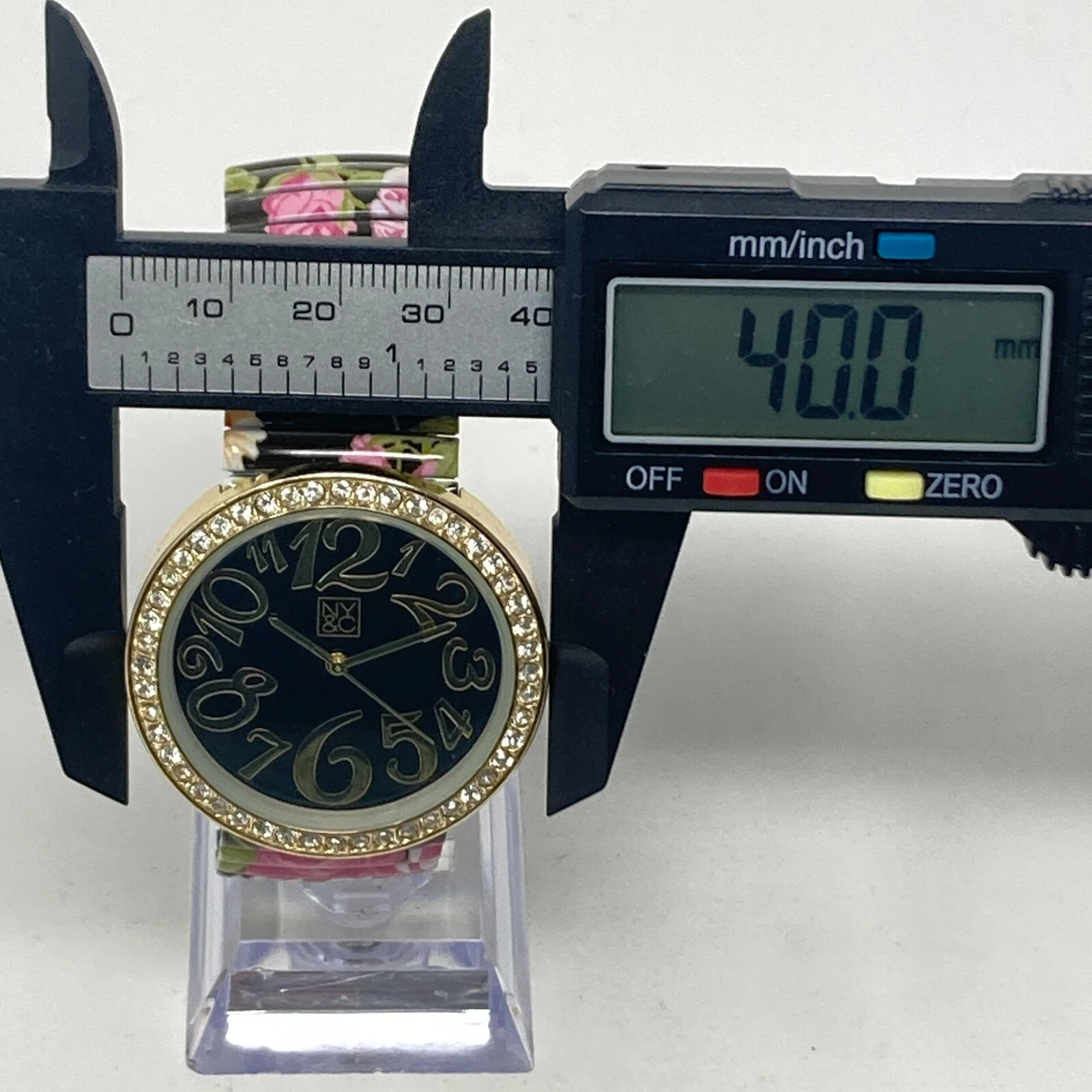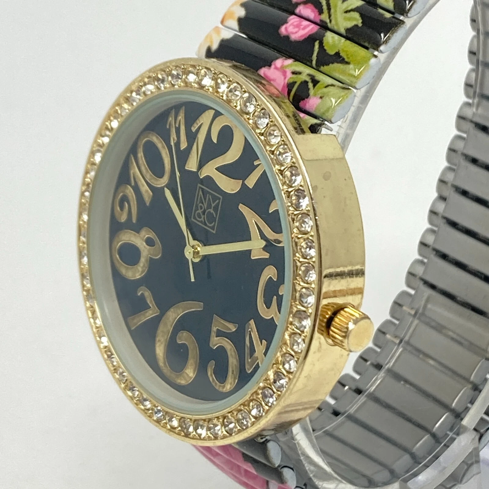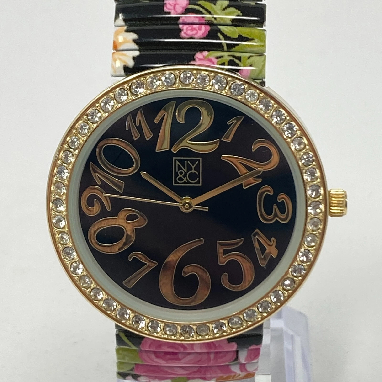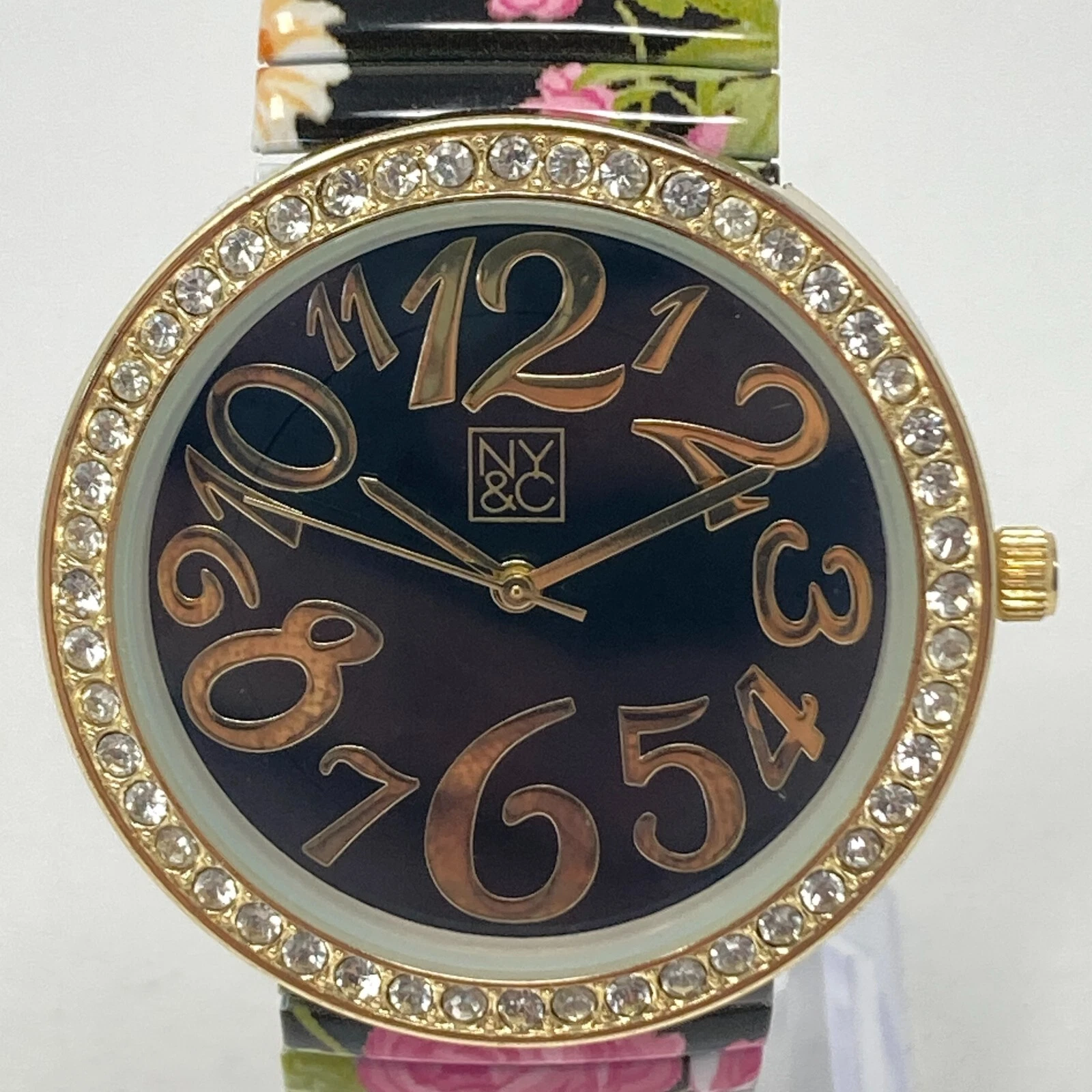 NY&C Watch Women 40mm Gold Tone Floral Stretch Band Black Dial Bling New Battery