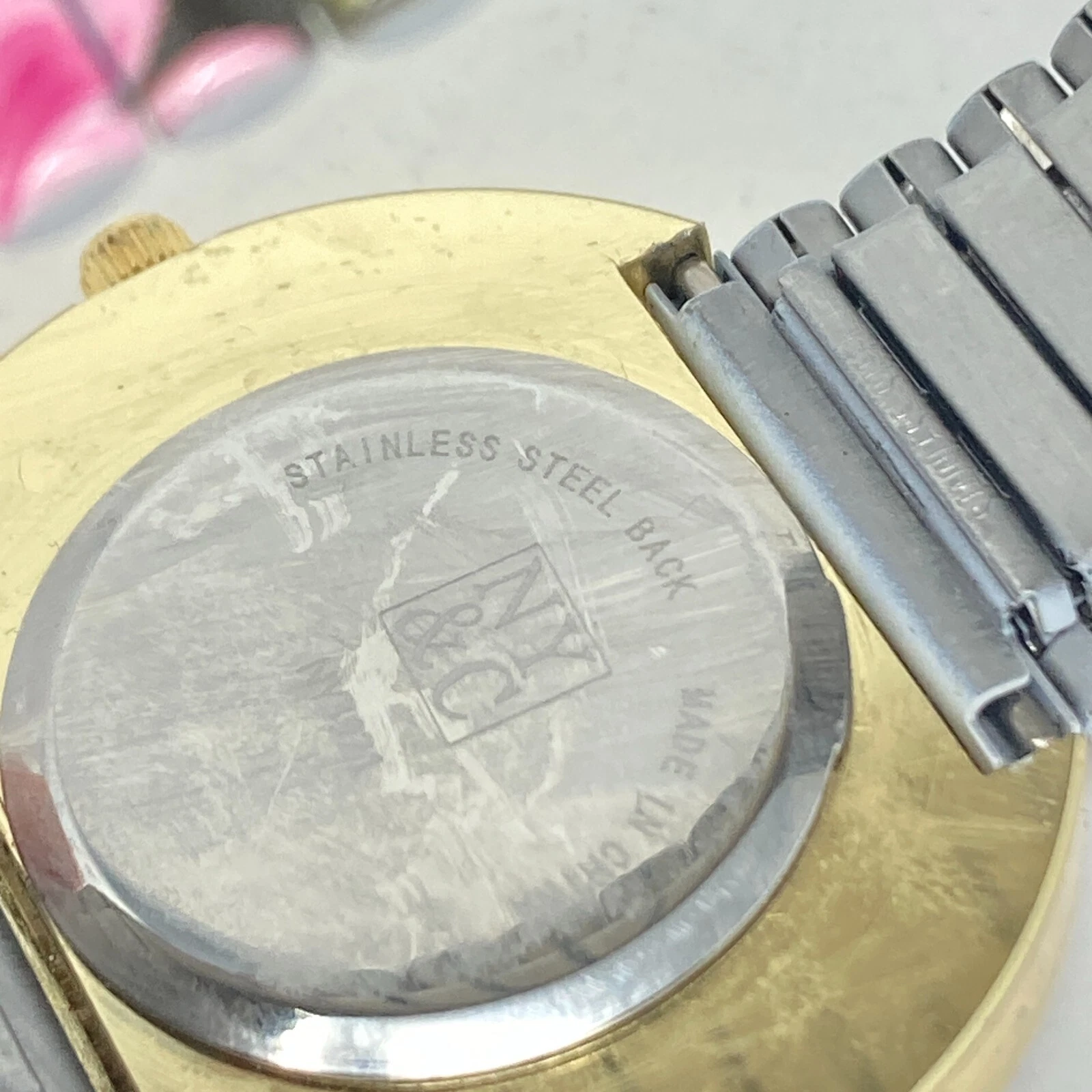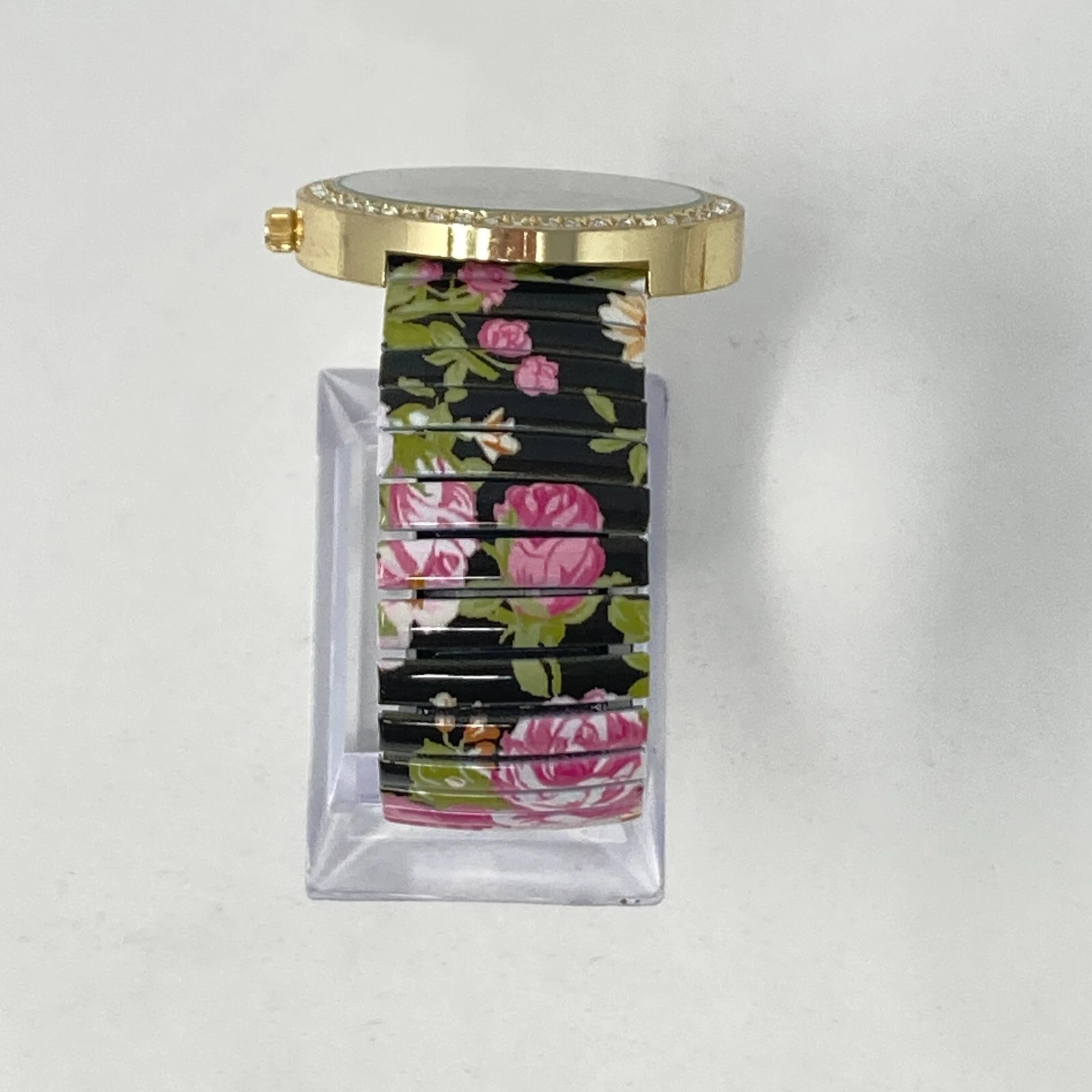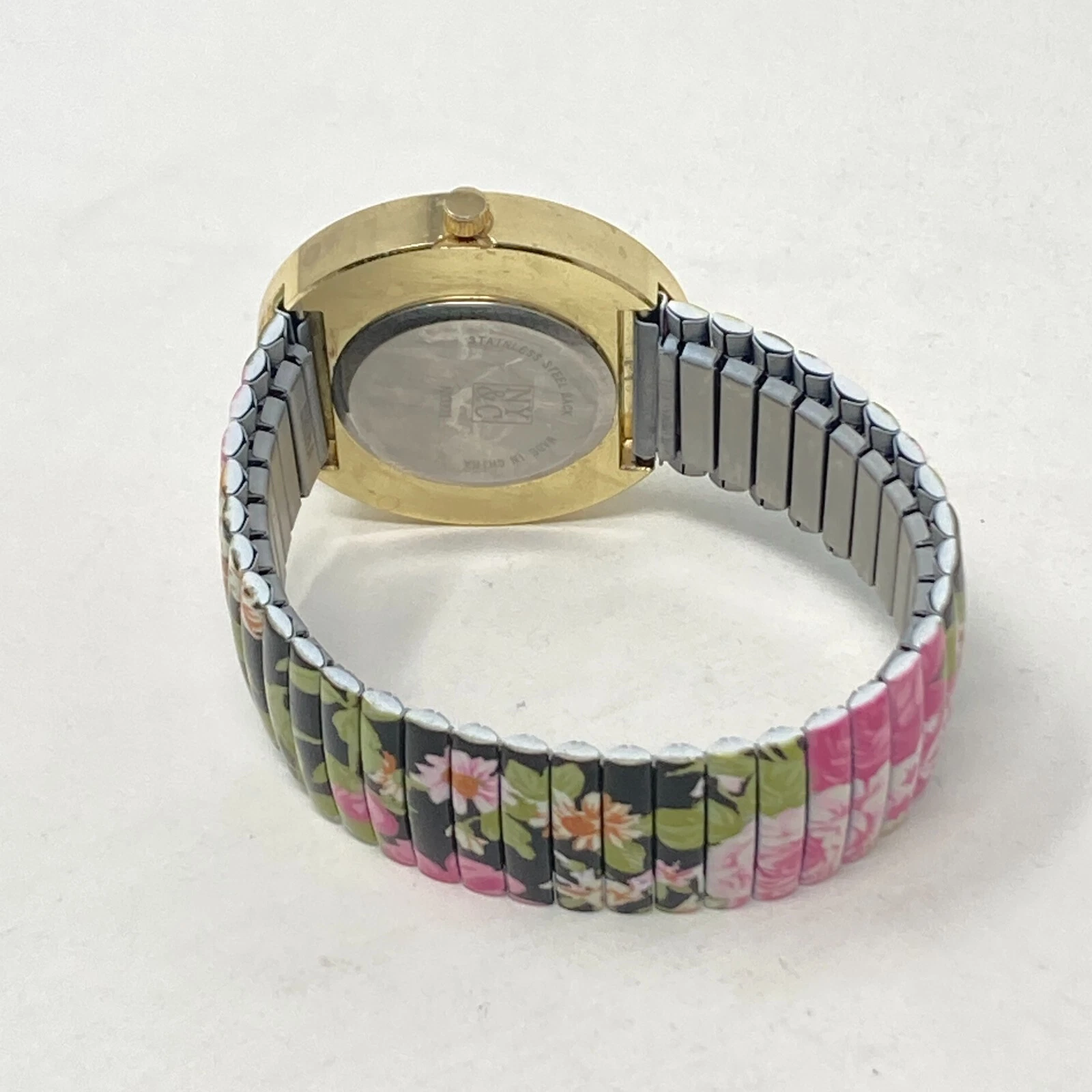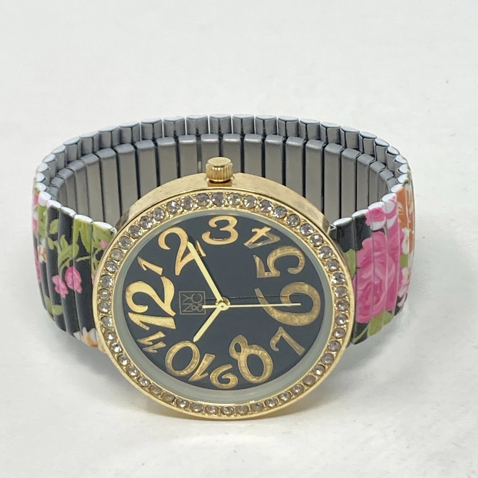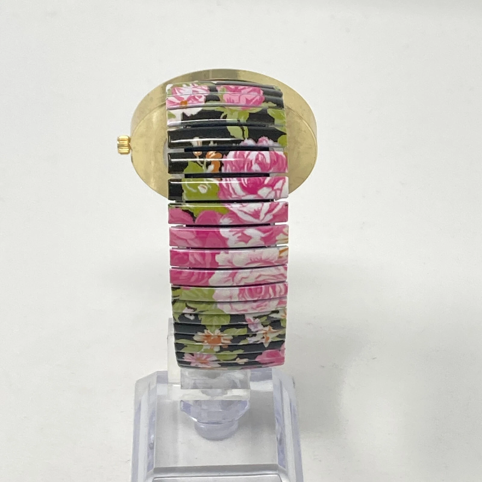 NY&C Watch Women 40mm Gold Tone Floral Stretch Band Black Dial Bling New Battery