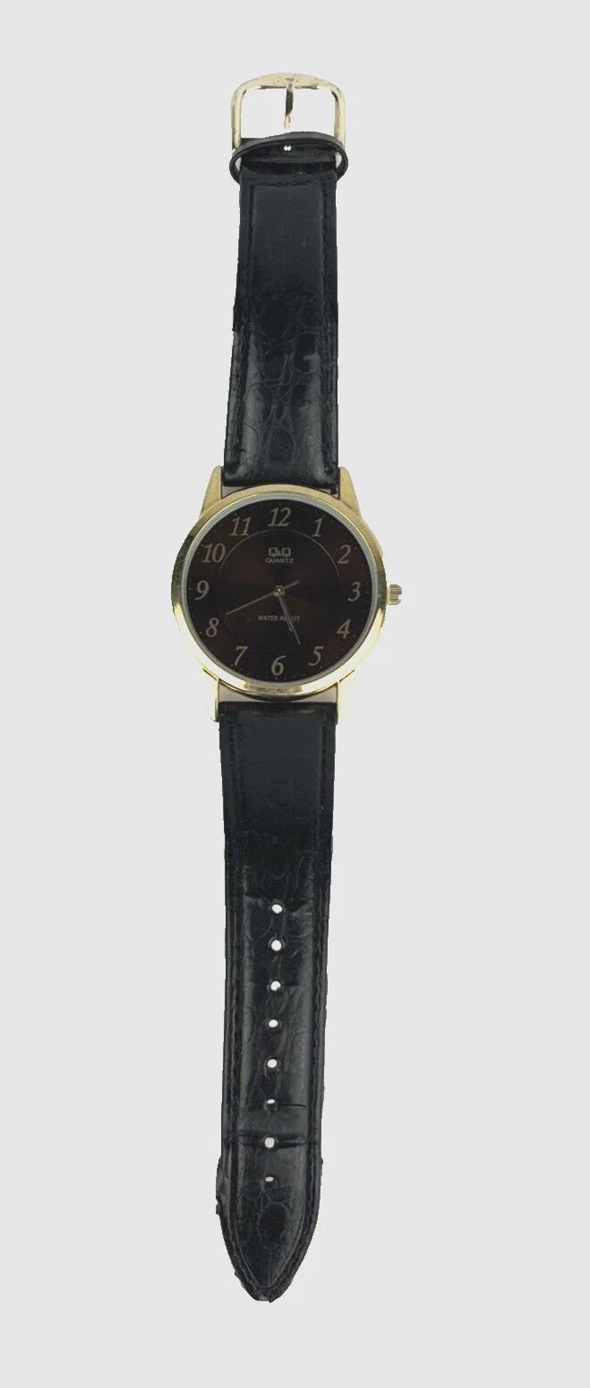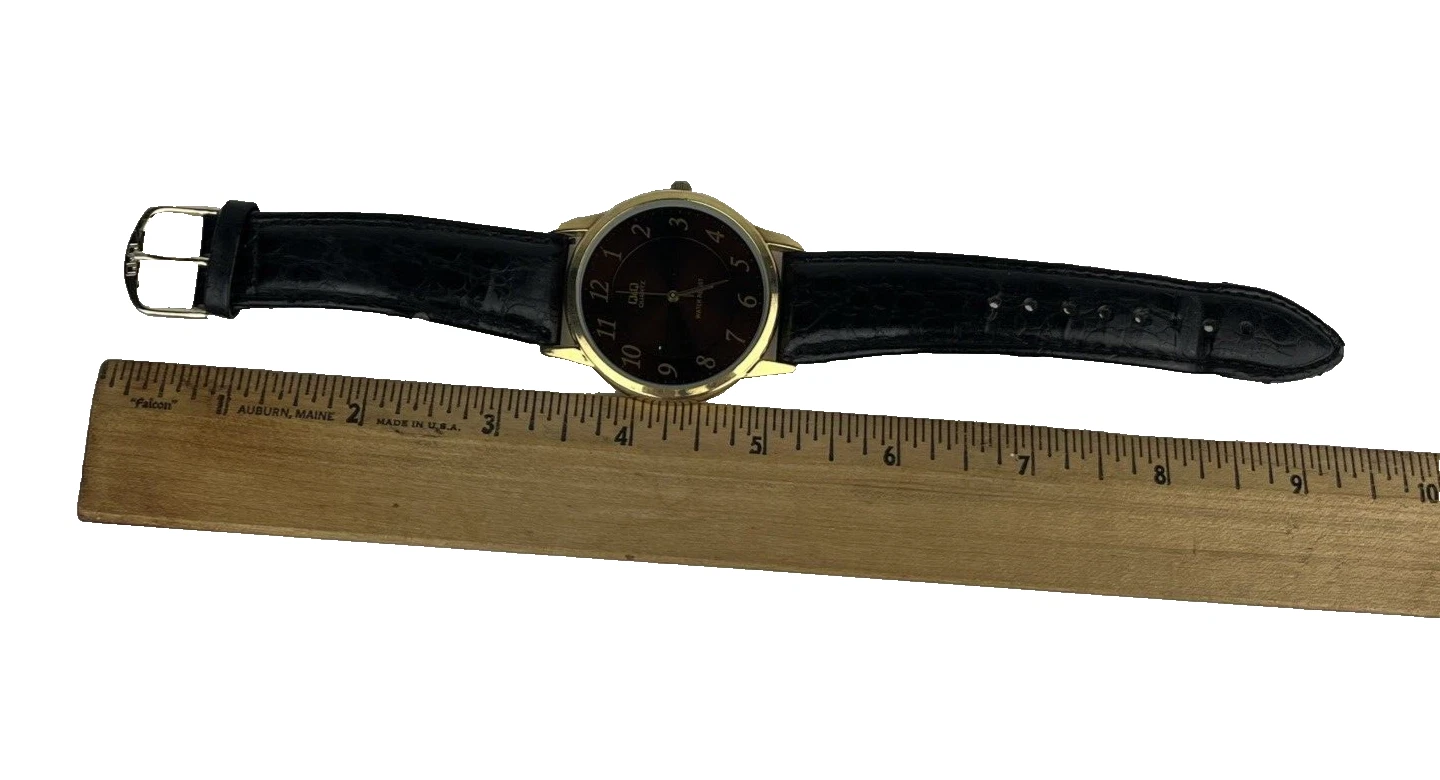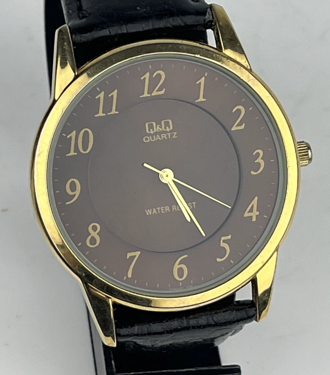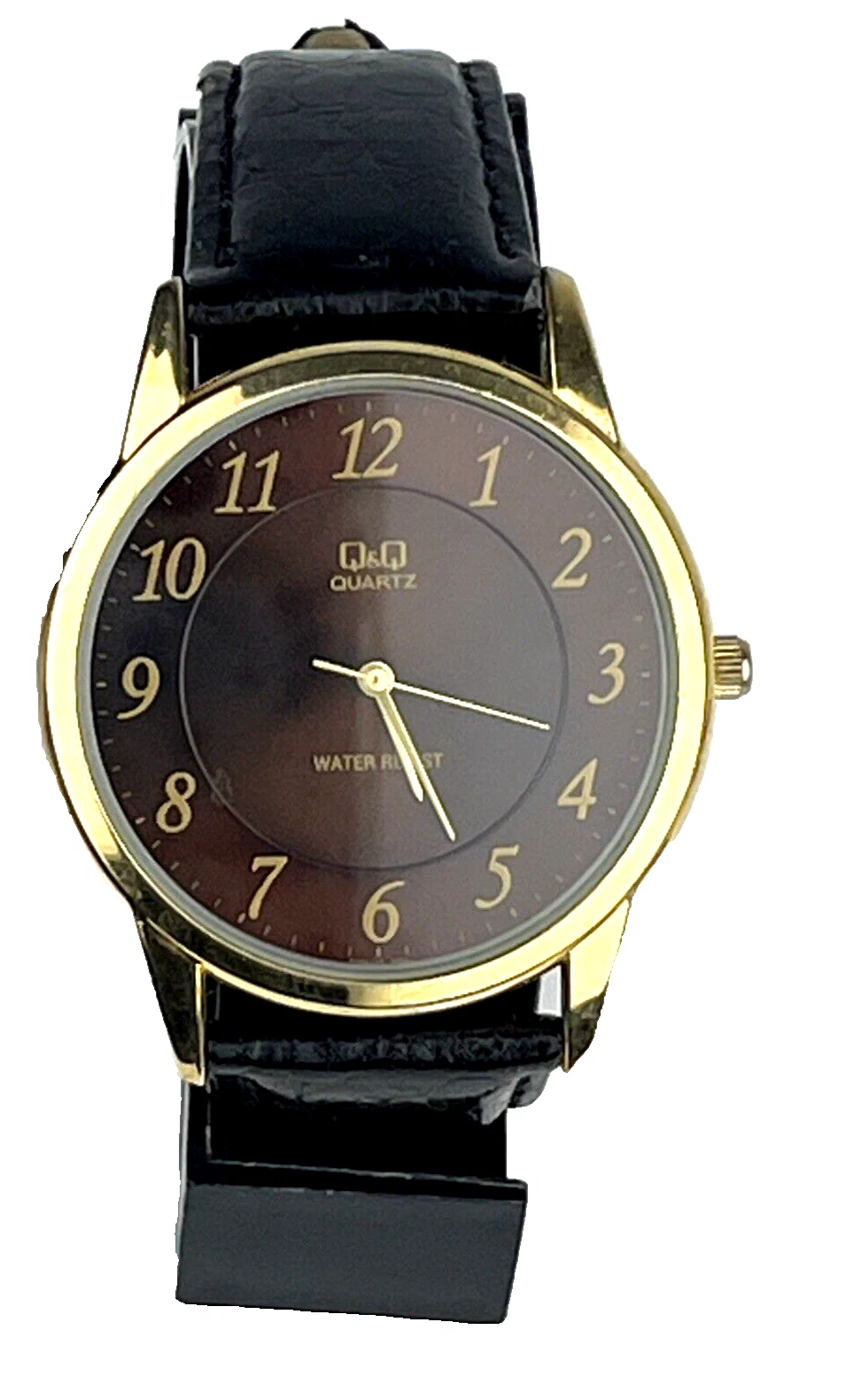 Q&Q Men's Watch Gold Tone Black Band Brown Dial 41mm New Battery Running