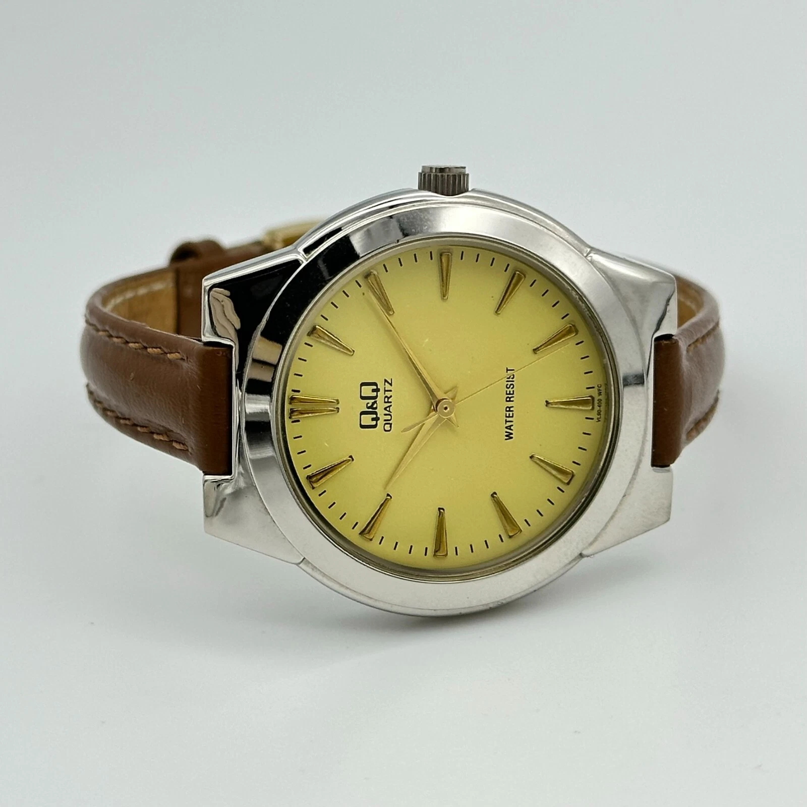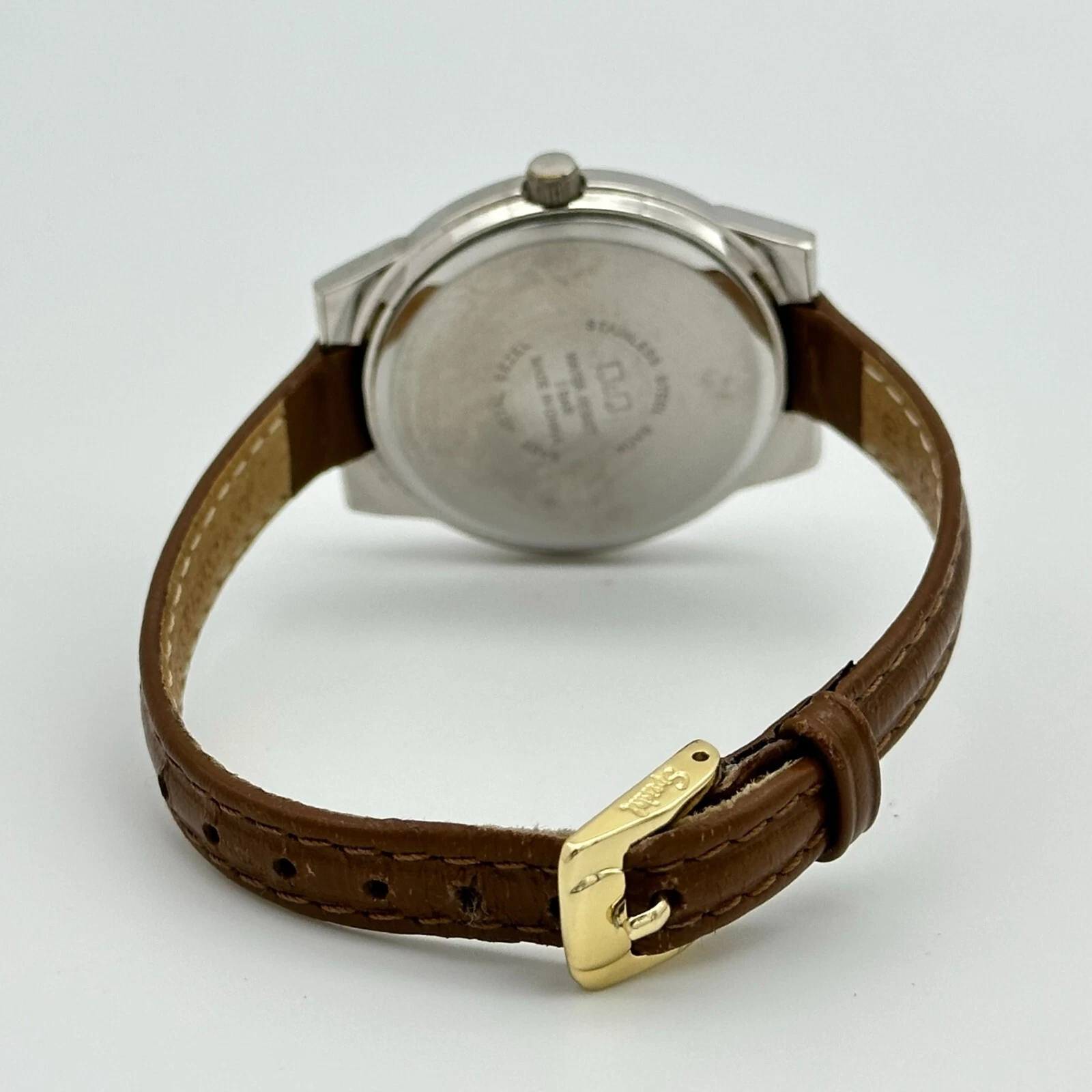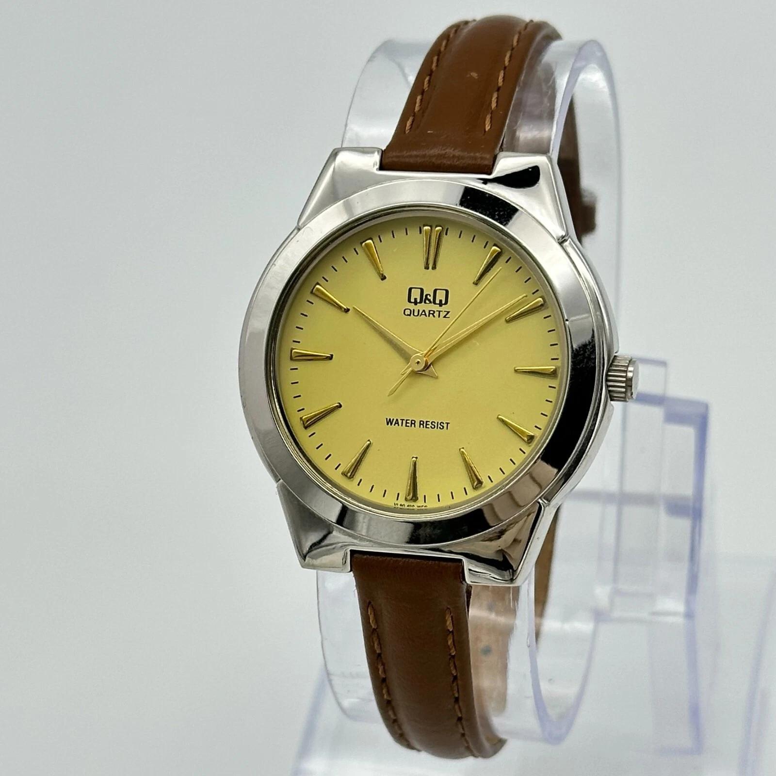 Ladies Q&Q Silver Tone, Beige Dial, Classic Brown Leather Watch, 34mm, Quartz