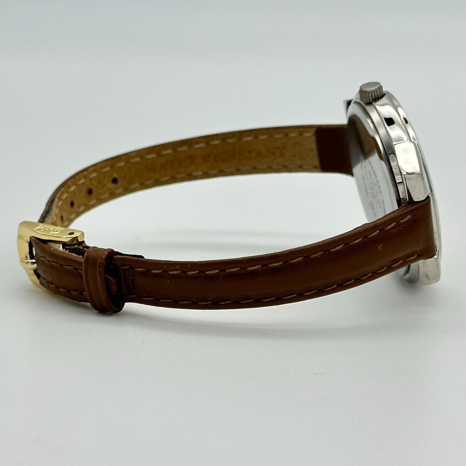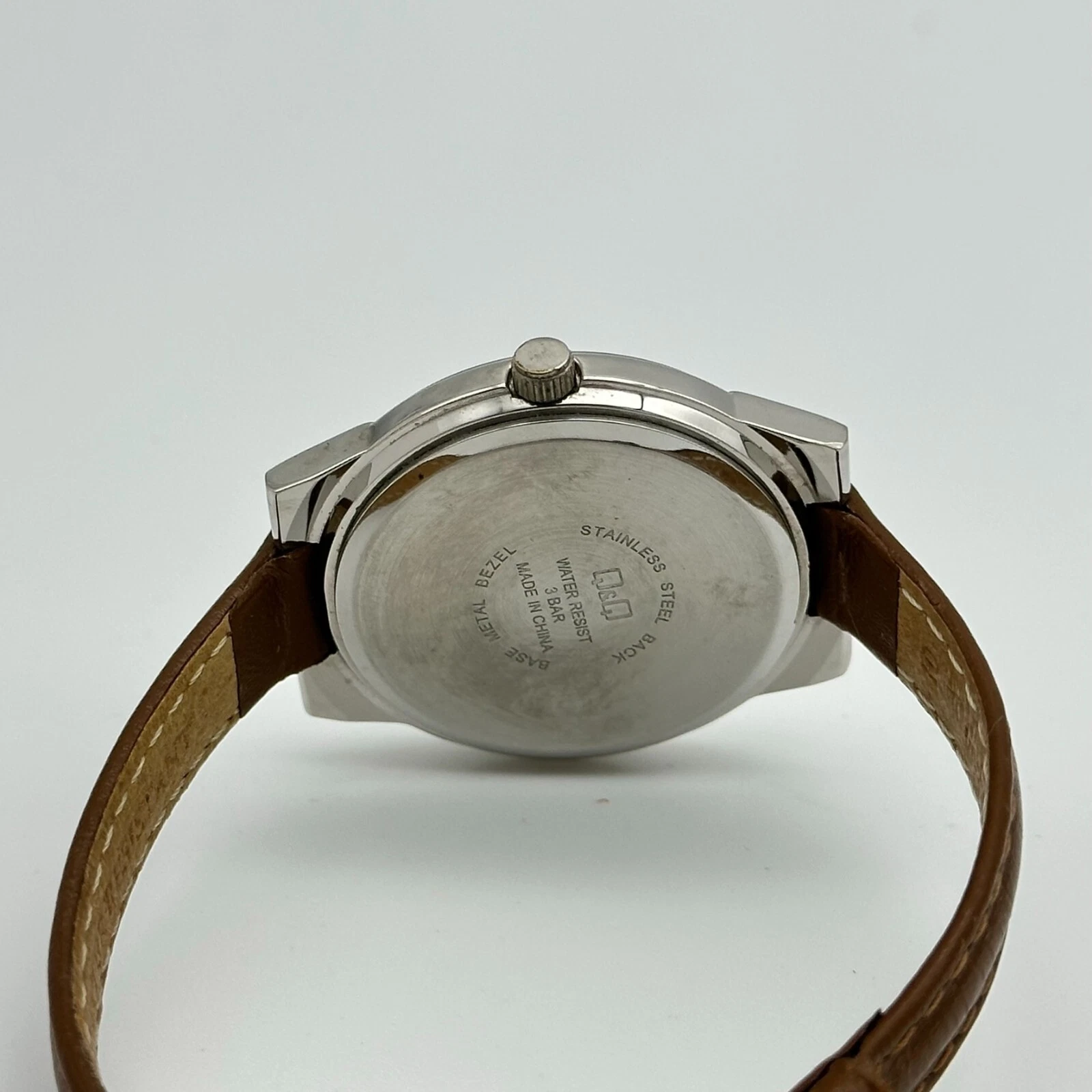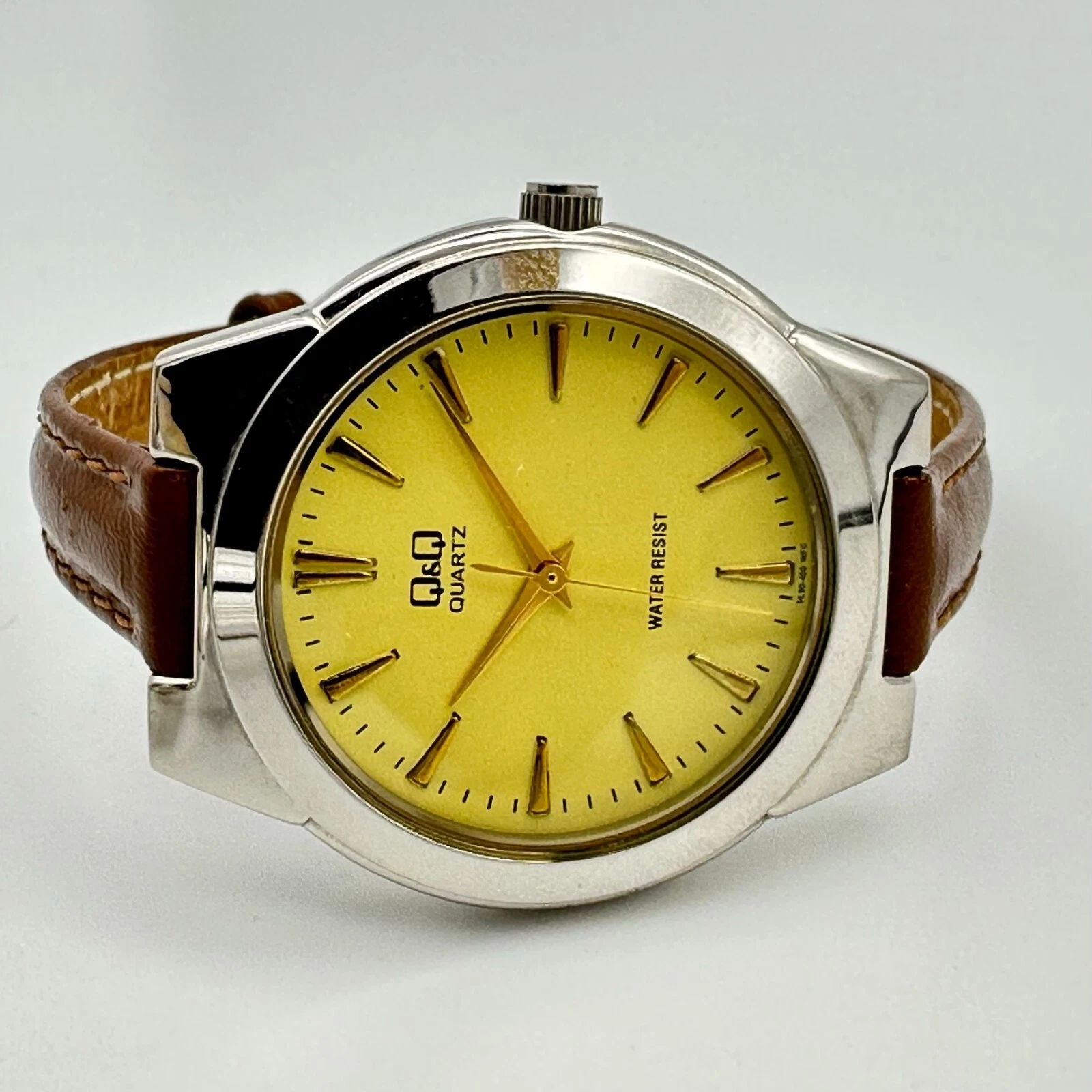 Ladies Q&Q Silver Tone, Beige Dial, Classic Brown Leather Watch, 34mm, Quartz