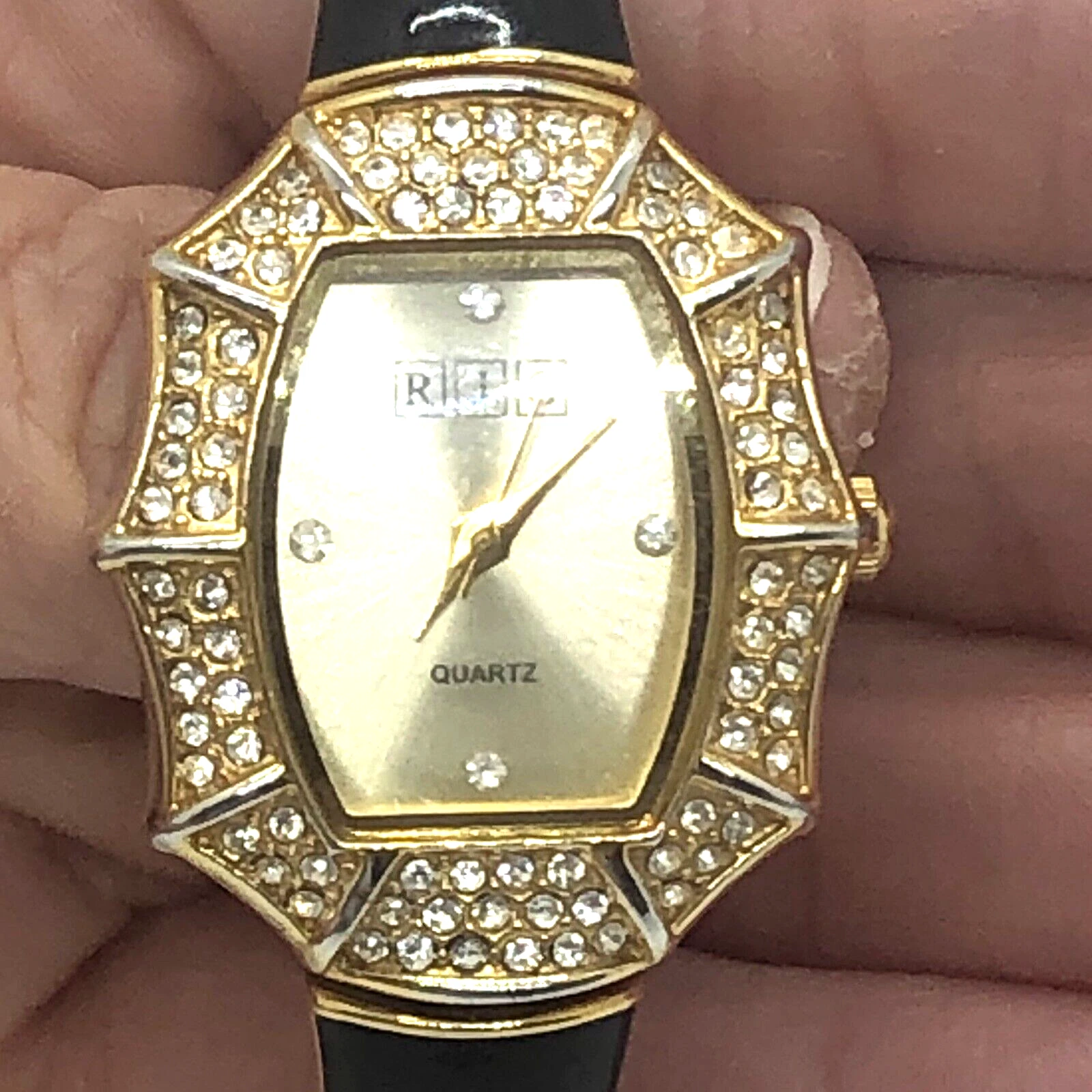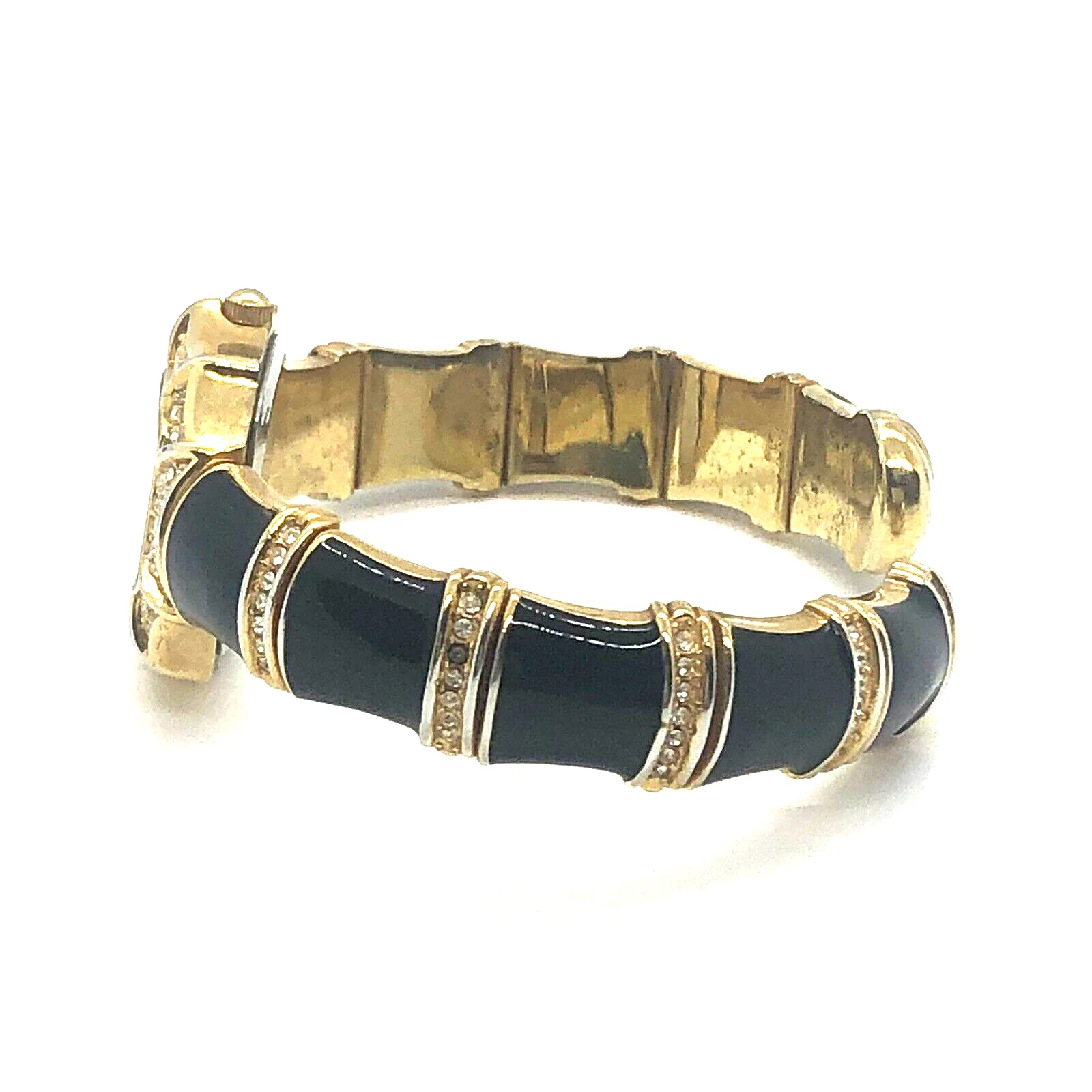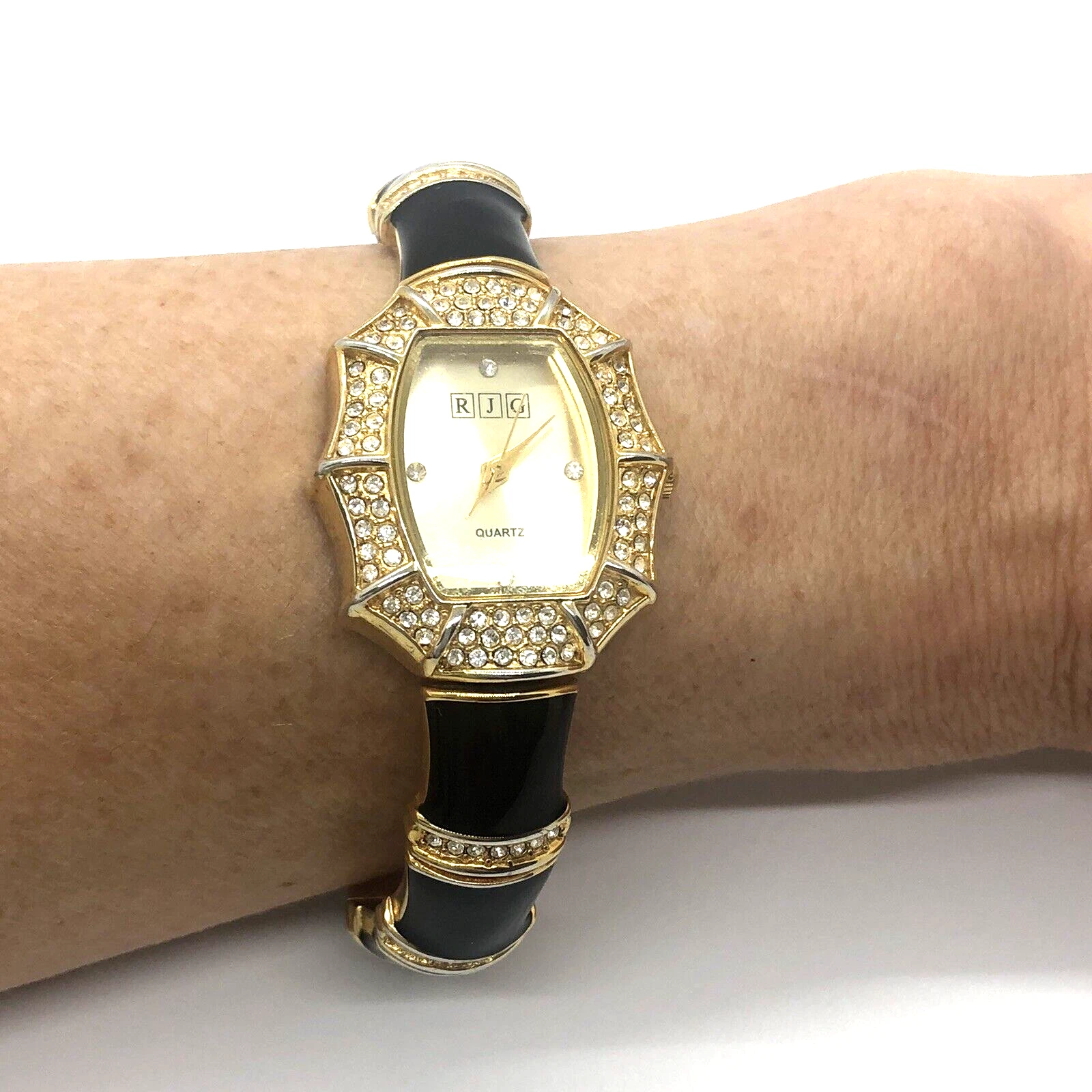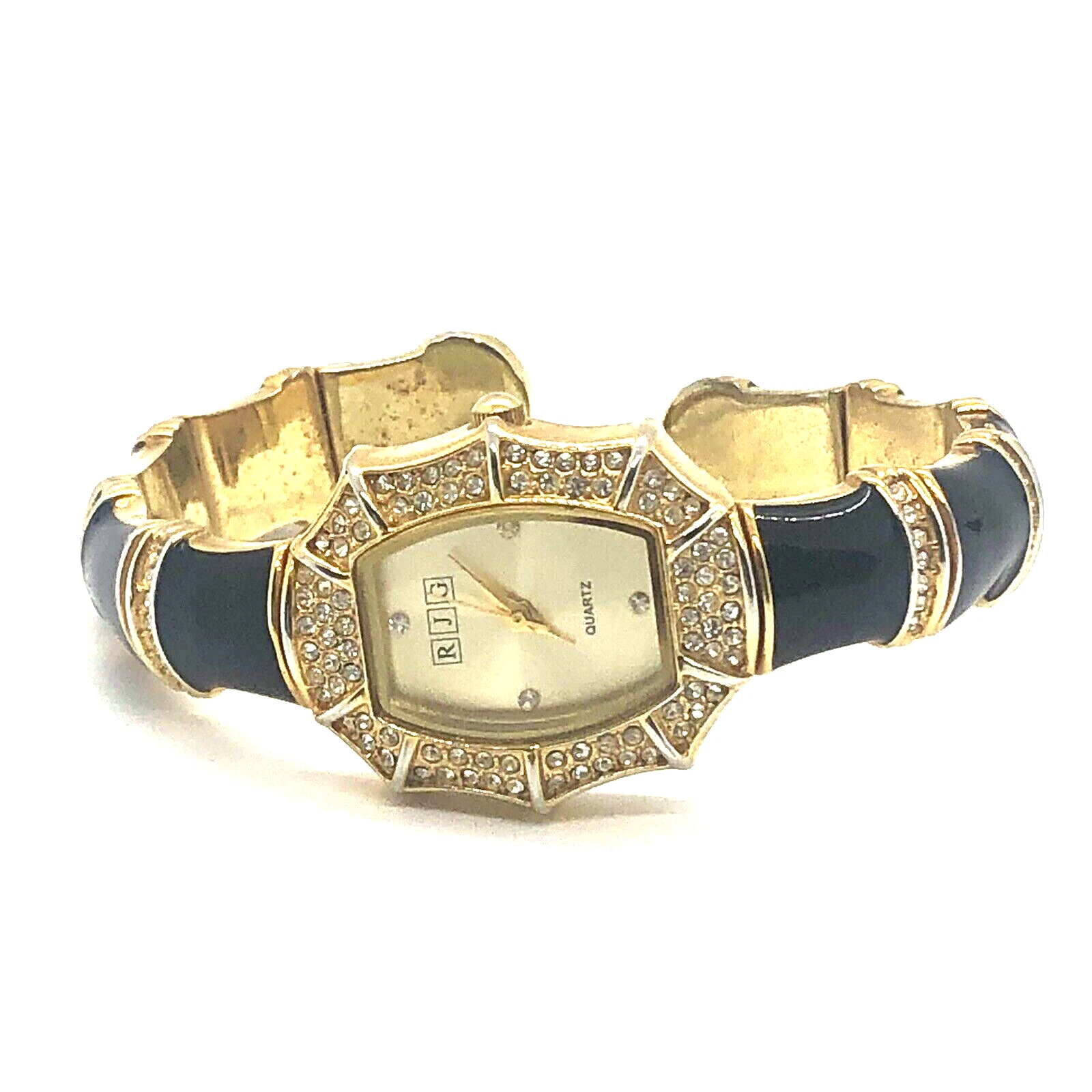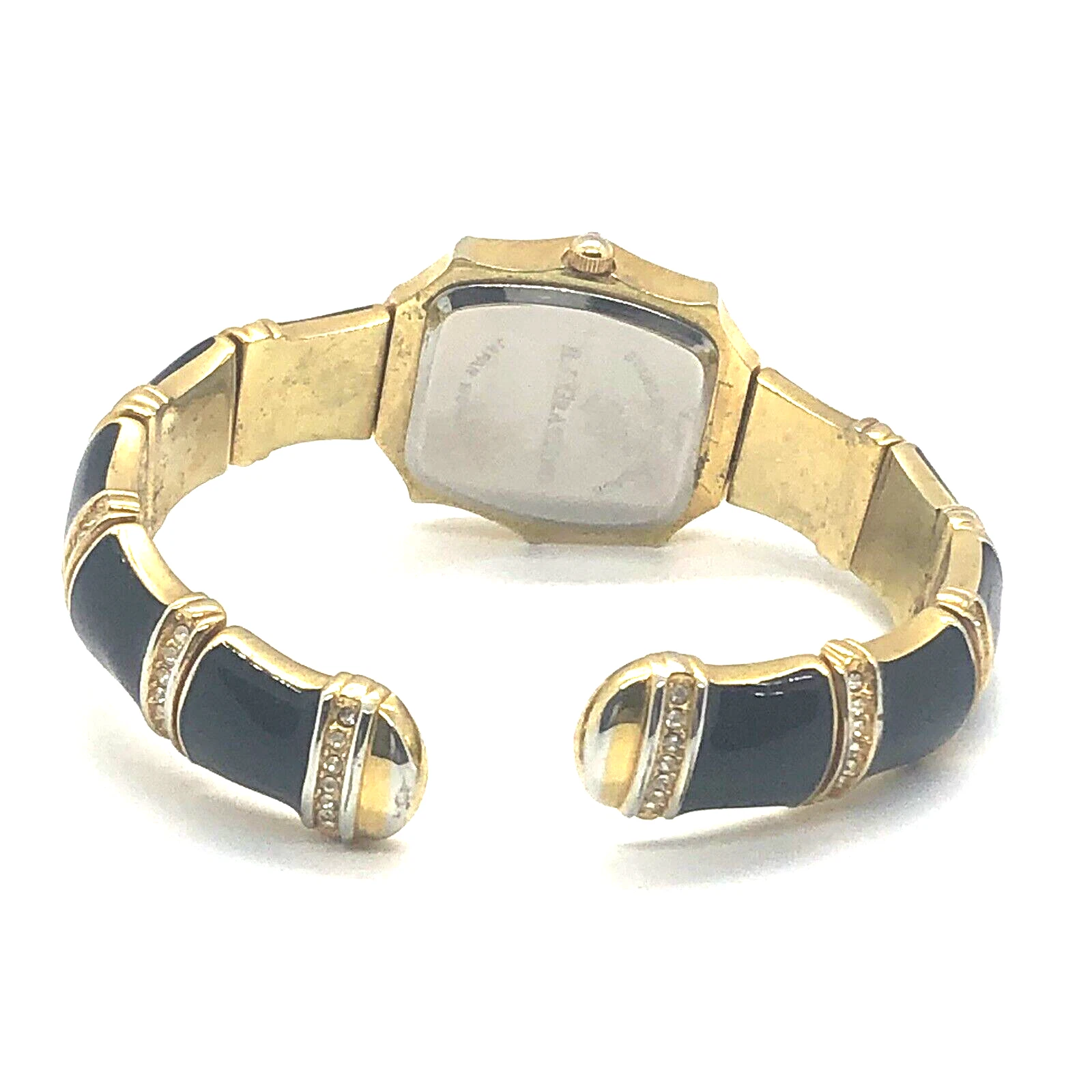 R.J. Graziano Black Enamel & Crystals Gold Tone Ladies Cuff Wristwatch AS IS