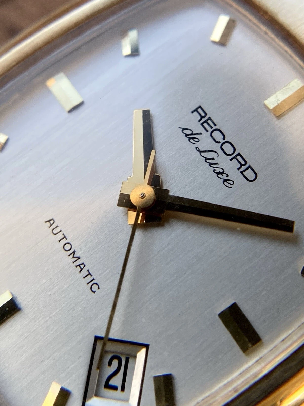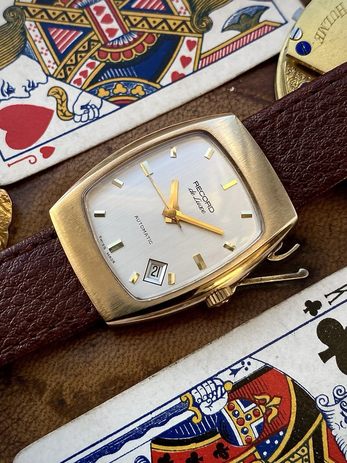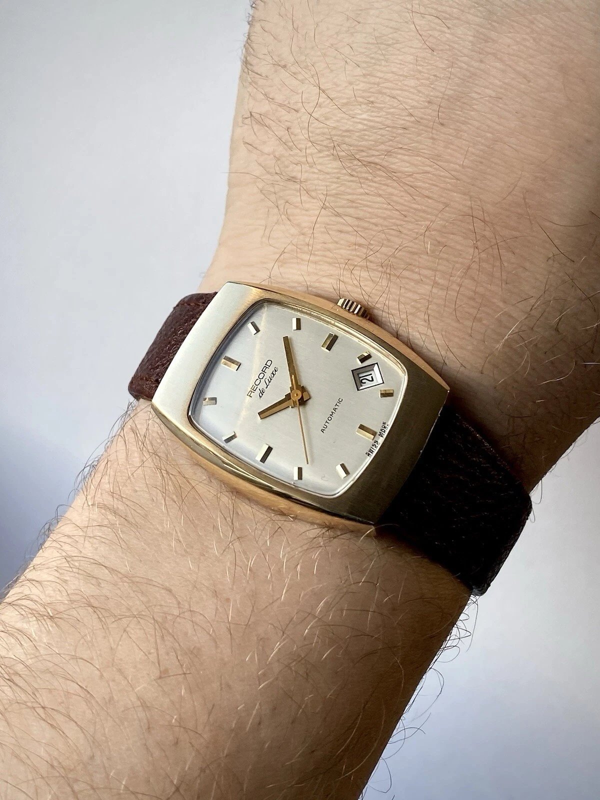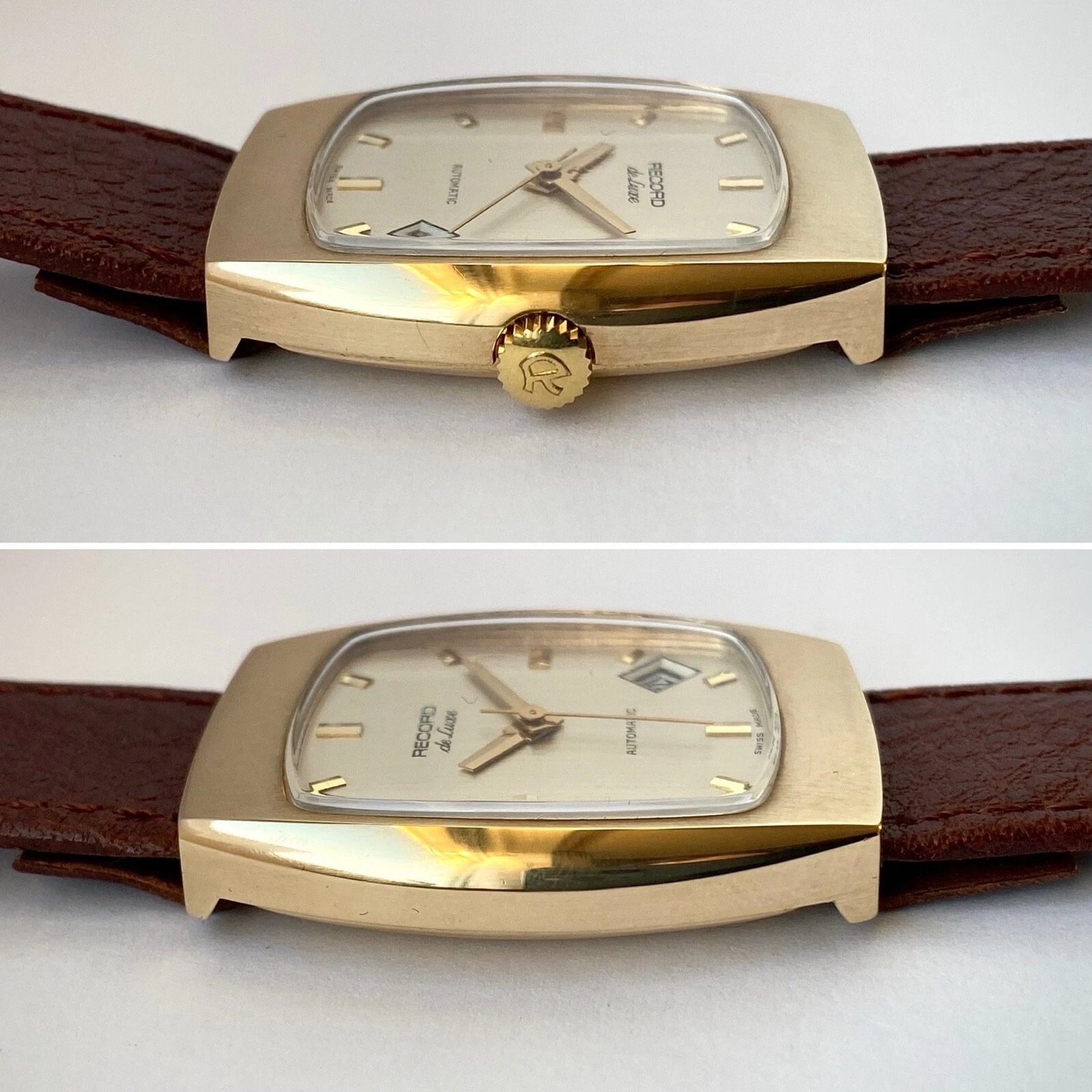 1972 Record De Luxe 9ct gold tonneau case watch, automatic date, ETA 2622