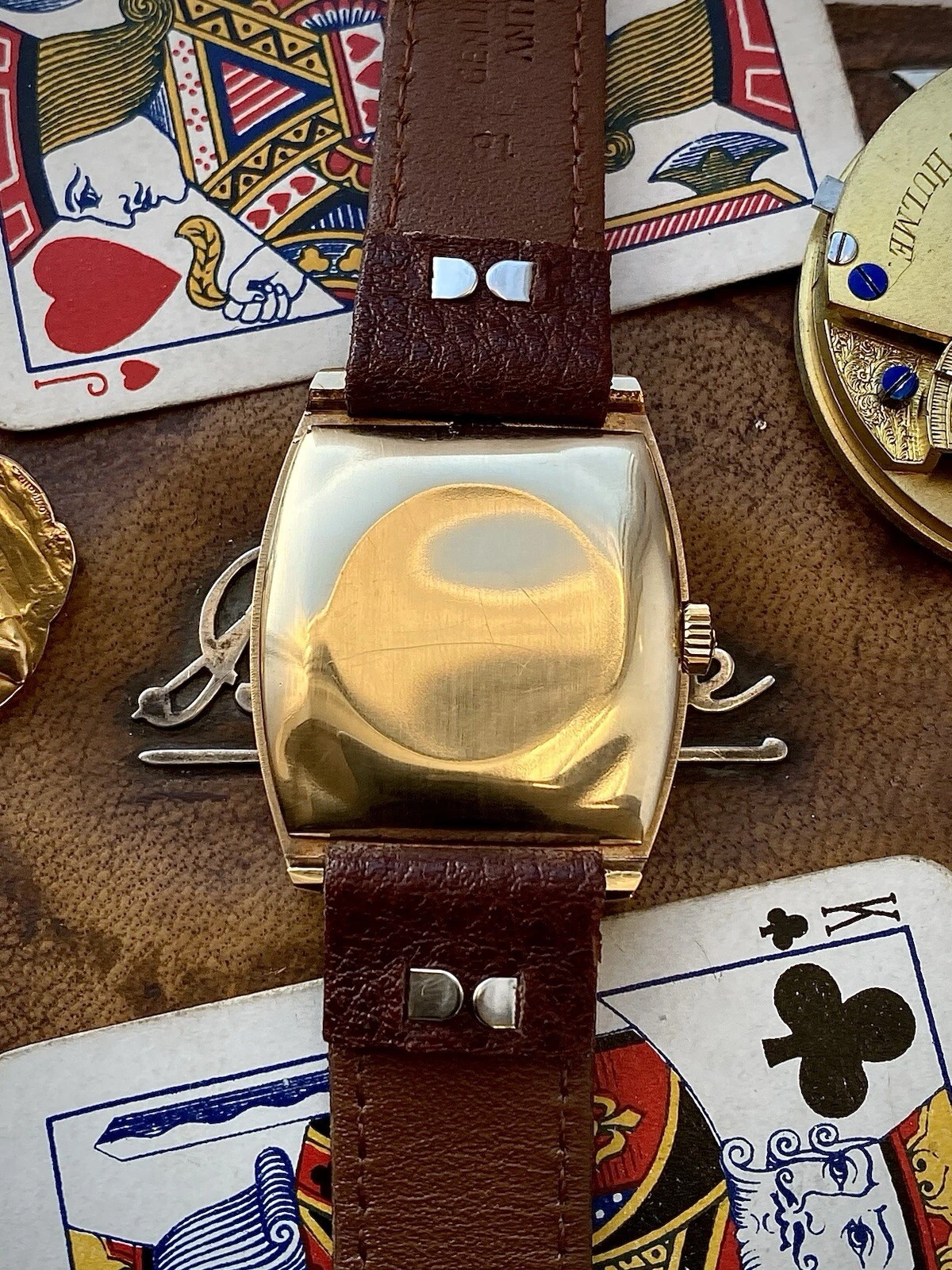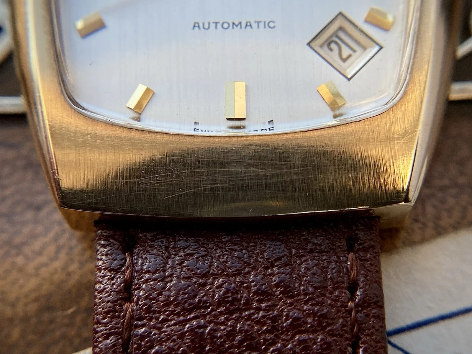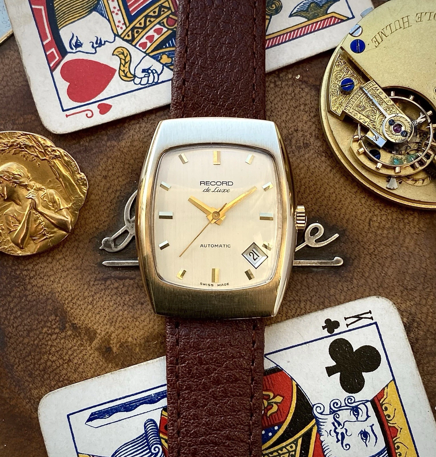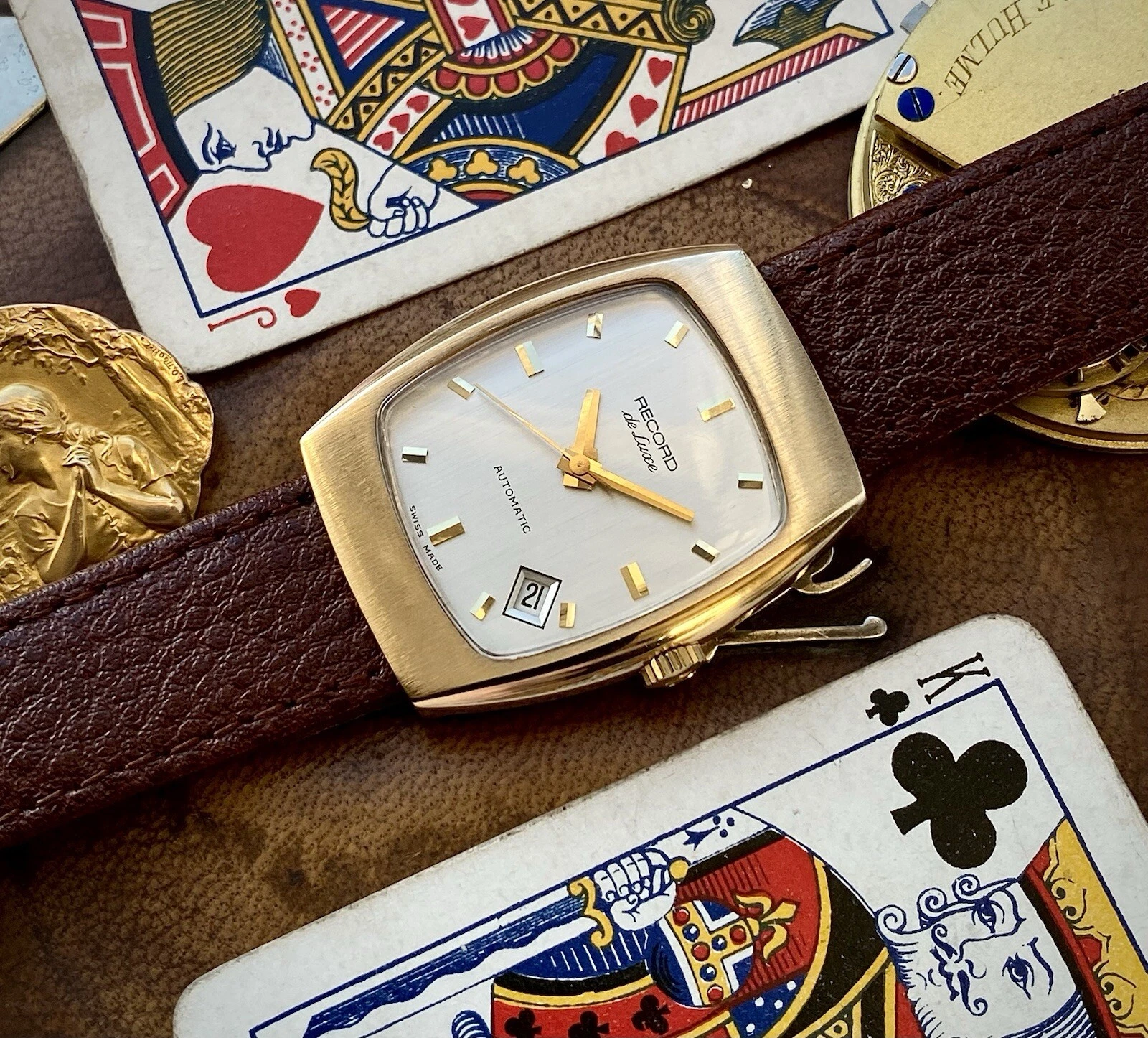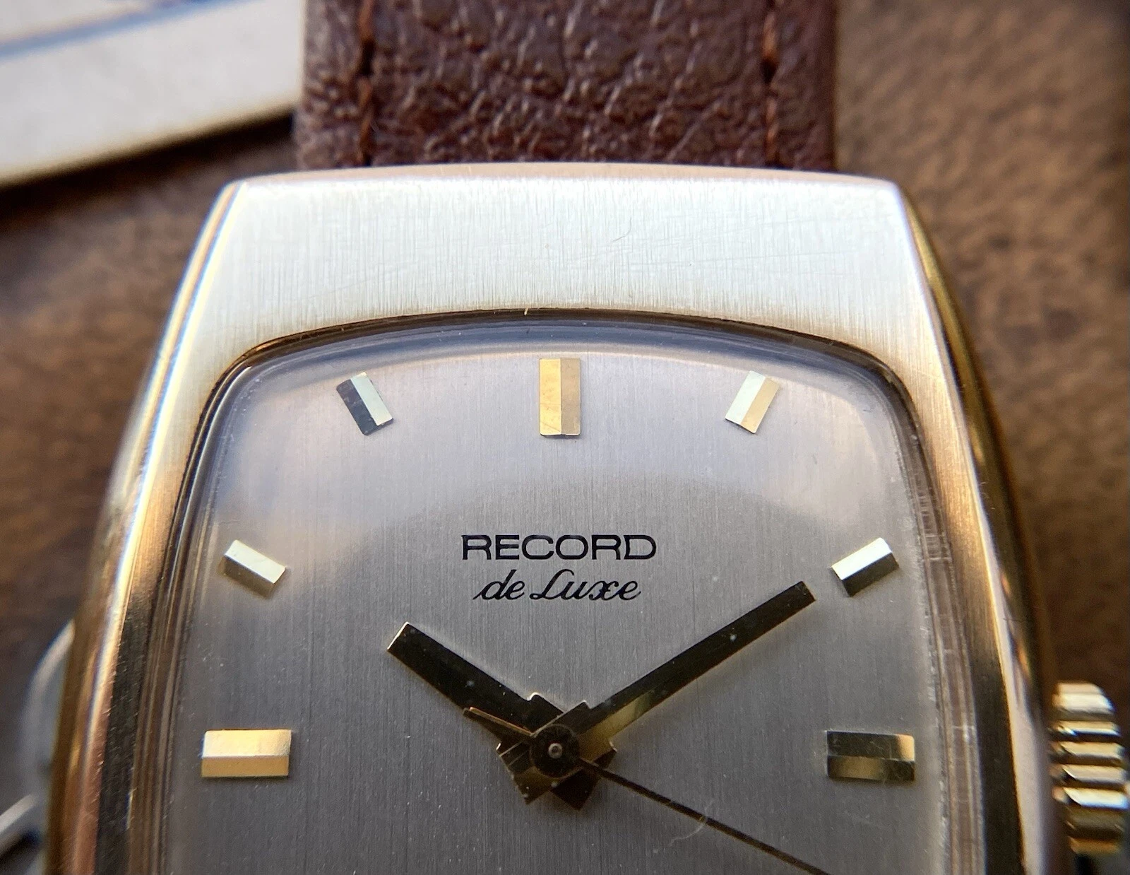1972 Record De Luxe 9ct gold tonneau case watch, automatic date, ETA 2622