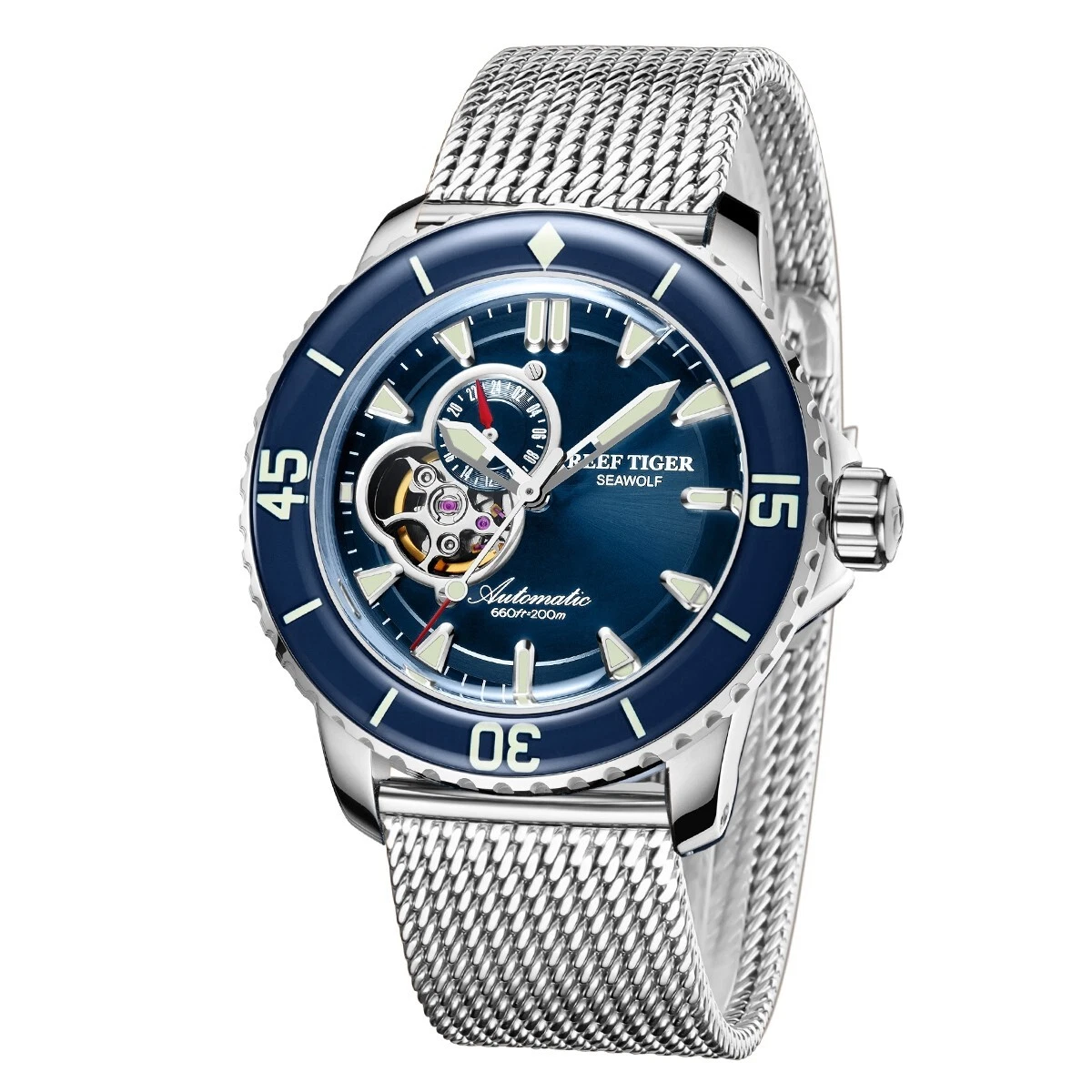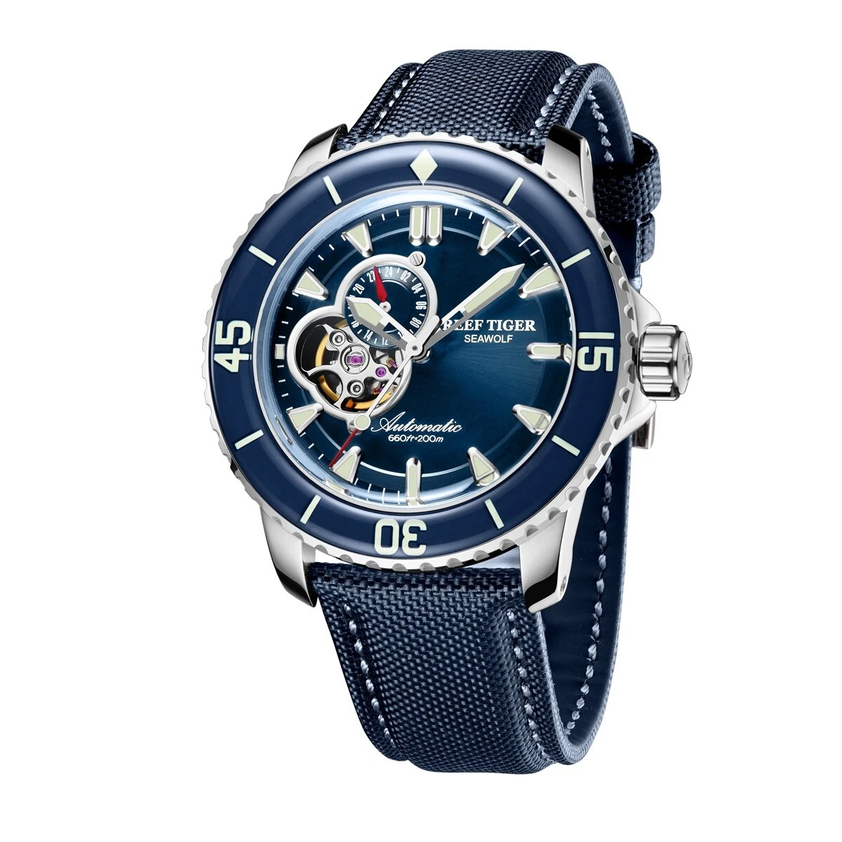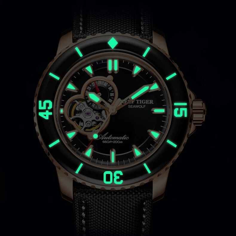 Reef Tiger Mens LuxuryWatches Skeleton Automatic Wristwatch 20Bar Sapphire Bezel